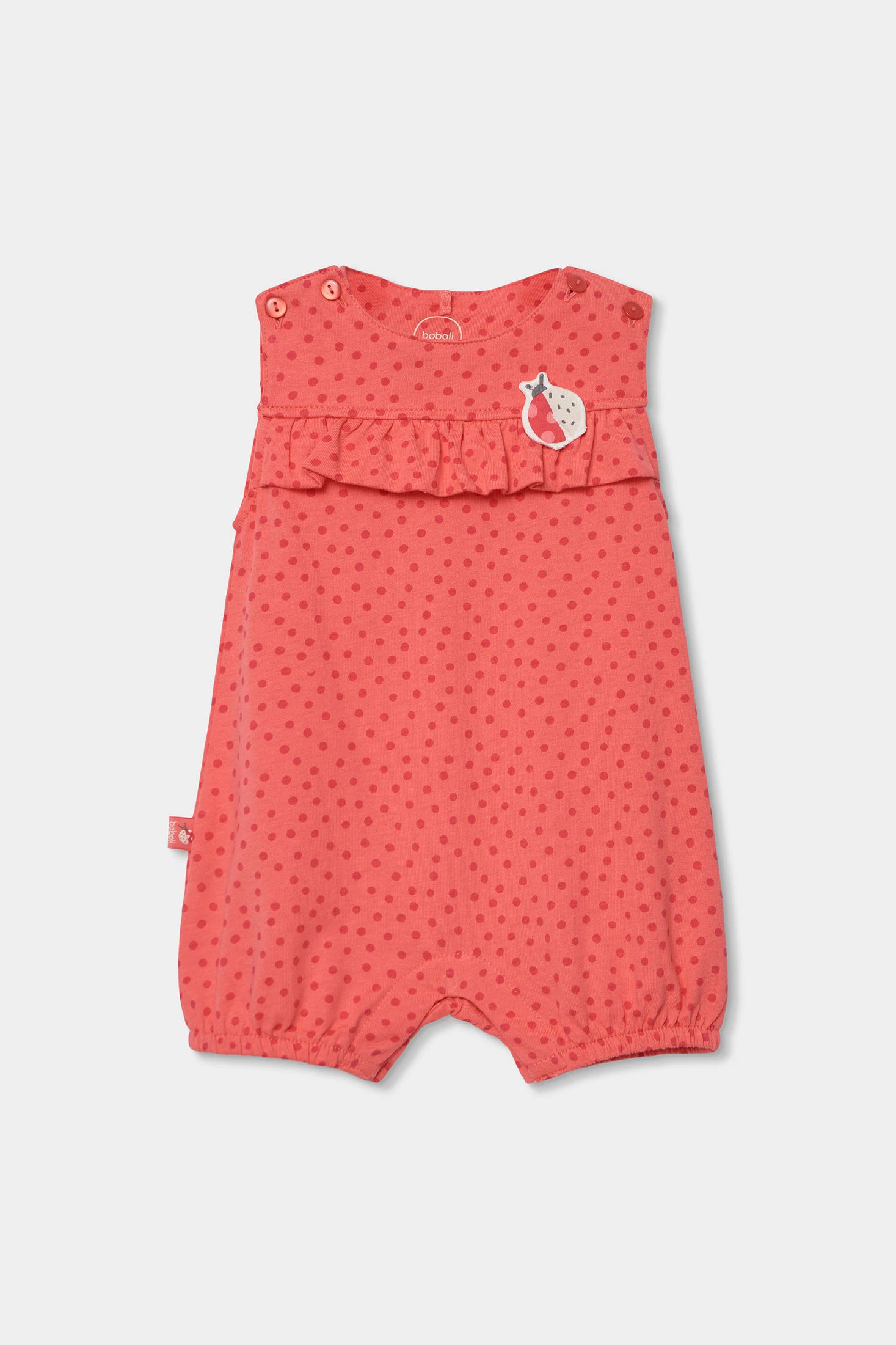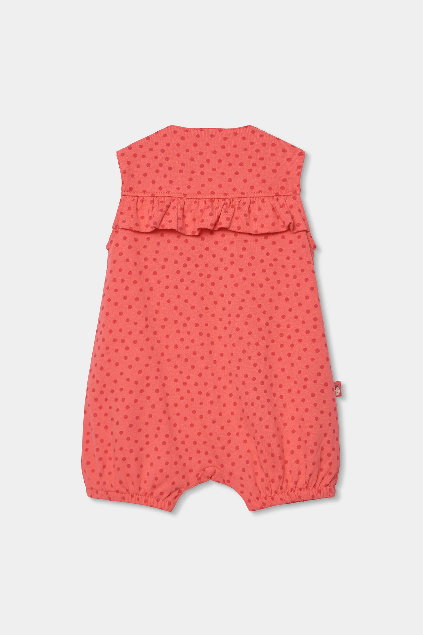 Pelele de algodón para bebé niña que presenta un alegre diseño en color rojizo con estampado de topos. El material es suave y cómodo, ideal para la delicada piel del bebé. Incluye un volante decorativo en el pecho y un pequeño motivo decorativo de mariquita en el lateral. Funcional con broches en los hombros, facilitando el cambio. Disponible en tallas de los 0 mese,s hasta los 24 meses, adaptándose al crecimiento del bebé