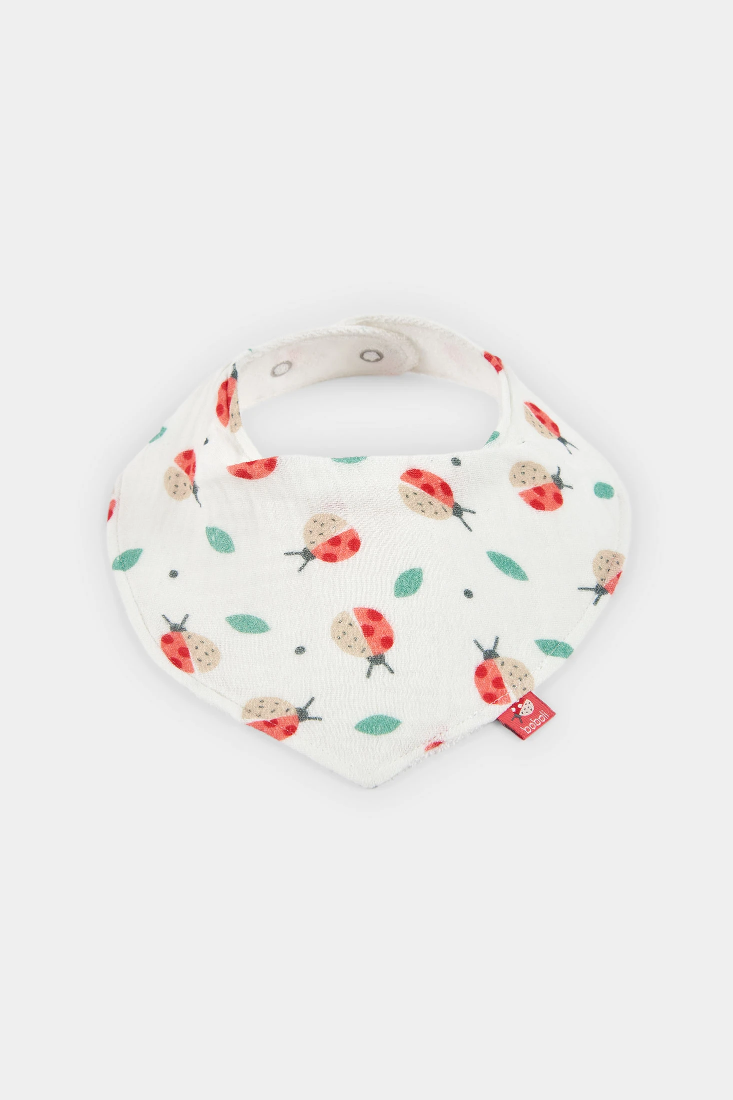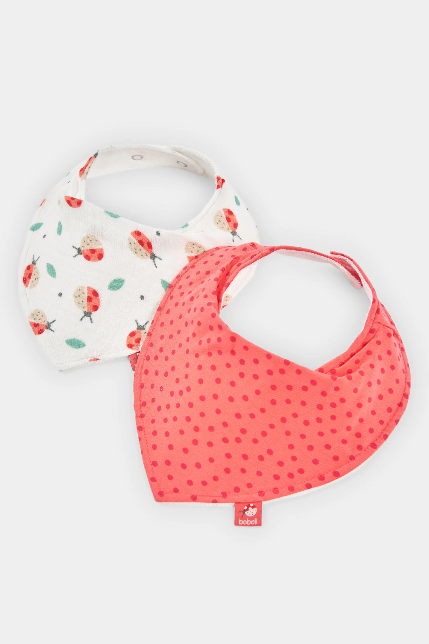 Pack de 2 pañuelos de bebé confeccionado en suave algodón, ideal para la delicada piel de los más pequeños. Uno presenta un estampado de lunares sobre fondo rojizo, mientras que el otro muestra dibujos de mariquitas y hojas en tonos beige y verdes. Estos accesorios protegen la ropa del bebé y complementan cualquier conjunto con estilo. Su cierre ajustable los hace prácticos y cómodos, ideales para el día a día. Són talla única.