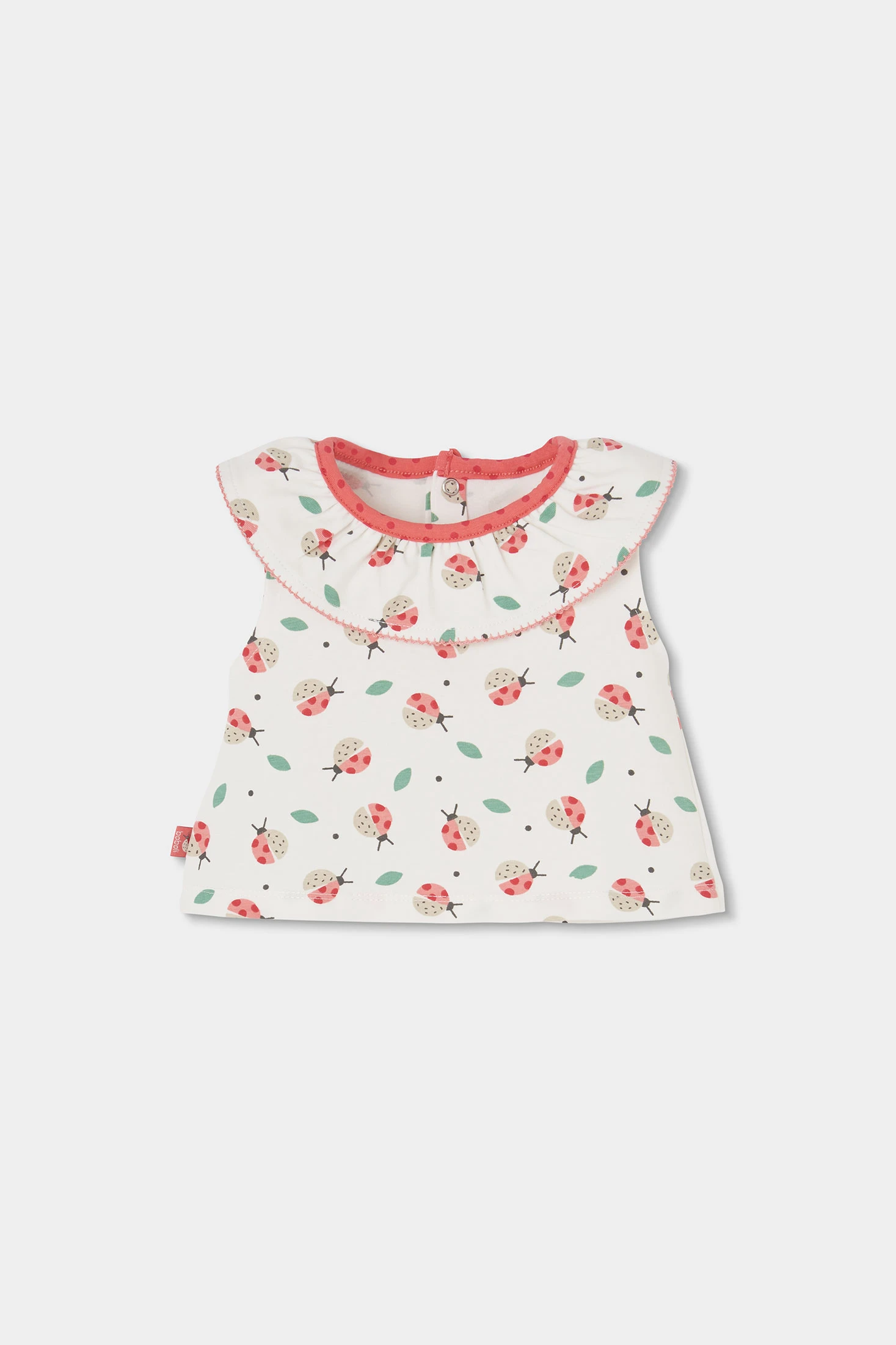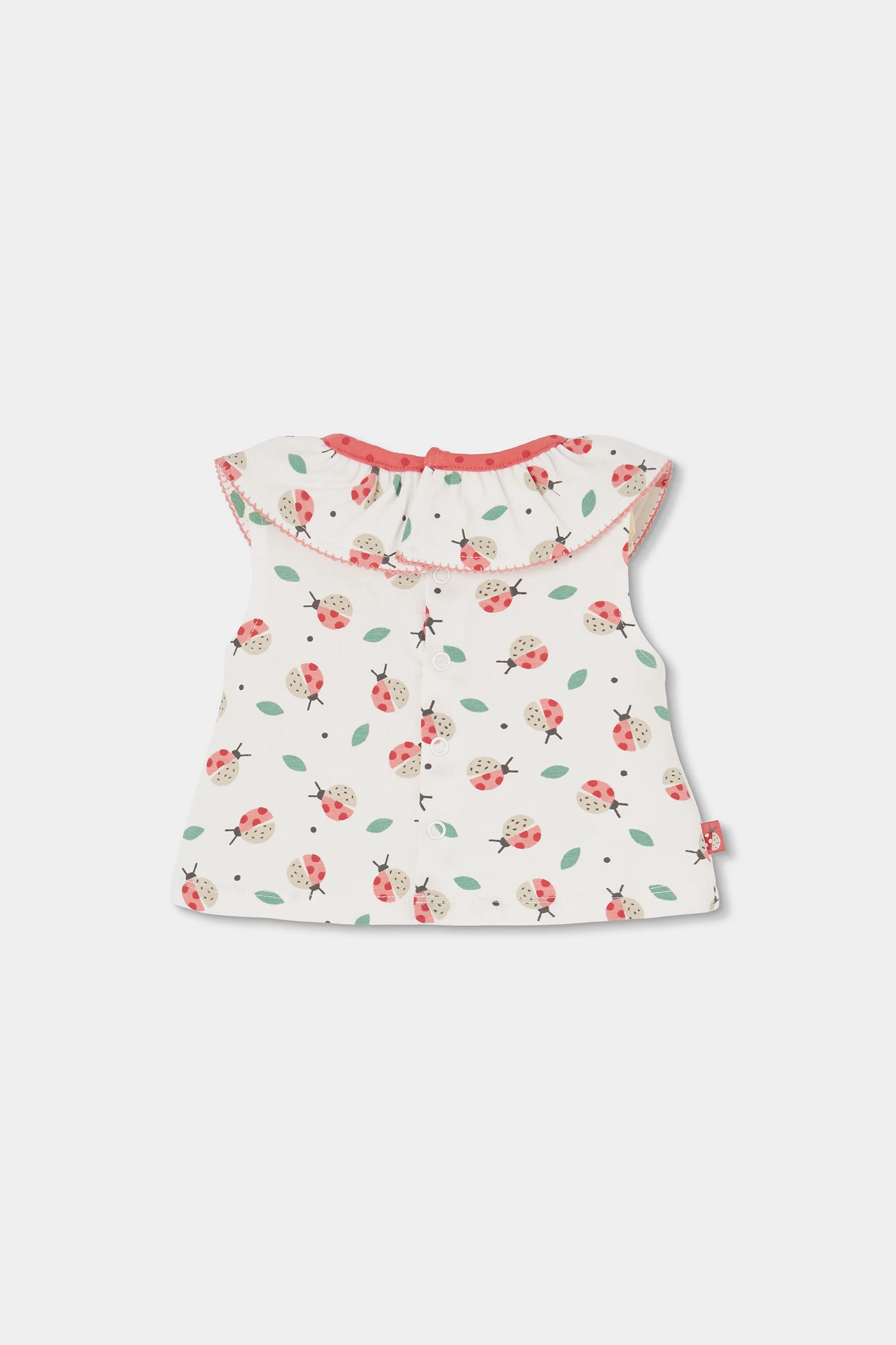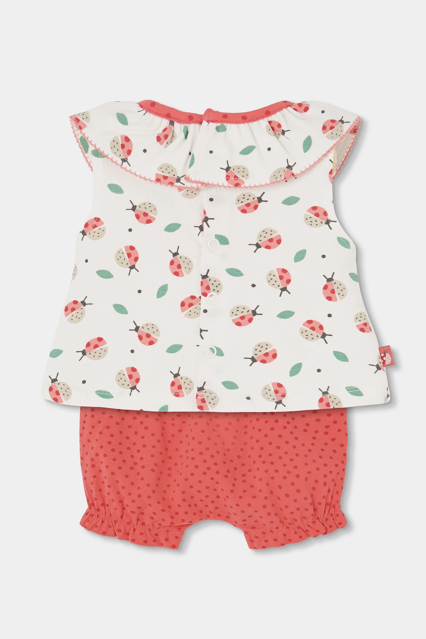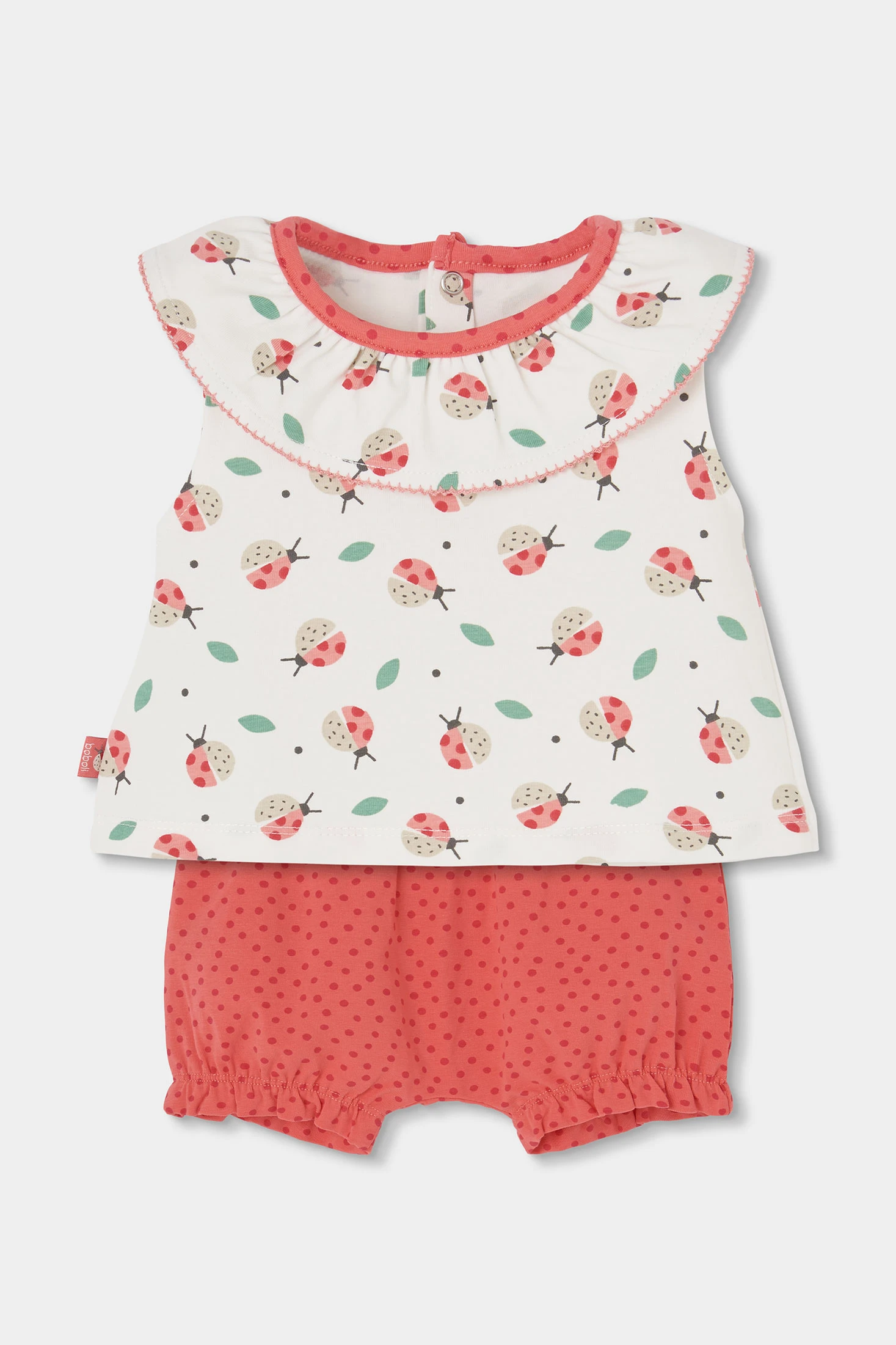 Conjunto de algodón elástico para bebé niña, ideal para las más pequeñas. Disponible en tallas desde 1 mes hasta 24 meses. . El conjunto incluye una blusa de cuello redondo con volantes, con un estampado de simpáticas mariquitas y hojas, brindando un toque divertido. El pantalon es corto con un diseño abombachado y goma en cinturilla y camales para un ajuste perfecto. Es de color rojizo con un estampado de topos y un lazo decorativo en cintura.