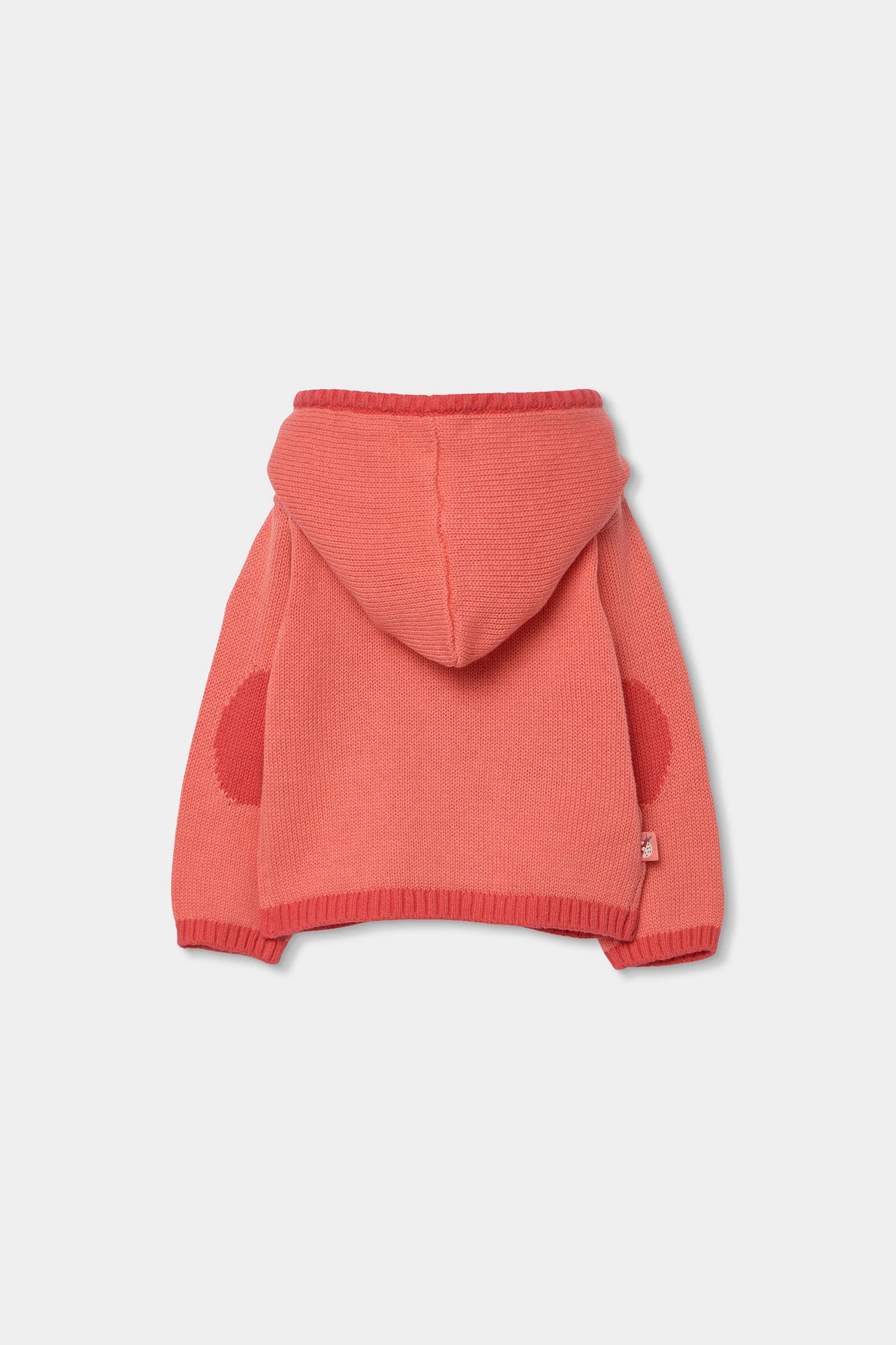 Chaqueta de punto para bebé niña ideal para mantener a las más pequeñas abrigadas. Disponible en tallas desde 1 mes hasta 24 mese. Su diseño en color rojo presenta un acabado suave y confortable, con un gorro desmontable por medio de botones y canalé en puños, bajo y cierre central de cremallera a contraste. Cuenta con unos bolsillos en forma de mariquita dando un toque divertido al look. Perfecta para combinar con pantalones o vestidos, esta prenda es versátil y práctica para el día a día.