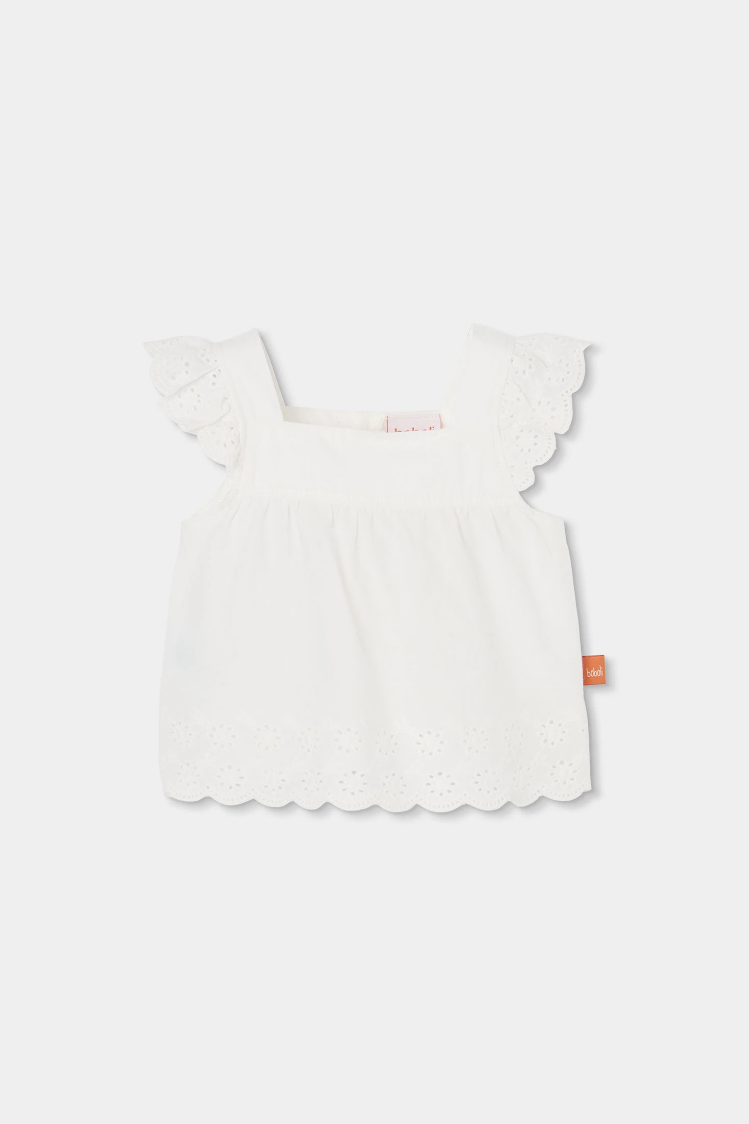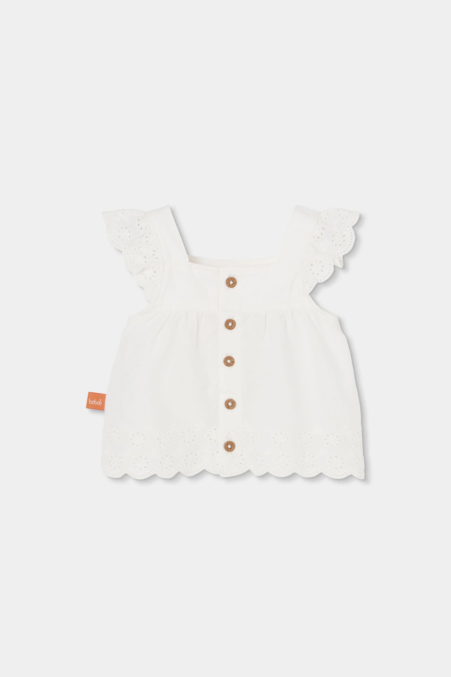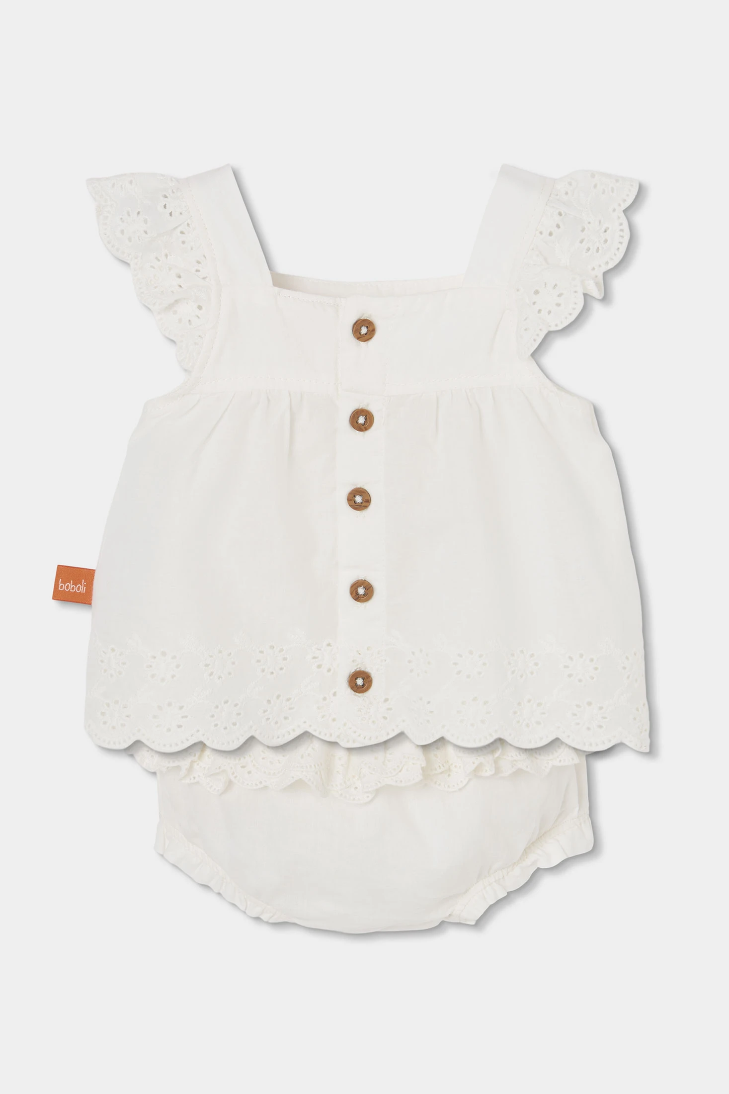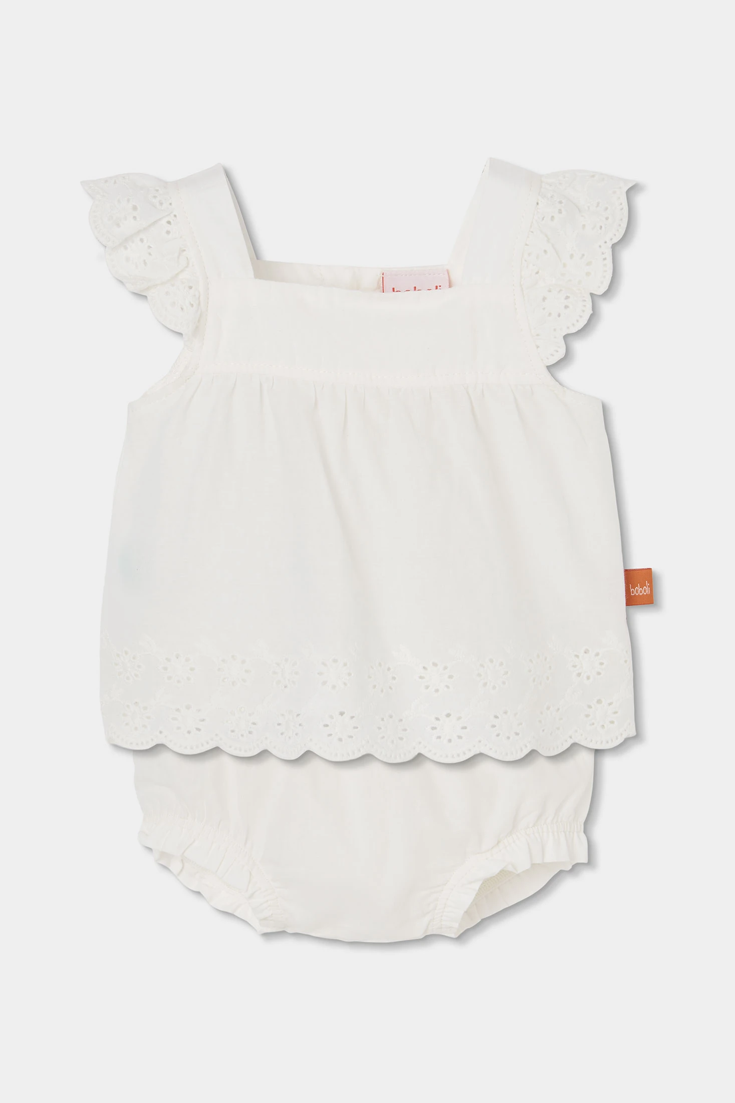 Conjunto de batista blanca para bebé niña, perfecto para mantener a tu pequeño cómodo y a la moda. Incluye un diseño con detalles de bordado en el borde tanto en el top sin mangas como en los volantes de los hombros, ofreciendo un acabado elegante. Disponible en tallas desde 1 mes hasta 24 meses. Su diseño aireado es ideal para los meses más cálidos, permitiendo movimiento libre y frescura. Una elección adorable y práctica para cualquier guardarropa de bebé.
