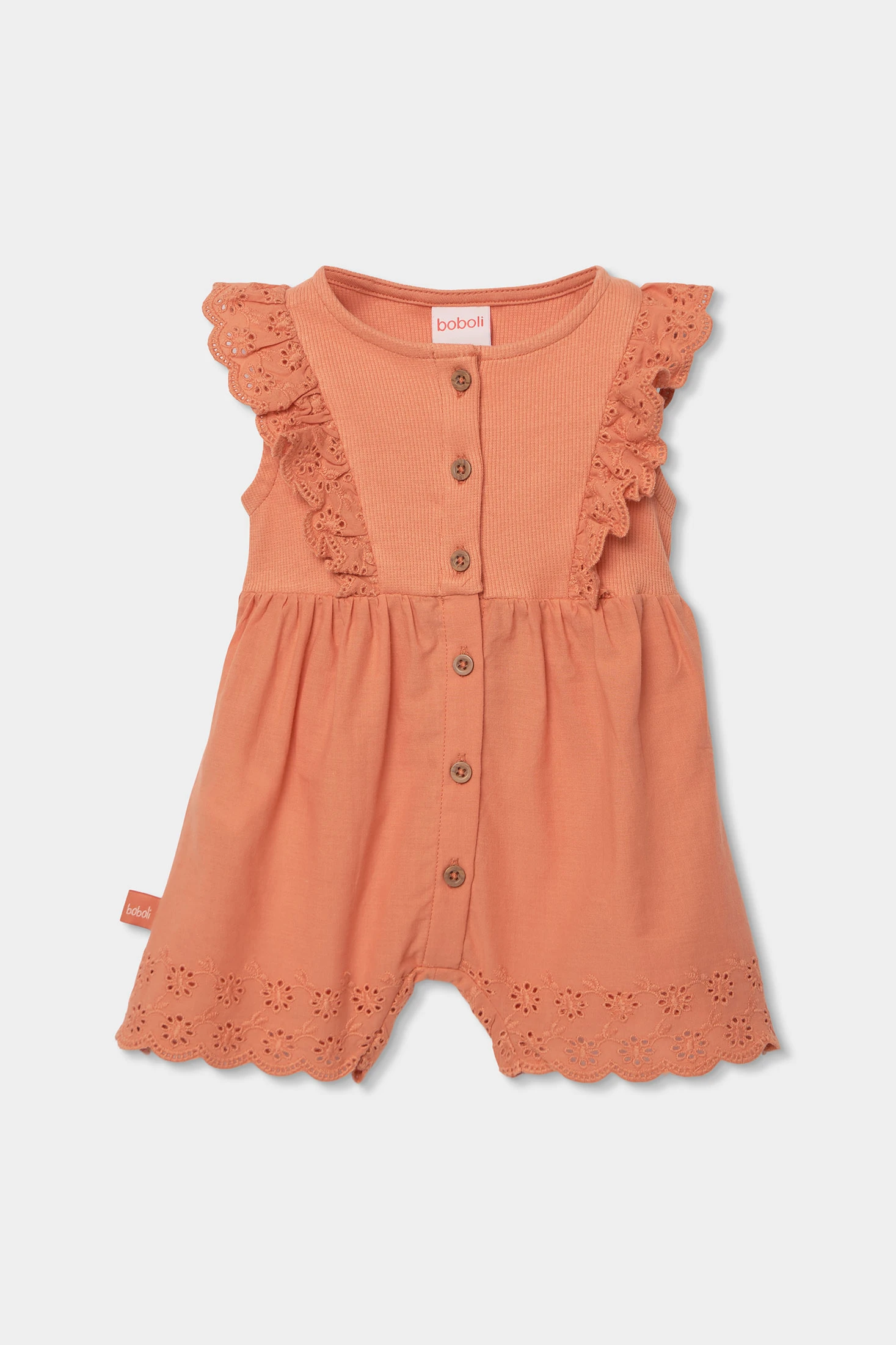 Mono bordado que combina dos tejidos en color anaranjado, perfecto para recién nacidos, con tallas desde 1 mes hasta 24 meses. Su diseño incluye delicados bordados en los volantes y el borde inferior, proporcionando un estilo elegante. El tejido es suave y cómodo, ideal para la piel sensible de los bebés. Los botones frontales facilitan el cambio de ropa. Su color cálido y diseño detallado lo hacen una opción dulce y práctica para cualquier ocasión.