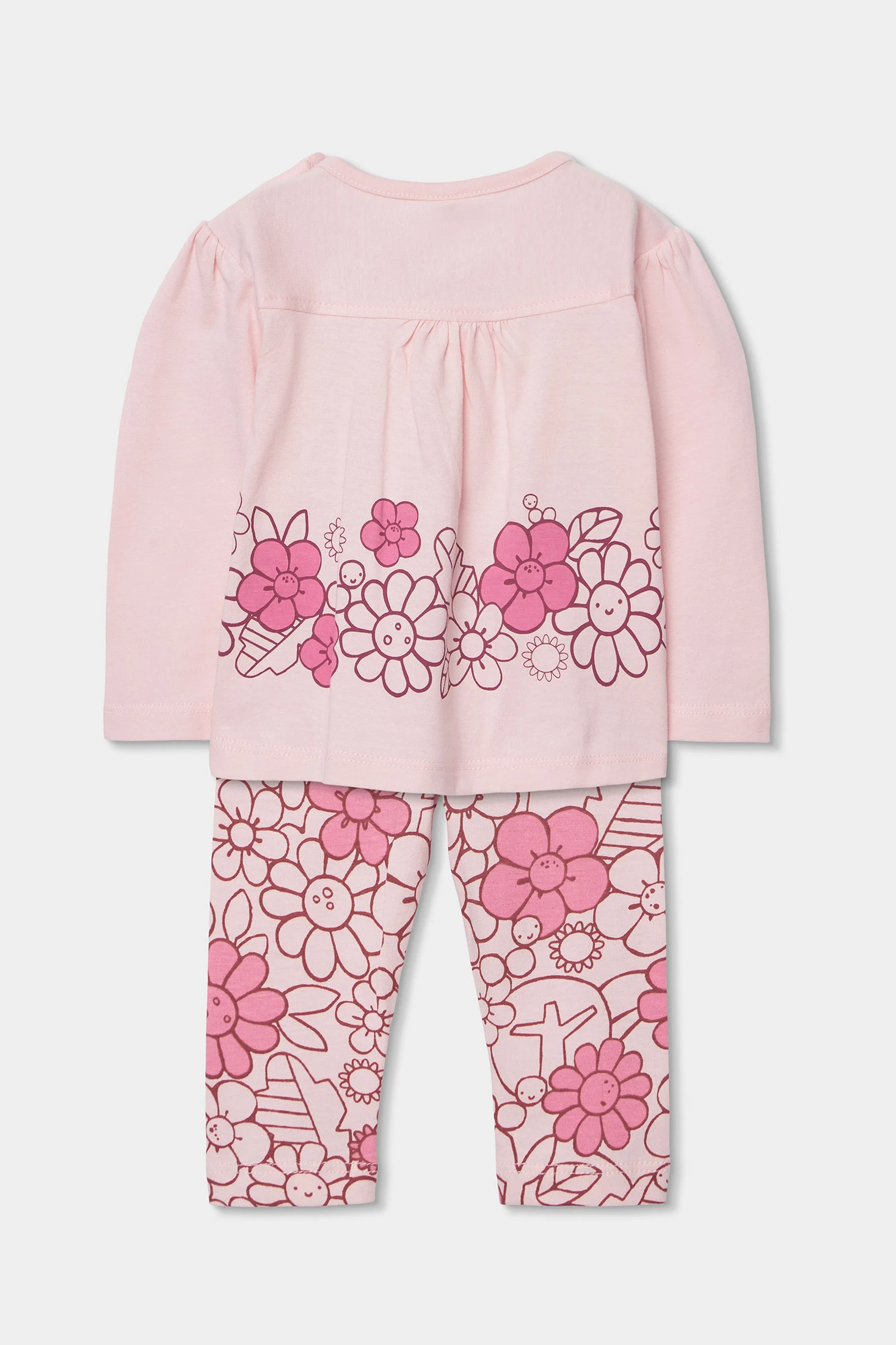 Conjunto de punto de algodón en color rosa para niña, ideal para recién nacidas. Presenta un diseño de estampado floral en tonos rosados, proporcionando un toque dulce y estilizado. Su tejido es suave y cómodo, perfecto para la delicada piel del bebé. Ideal para edades desde 1 mes hasta 24 meses. Las mangas largas son perfectas para los días más frescos, siendo una opción versátil para el día a día.