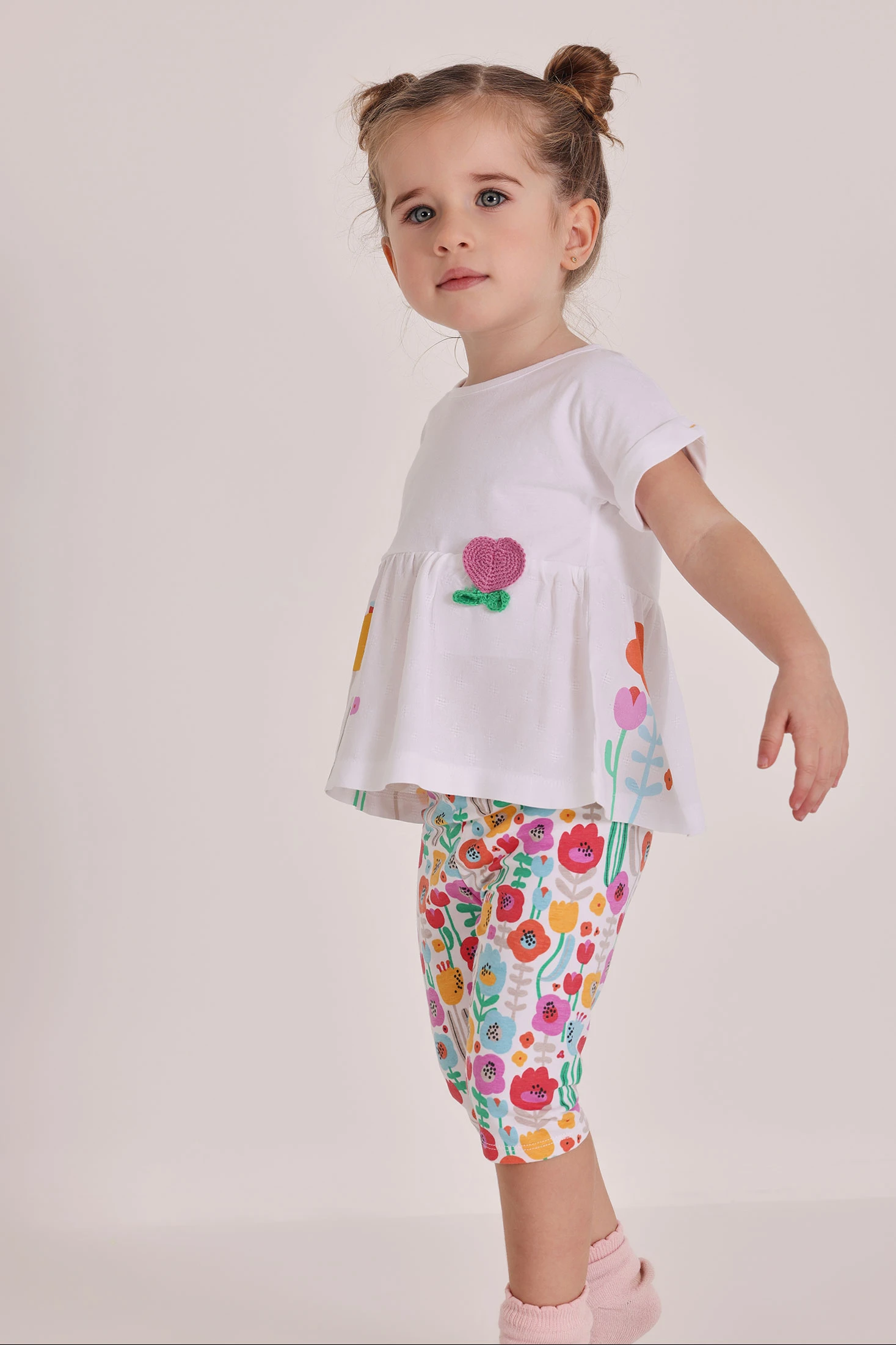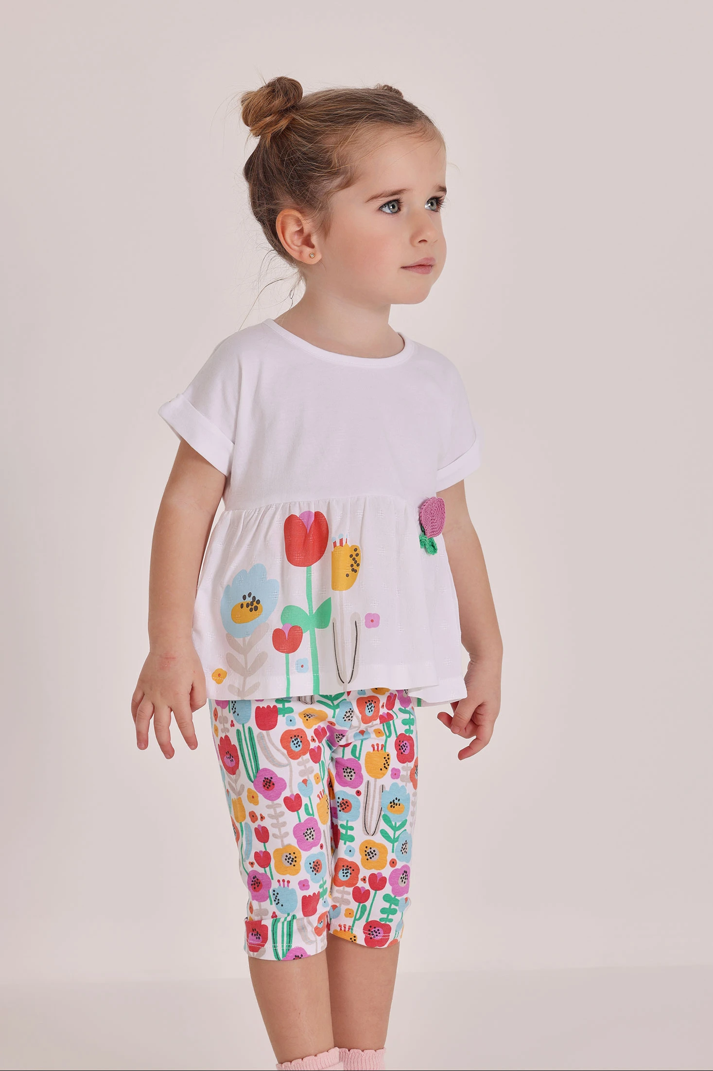 Conjunto de algodón para bebé, perfecto para recién nacidos. Disponible en tallas desde 1 hasta 24 meses, garantiza comodidad y estilo. El diseño presenta una camiseta blanca que combina dos tejidos, con un estampado de flores y bordado en diferentes tonos dando un toque alegre. Las mangas cortas y el tejido suave aseguran frescura y movilidad. Los pantalones de algodón elástico a juego, también tienen motivos florales, creando una apariencia coordinada y encantadora. Ideal para el día a día, este conjunto destaca por su practicidad y diseño divertido, siendo una opción excelente para vestir a tu bebé con estilo y confort.