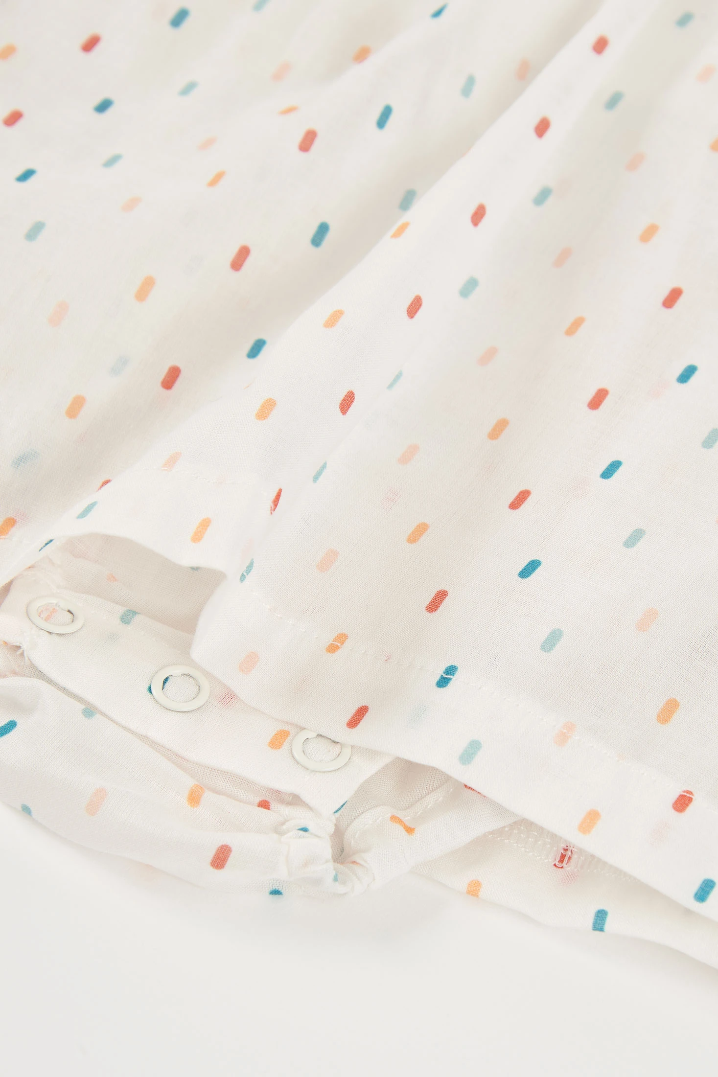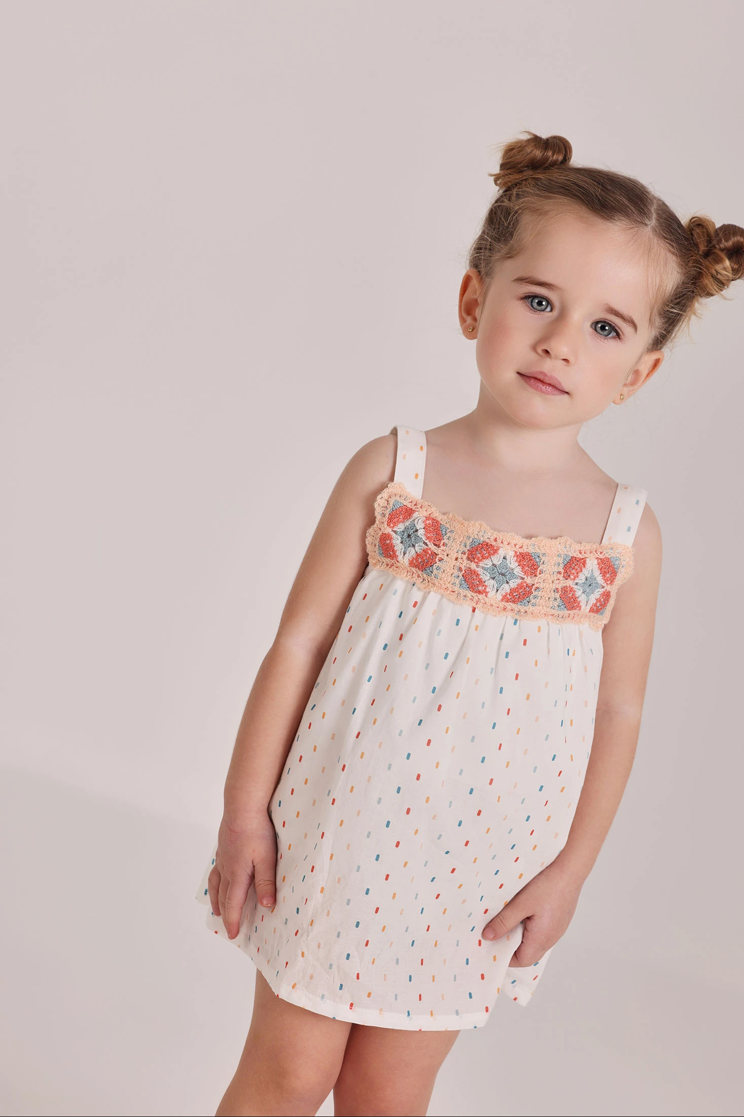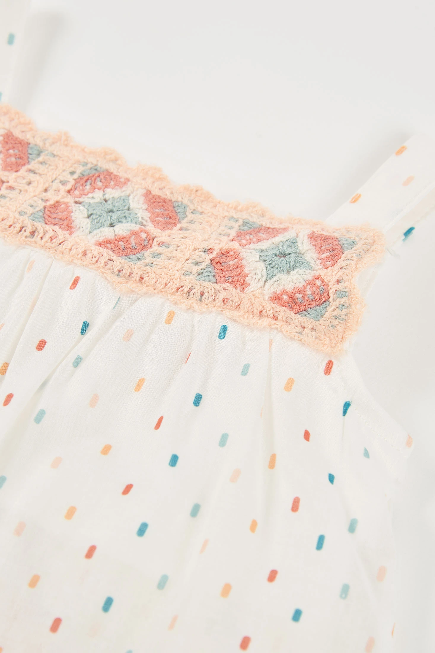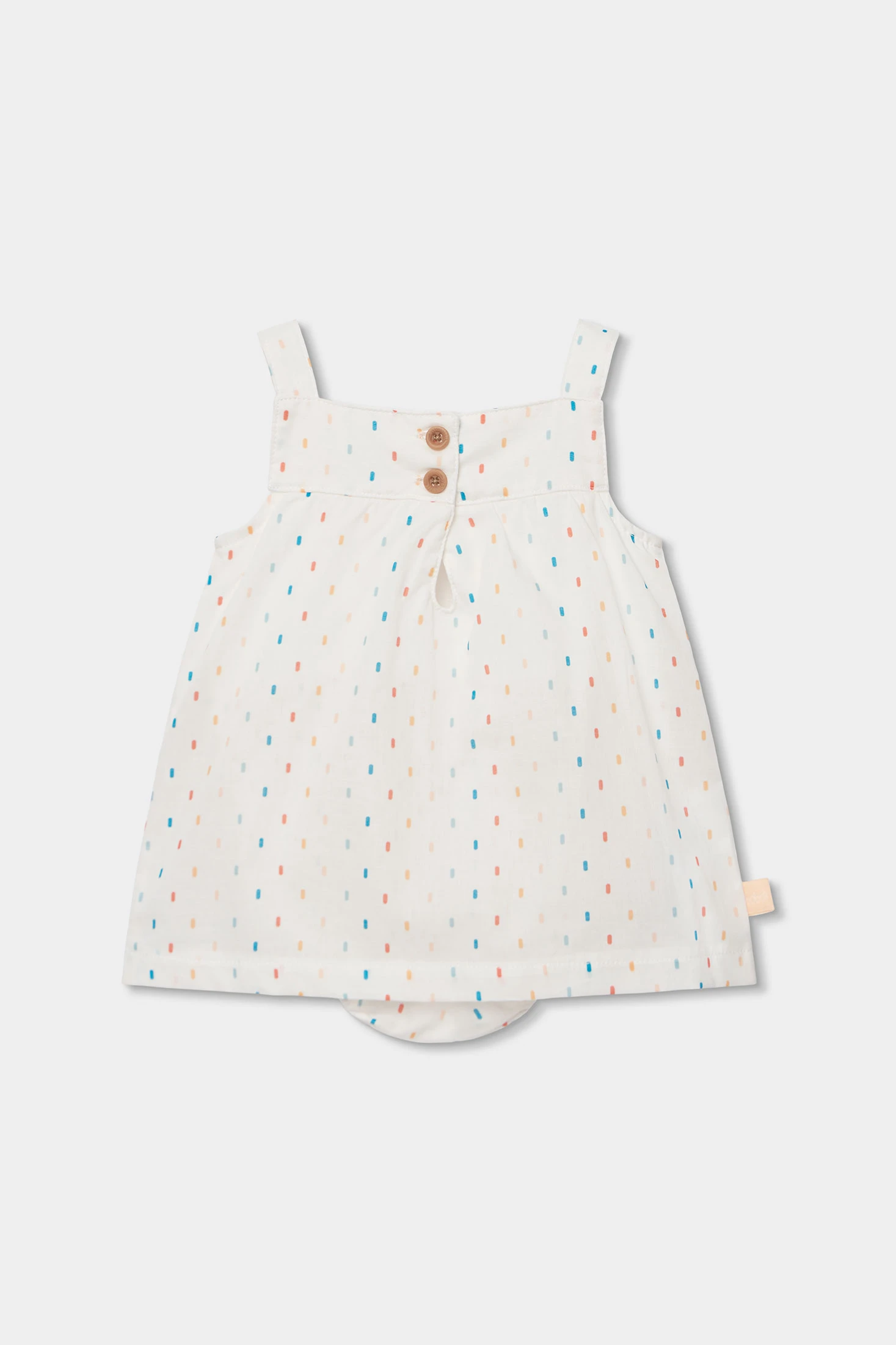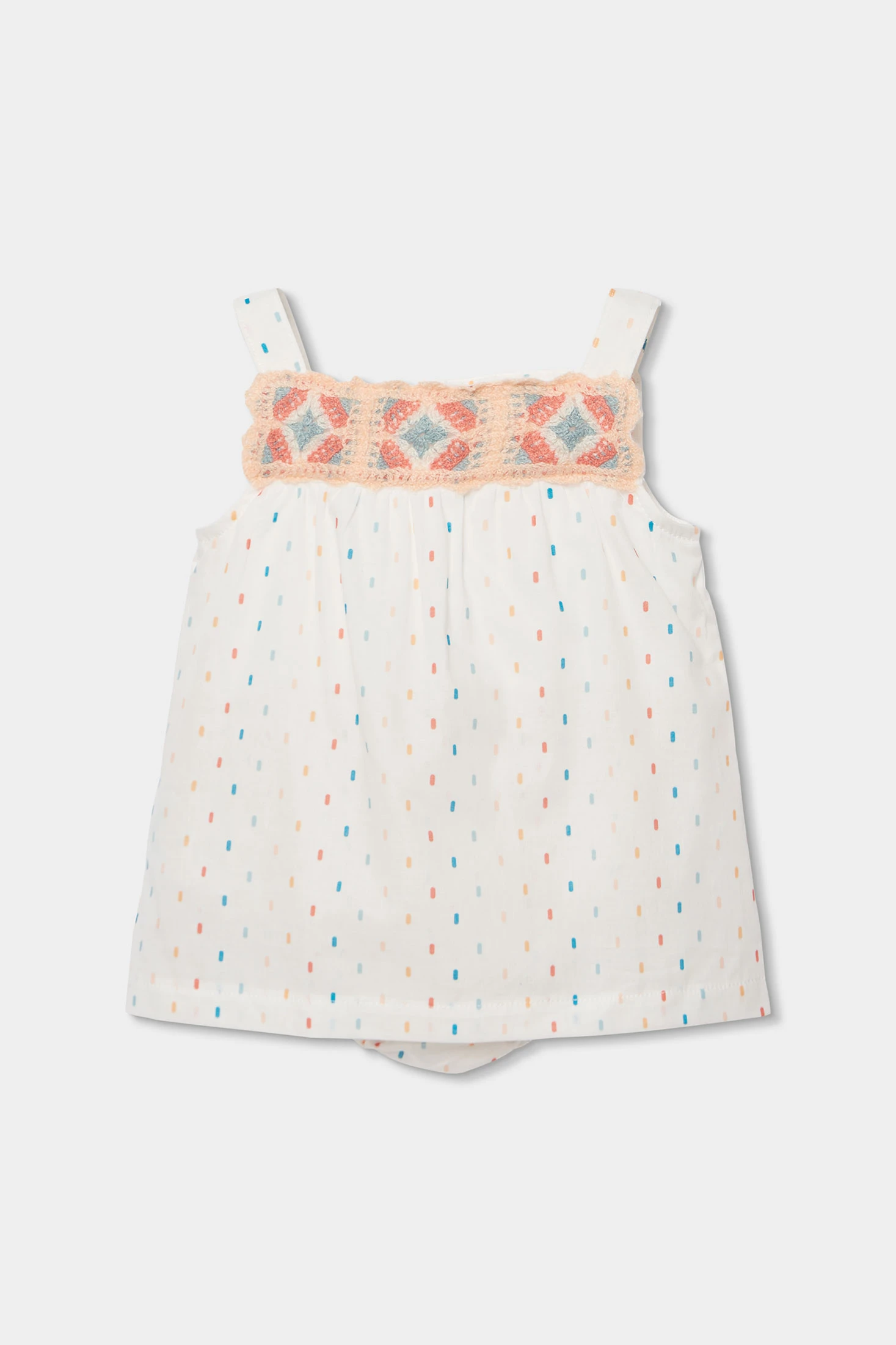 Vestido de bebé en tejido de algodón ideal para los más pequeños. Con un fondo blanco decorado con pequeños detalles de colores tejidos, combina delicadeza y estilo. El diseño incluye detalles de imitación crochet tejidos en el pecho que añaden un toque encantador. Confeccionado en un material suave y cómodo, perfecto para la piel del bebé. Disponible en tallas desde 1 mes hasta 24 meses. Su diseño fresco y ligero lo hace ideal para usar en ocasiones especiales o días soleados. Una elección perfecta para mantener a tu bebé elegante y cómodo.
