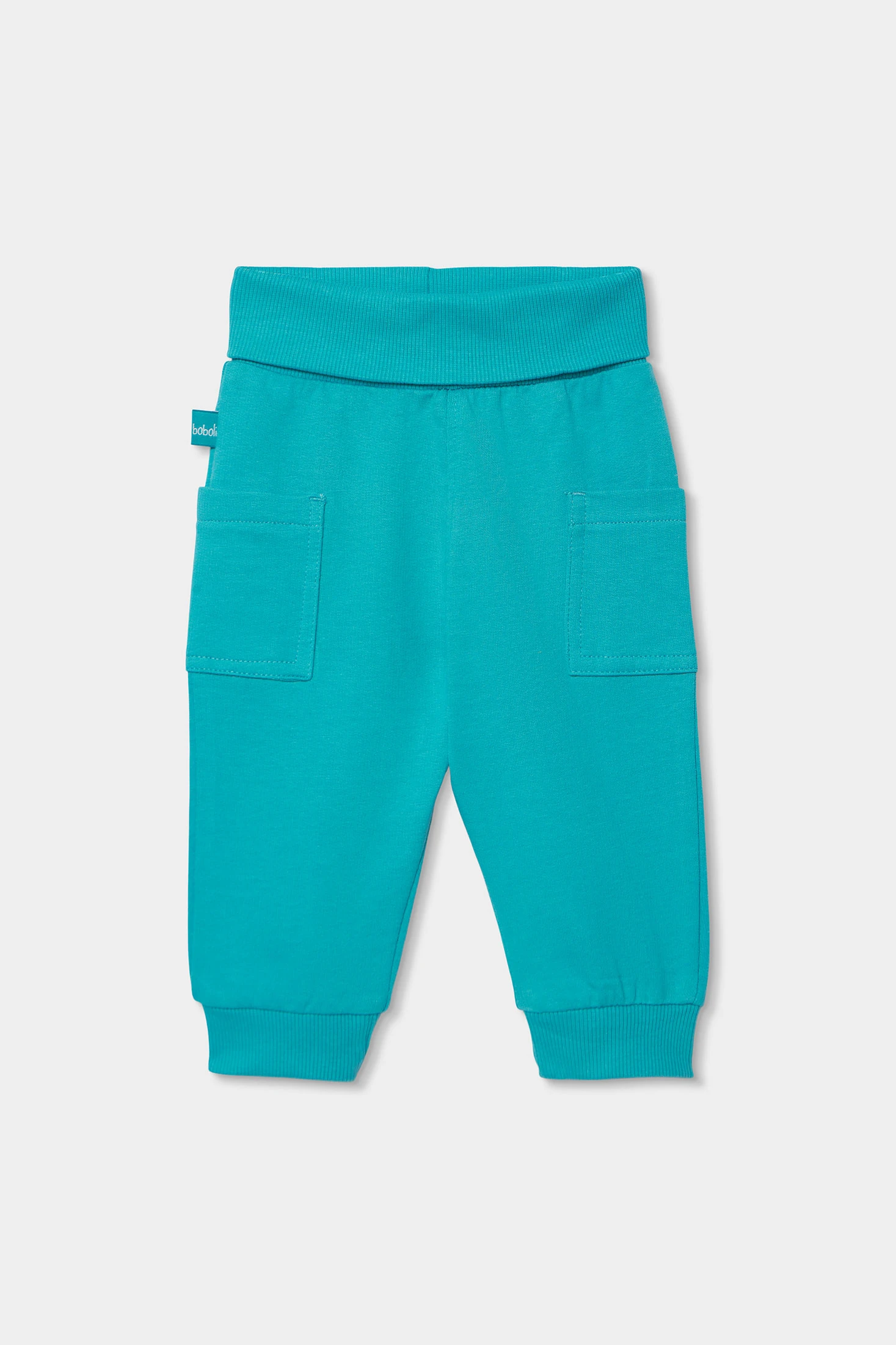 Pantalón en felpa de algodón azul turquesa para bebé, ideal para los más pequeños. Su diseño cómodo incluye dos bolsillos frontales y una cintura elástica que facilita el ajuste. Perfecto para bebés desde 1 mes, hasta 24 meses. El tejido suave proporciona confort en el uso diario, ideal para combinar con camisetas de colores neutros para un estilo casual y alegre.