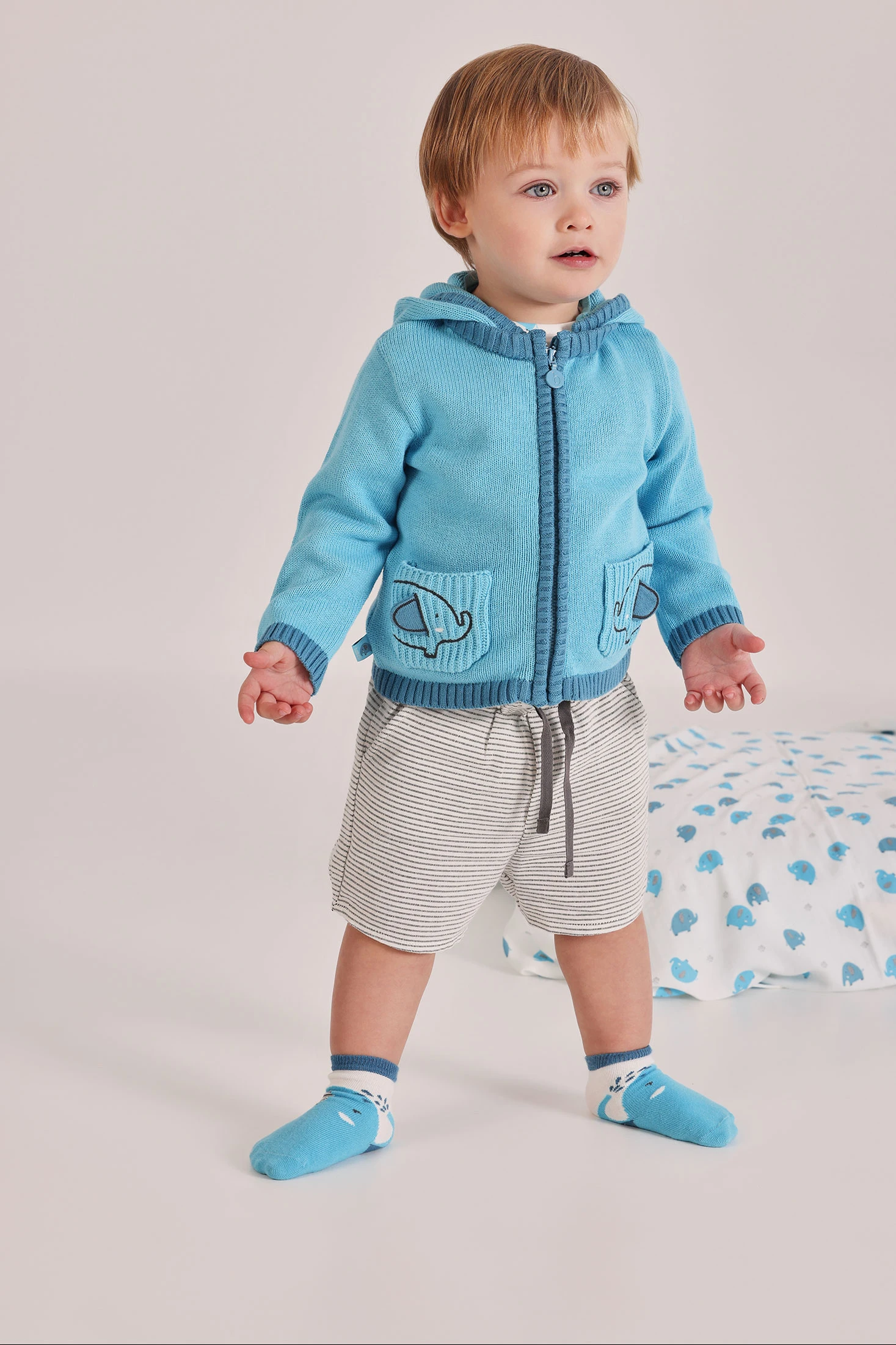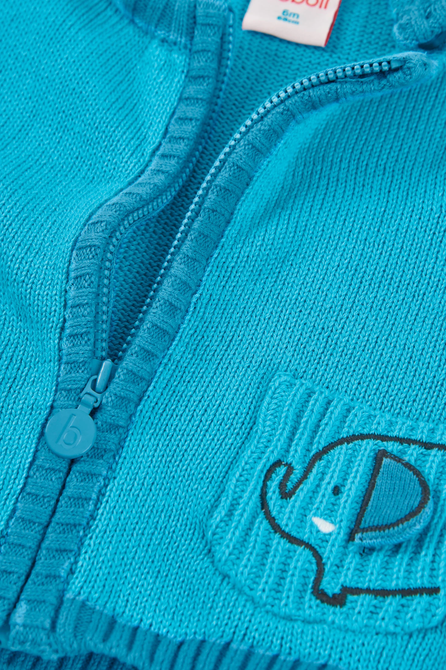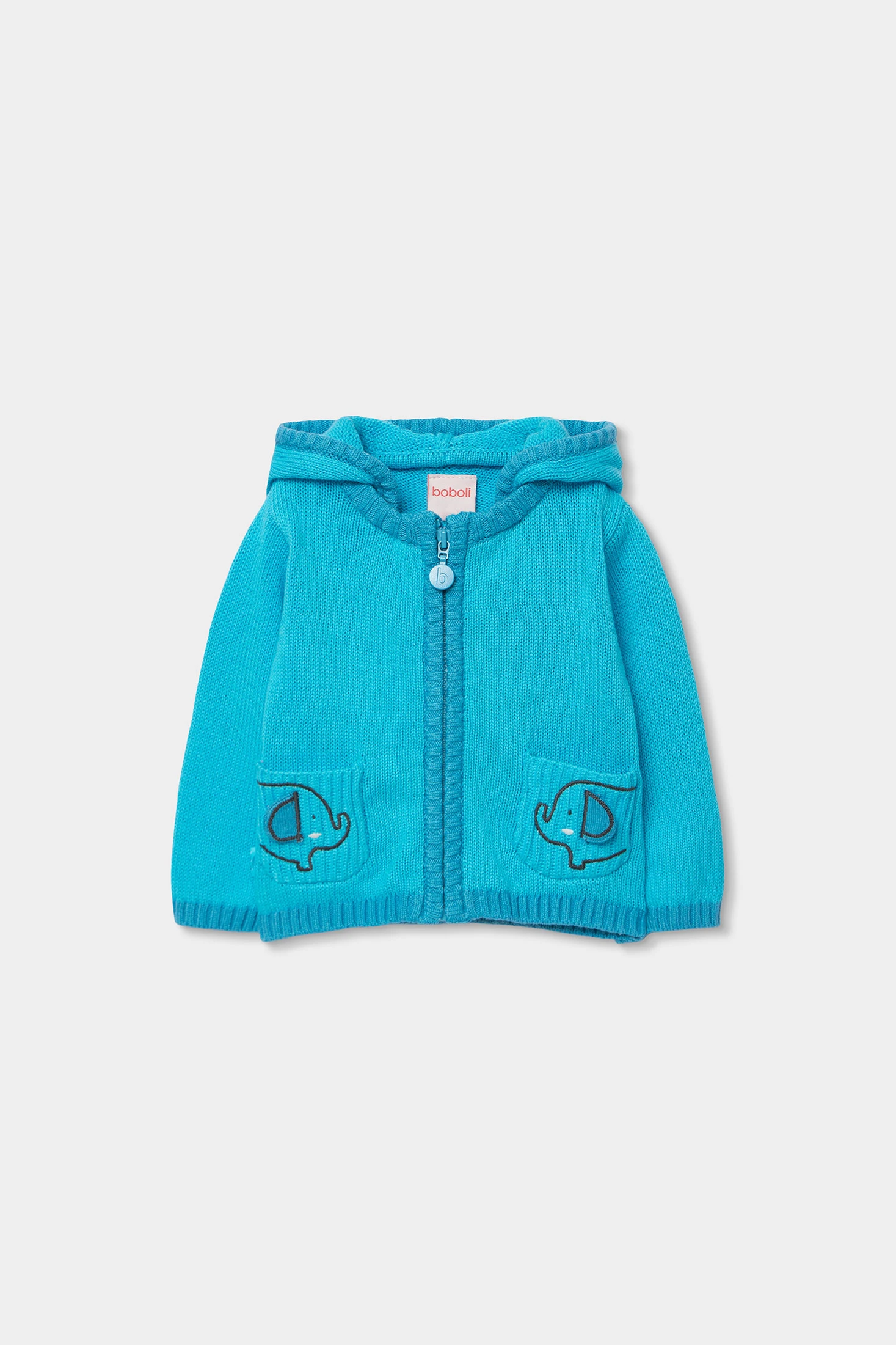Chaqueta de punto para bebé niño perfecta para mantener a tu pequeño abrigado en los meses más fríos. De color azul vibrante, presenta un diseño encantador con dibujos de animales en los bolsillos. La capucha añade una capa extra de protección contra el frío. Está confeccionada en un tejido de punto suave y cálido. Disponible en tallas desde 1 mes hasta 24 meses, se adapta al crecimiento de tu bebé. Ideal para combinar con pantalones o leggings, aportando un toque dulce y acogedor a cualquier conjunto.