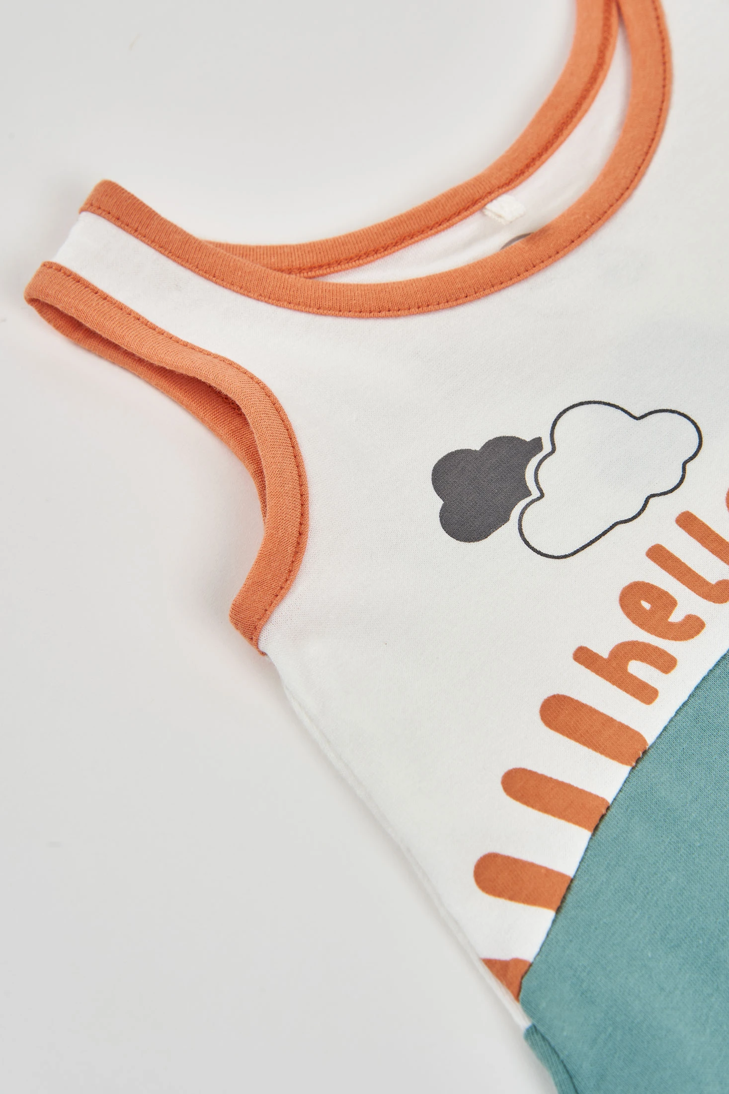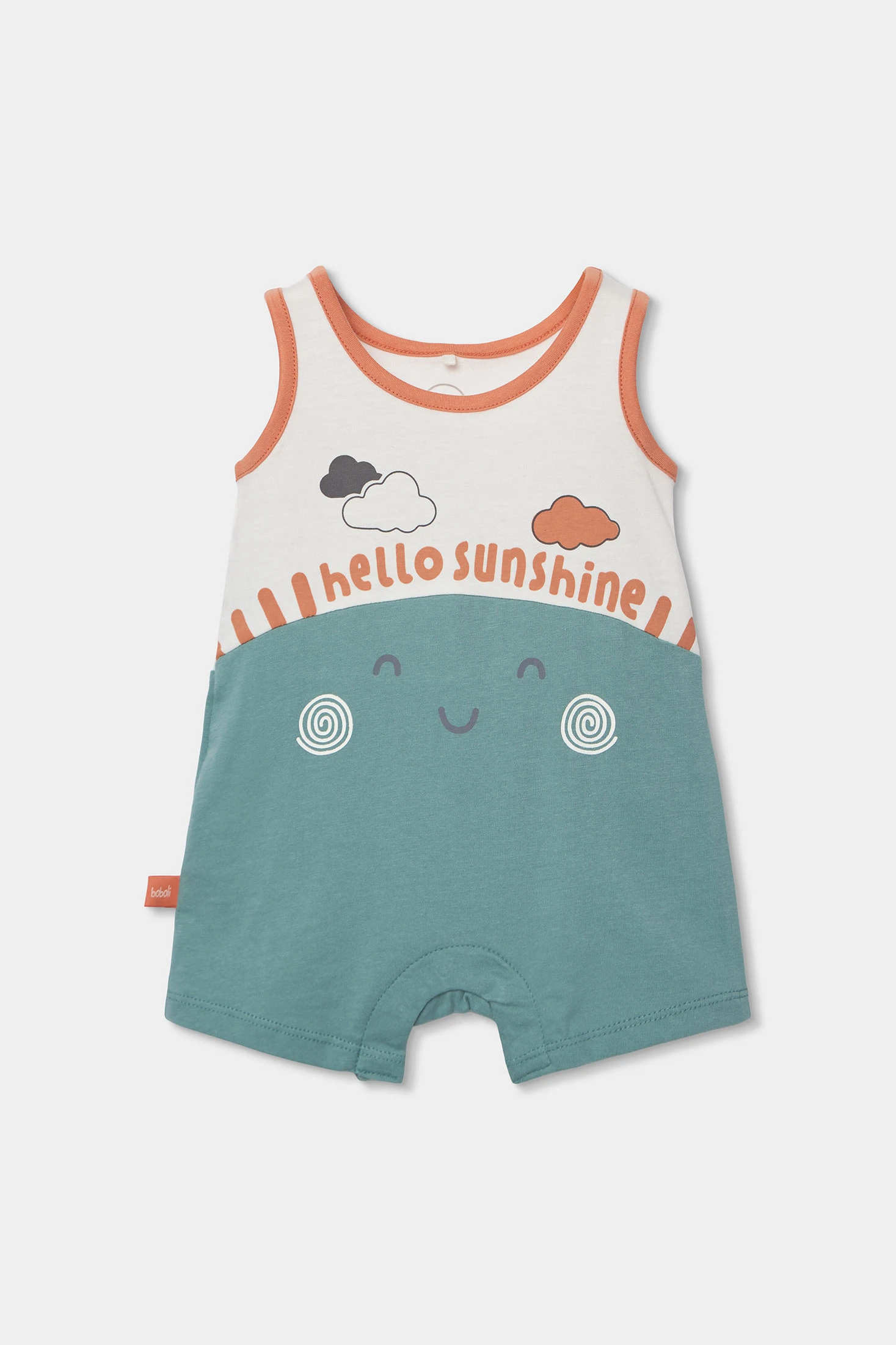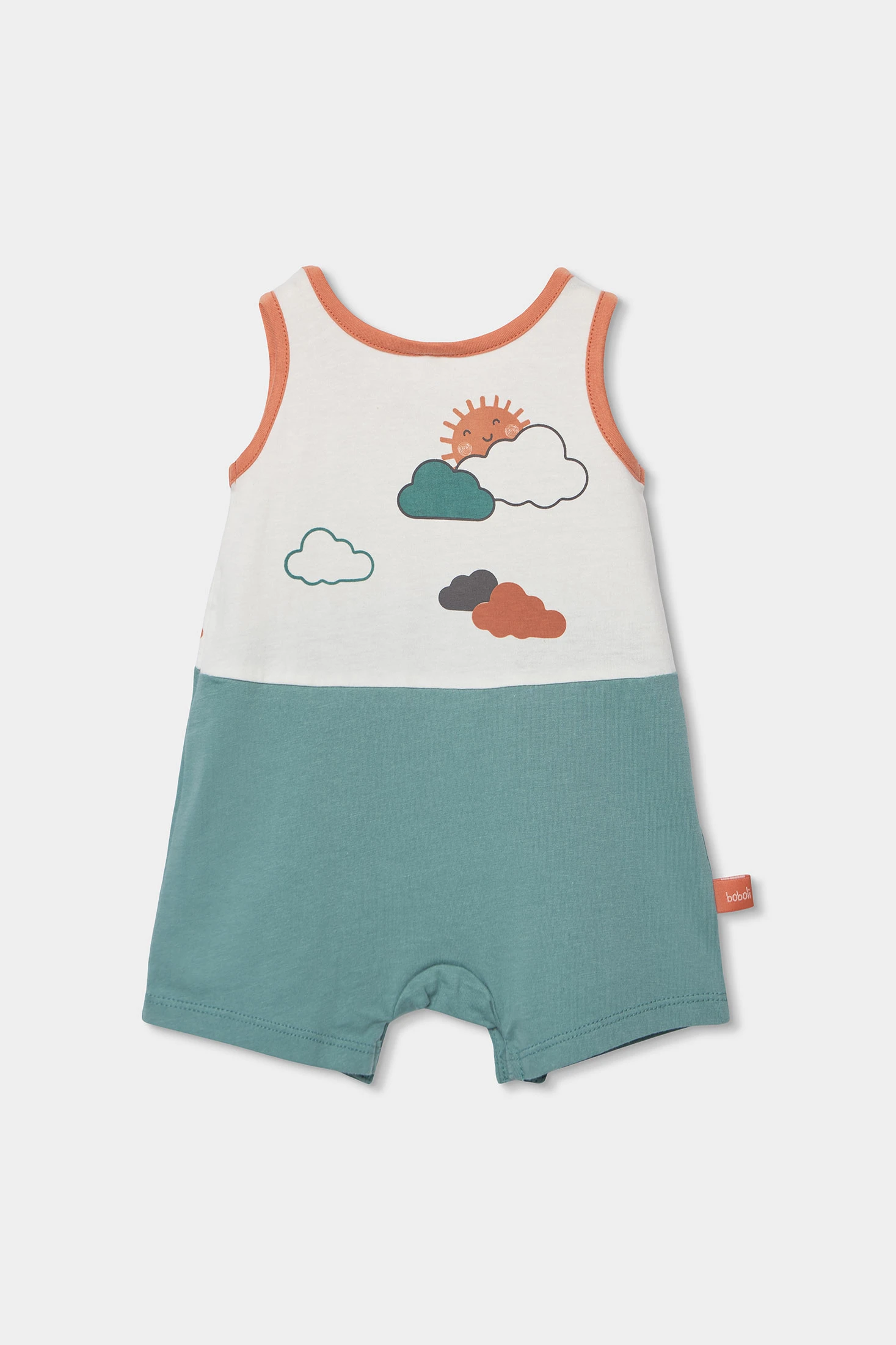 Pelele de punto de algodón bicolor, perfecto para bebés, presenta un encantador diseño con un fondo blanco y detalles en azul verdoso, adornado con nubes dibujadas que transmiten un aire alegre. Ideal para edades de 0 meses hasta los 24 meses. El material de punto suave brinda comodidad y flexibilidad, mientras que su estilo sin mangas y cuello redondo facilita el cambio de pañales. Esta versátil prenda es una opción ideal para mantener a tu bebé fresco y cómodo.