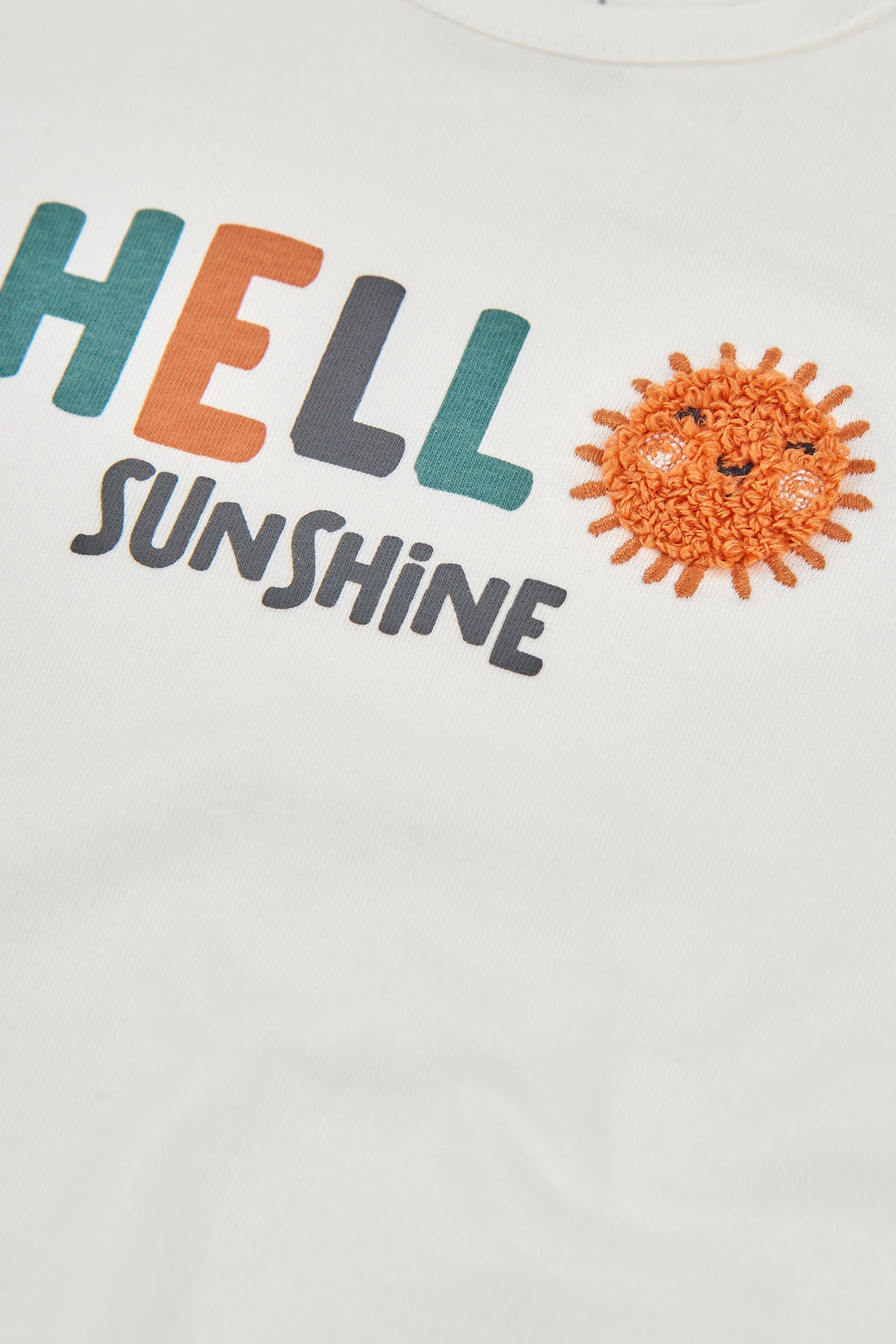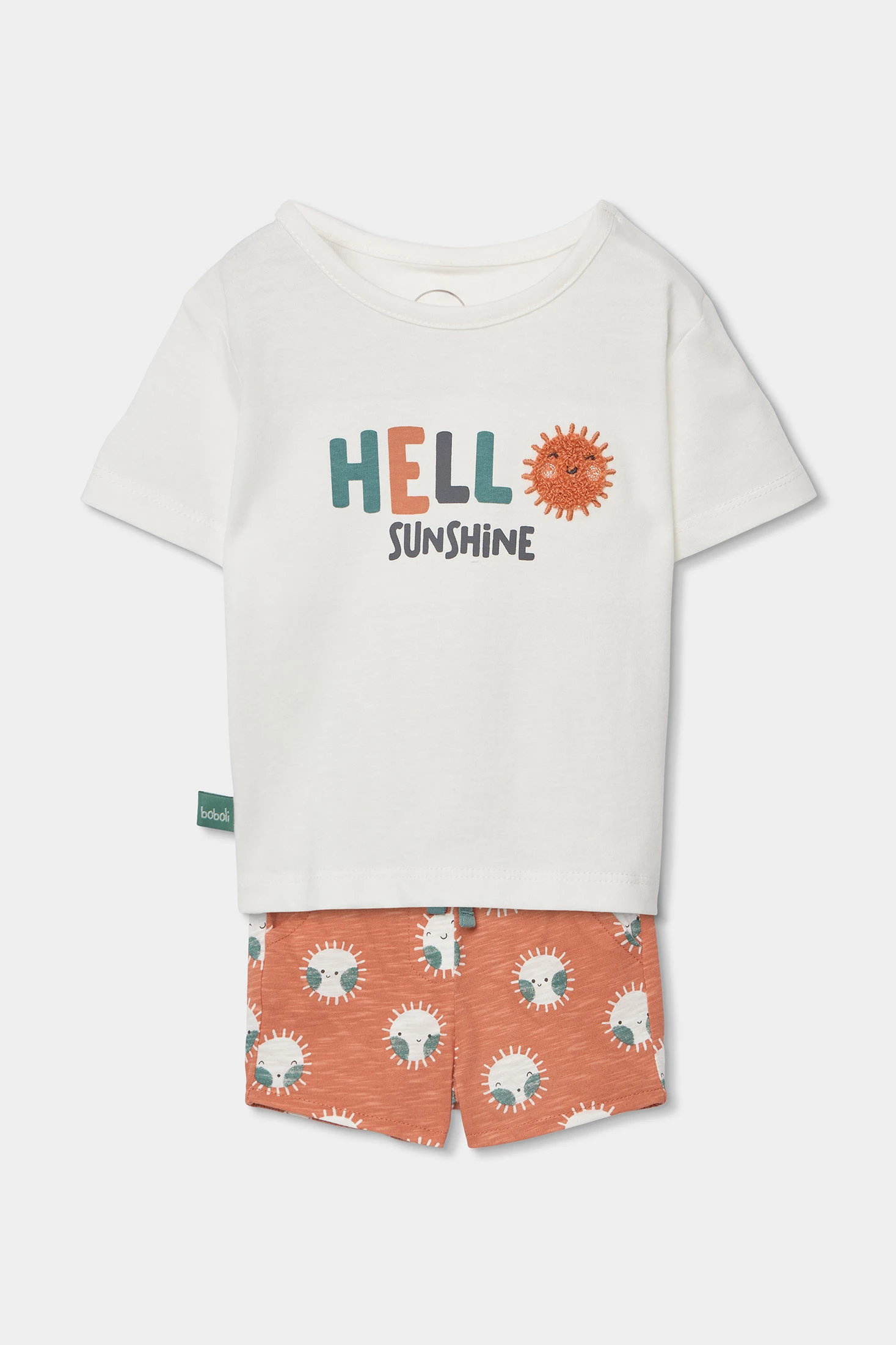 Conjunto para bebé compuesto por una camiseta blanca de algodón, ideal para mantener la comodidad de los más pequeños. Presenta un diseño con el texto "HELLO SUNSHINE" y un gráfico de sol, aportando un toque alegre. Perfecto para recién nacidos, está disponible en tallas desde 0 meses hasta 24 meses. El material suave es adecuado para la piel delicada del bebé. Se puede combinar fácilmente con otras prendas informales para crear un look cómodo y atractivo.