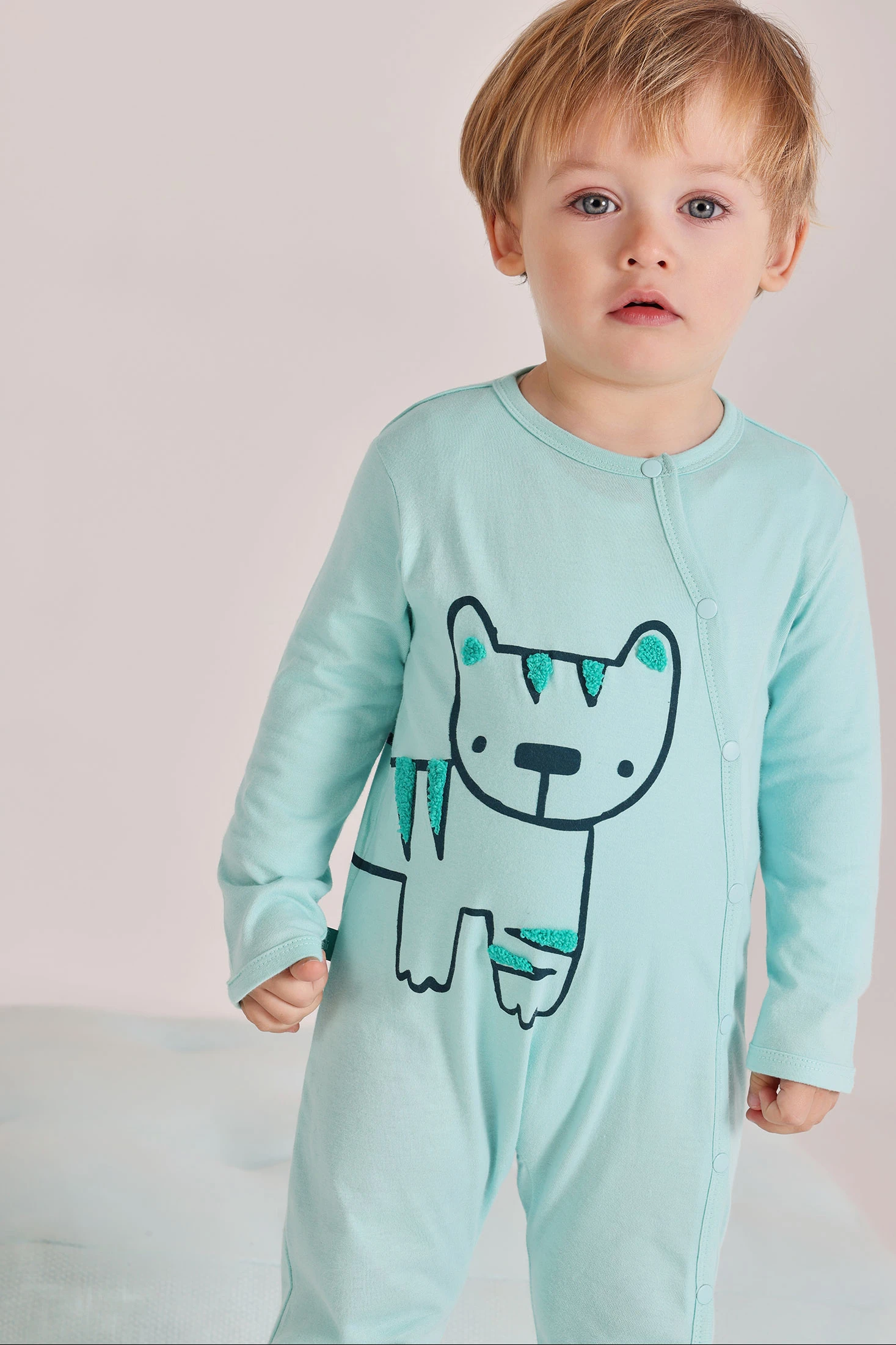 Pelele de punto verde para bebé niño ideal para mantener a tu pequeño cómodo y abrigado. Diseñado con un simpático animal en el frente, añade un toque adorable al atuendo de tu bebé. Su tejido suave es perfecto para la piel delicada. Con tallas desde 0 meses hasta 24 meses, el cierre de botones facilita el cambio de ropa y pañales. Las mangas largas y los pies cubiertos garantizan calidez en los días más frescos. Un conjunto funcional y coqueto para las primeras etapas de vida.
