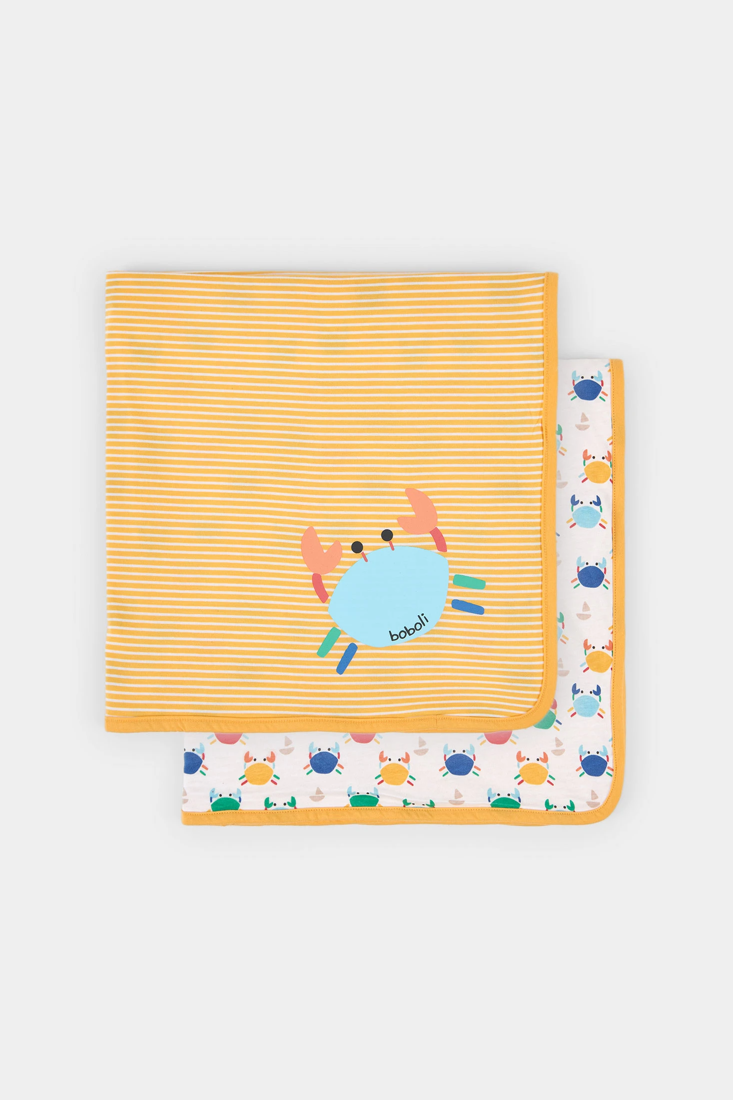 Manta de algodón para niño, ideal para recién nacidos. Su diseño presenta un estampado divertido de rayas amarillas y, pequeños cangrejos de colores en el reverso. El material es suave y transpirable, perfecto para mantener a tu bebé cómodo y abrigado. Ligera, fácil de transportar y puede ser usada tanto en casa como en el cochecito. Un accesorio práctico y con estilo alegre para cualquier ocasión.
