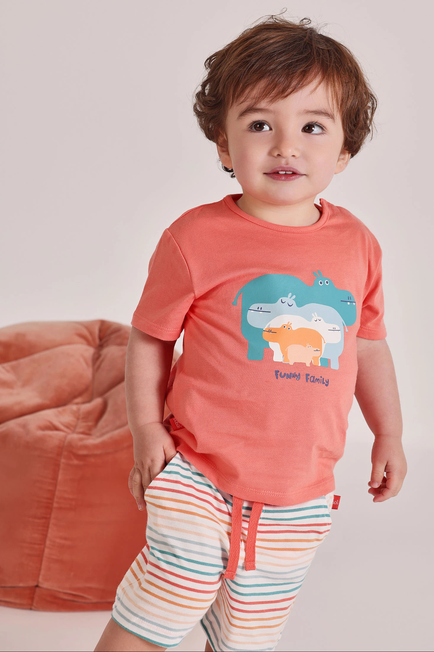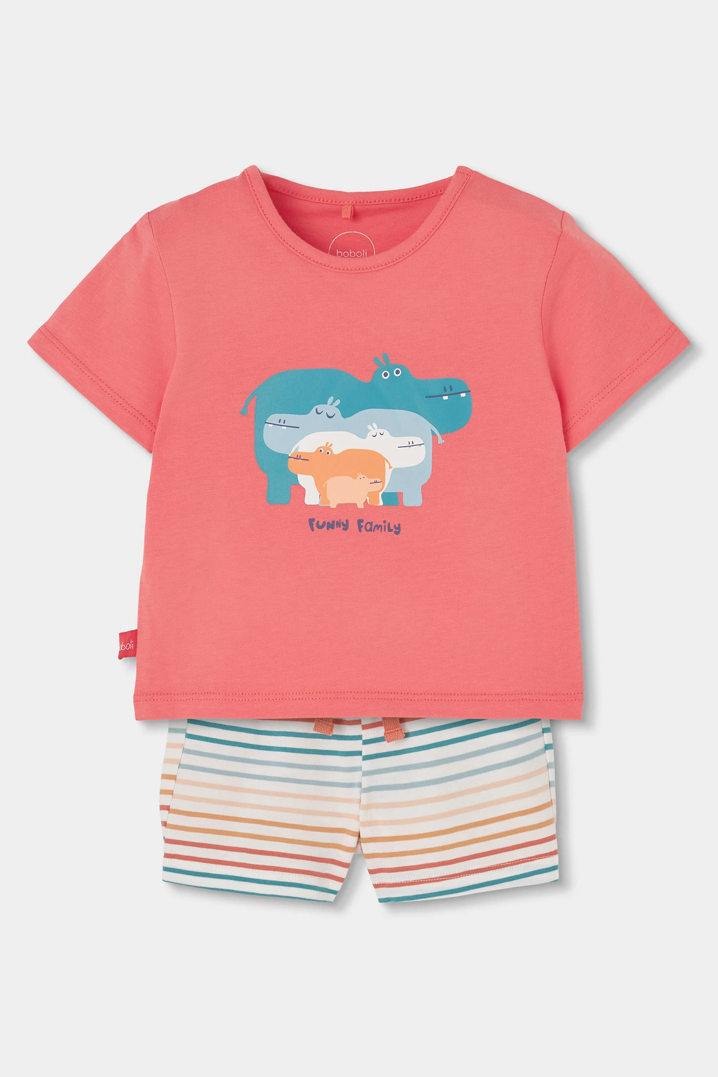Conjunto de algodón para bebé niño en color naranja. Suave y cómoda, es ideal para la delicada piel de los más pequeños. Presenta un diseño con dibujos de animales que aporta un toque divertido. Perfecto para el uso diario, está disponible en tallas desde 1 mes hasta 24 meses.