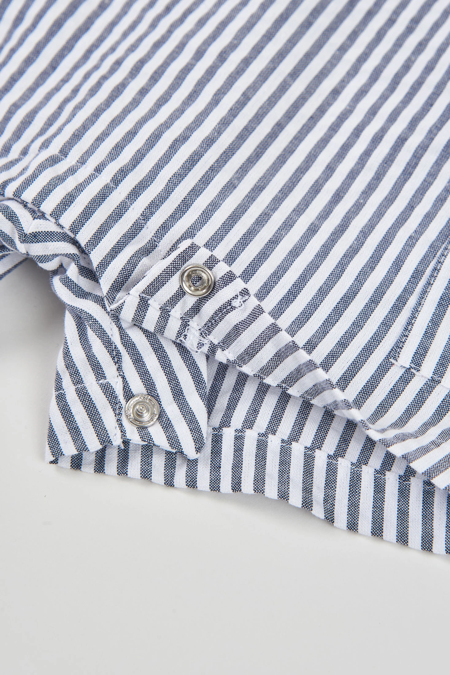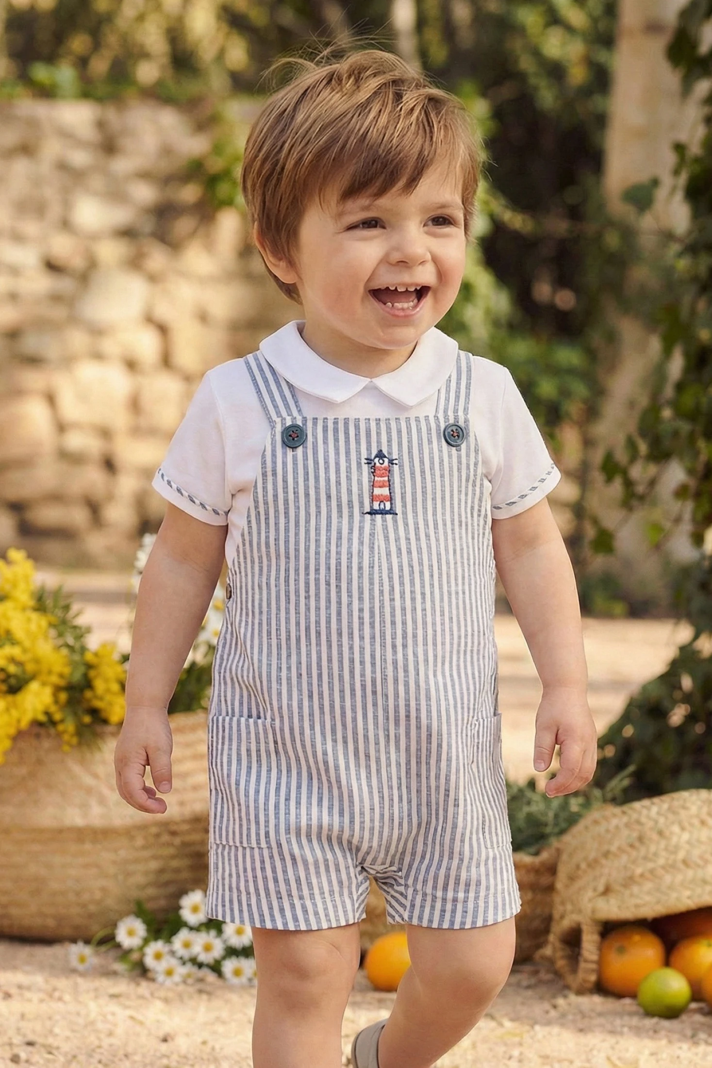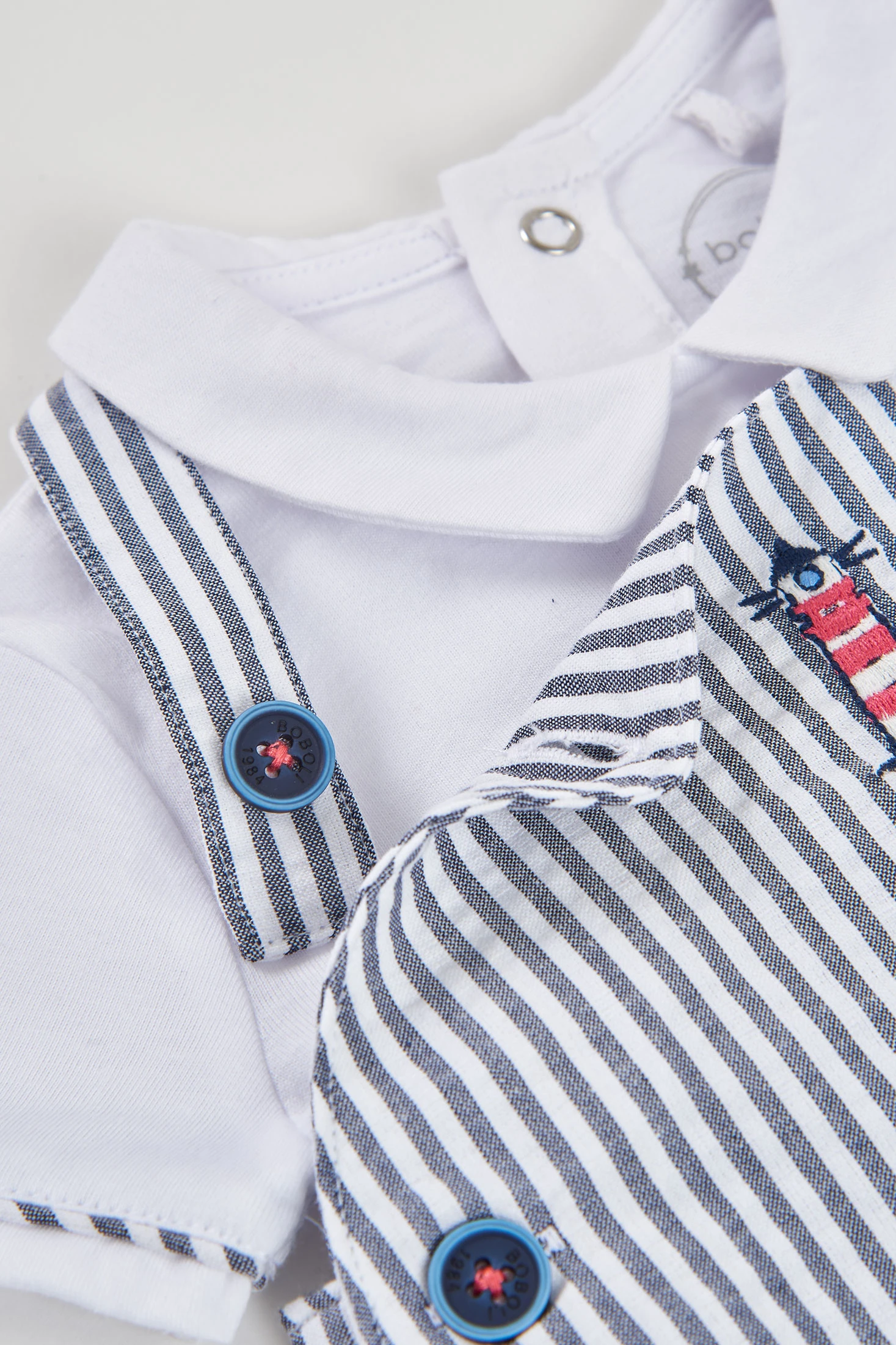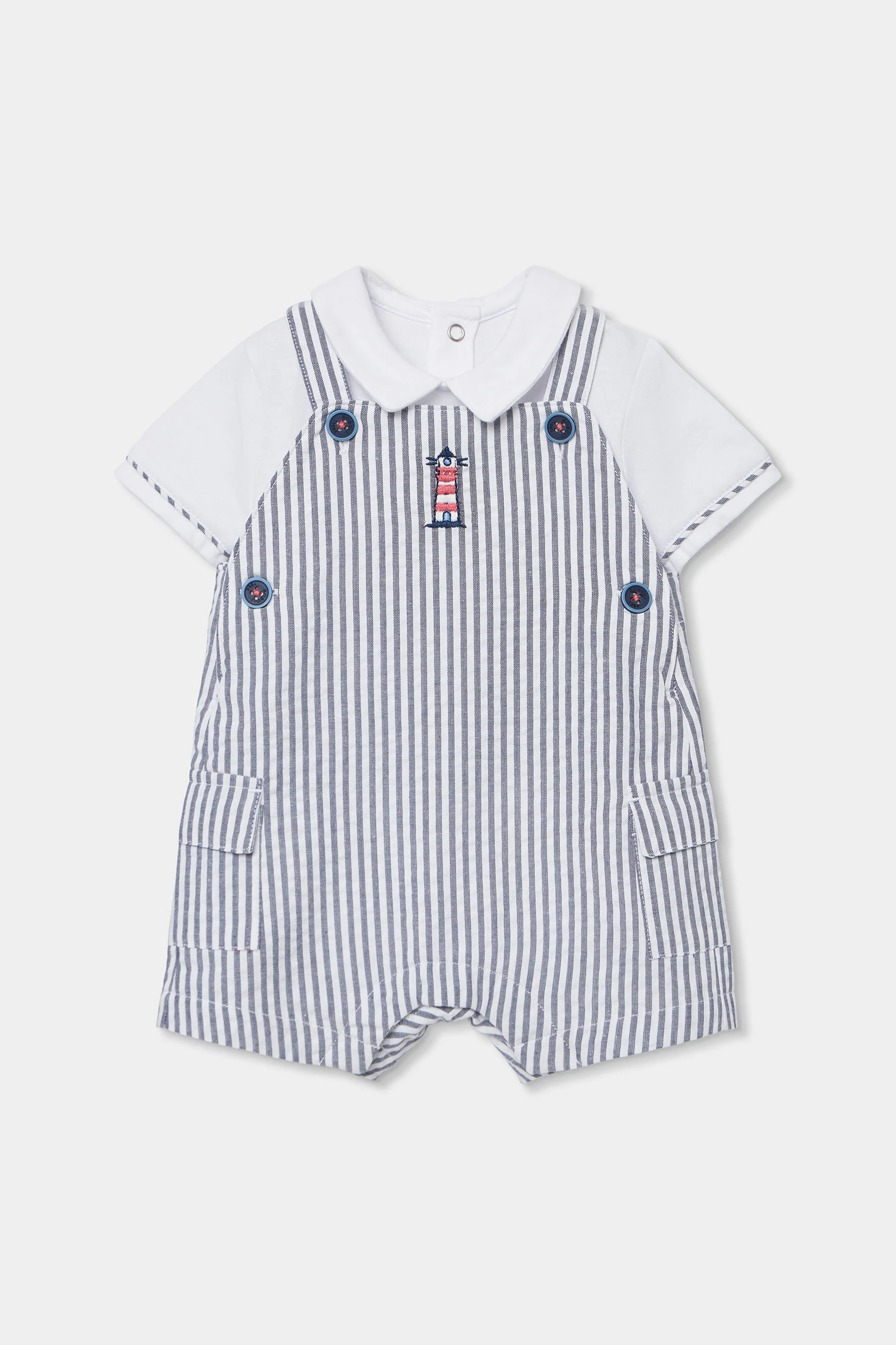 Conjunto de punto para bebé, ideal para cualquier ocasión, confeccionado en algodón blanco y azul. El diseño incluye un motivo de rayas con un detalle de un faro bordado en el pecho, que añade un toque marino y encantador. Disponible en tallas desde 1 mes hasta 2 años, adaptándose perfectamente al crecimiento del bebé. El material es suave y cómodo, perfecto para la piel sensible de los más pequeños. Las mangas cortas y el cuello clásico añaden estilo, siendo una elección adecuada para combinar con diferentes accesorios.