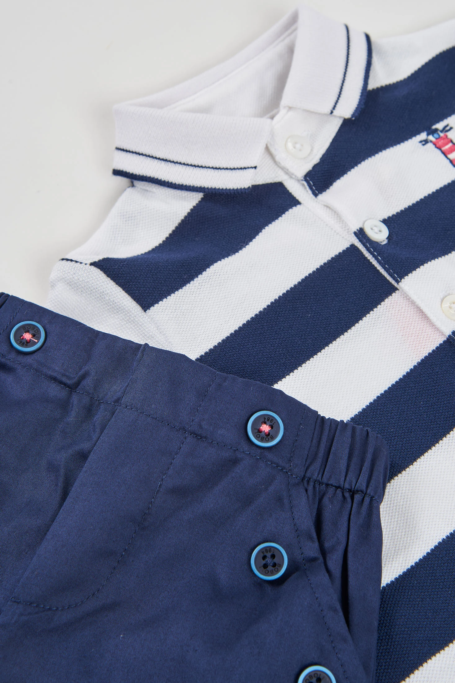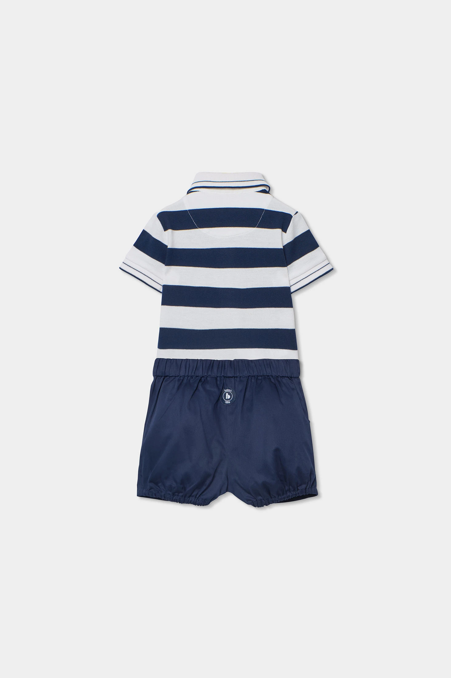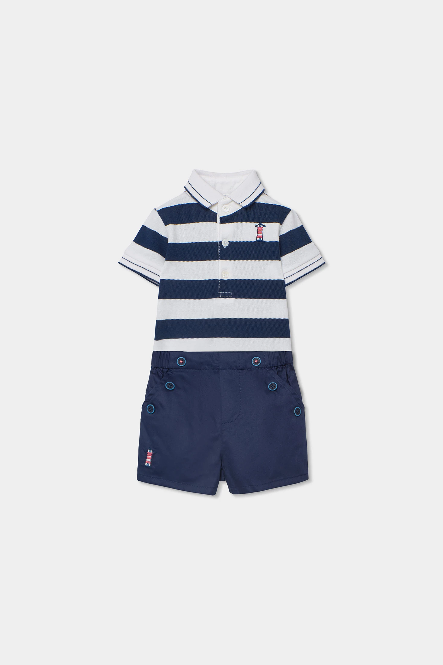 Conjunto para bebé compuesto por un polo y un short de algodón en azul marino. El polo presenta un diseño de rayas horizontales en blanco y azul, con un pequeño bordado decorativo. Su tejido de algodón asegura suavidad y comodidad para la piel delicada del bebé. El short es de un color azul marino liso, con botones decorativos en la parte delantera. Disponible en tallas de 1 mes a 2 años, es perfecto para ocasiones casuales y permite libertad de movimiento. Un conjunto elegante y funcional para los primeros años del bebé.