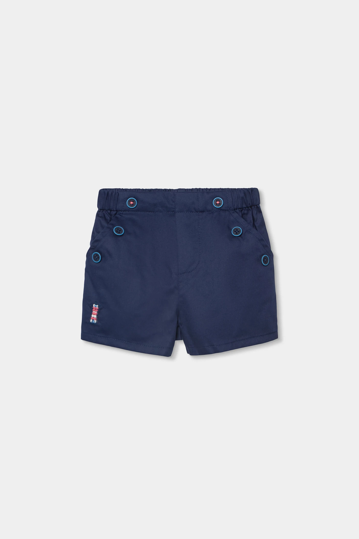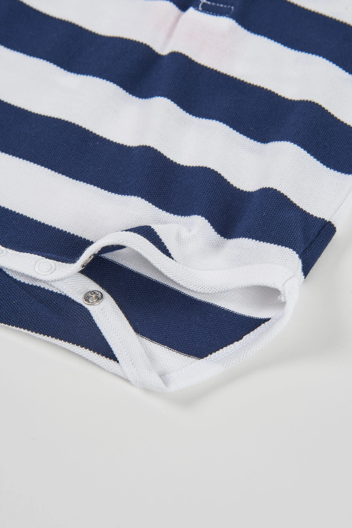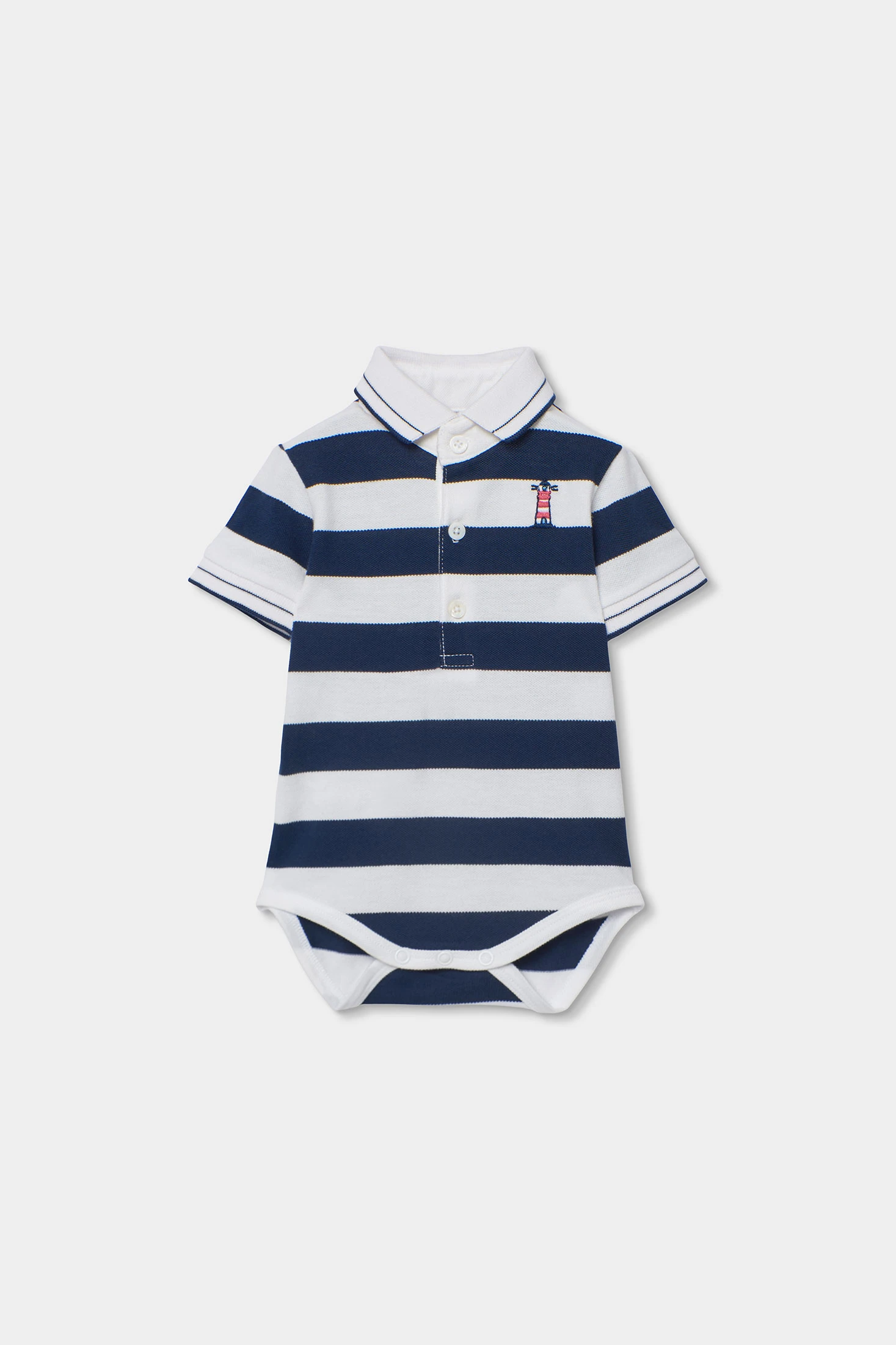 Conjunto para bebé compuesto por un polo y un short de algodón en azul marino. El polo presenta un diseño de rayas horizontales en blanco y azul, con un pequeño bordado decorativo. Su tejido de algodón asegura suavidad y comodidad para la piel delicada del bebé. El short es de un color azul marino liso, con botones decorativos en la parte delantera. Disponible en tallas de 1 mes a 2 años, es perfecto para ocasiones casuales y permite libertad de movimiento. Un conjunto elegante y funcional para los primeros años del bebé.