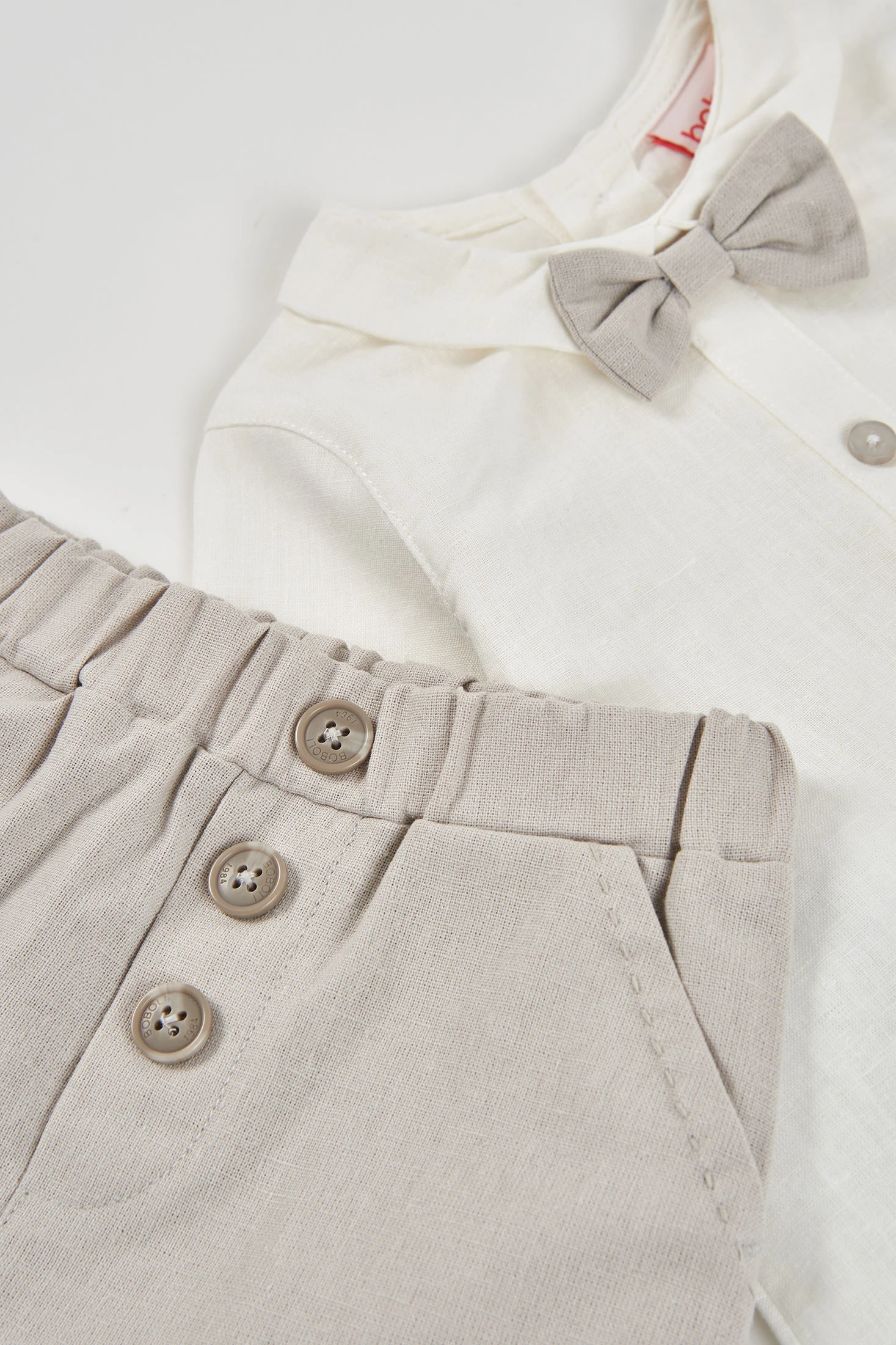 Conjunto de lino beige para bebé niño, elegante y ideal para ocasiones especiales. Compuesto por una camisa y pantalones, su material en lino proporciona frescura y confort. La camisa es de color blanco, con botones al frente y un lazo decorativo que añade un toque chic. Los pantalones beige combinan perfectamente, creando un look sofisticado. Disponible en tallas desde 1 mes hasta 2 años, es perfecto para cualquier temporada. Este conjunto versátil permite combinarse fácilmente con otras prendas para lograr un estilo encantador y cómodo para el bebé.