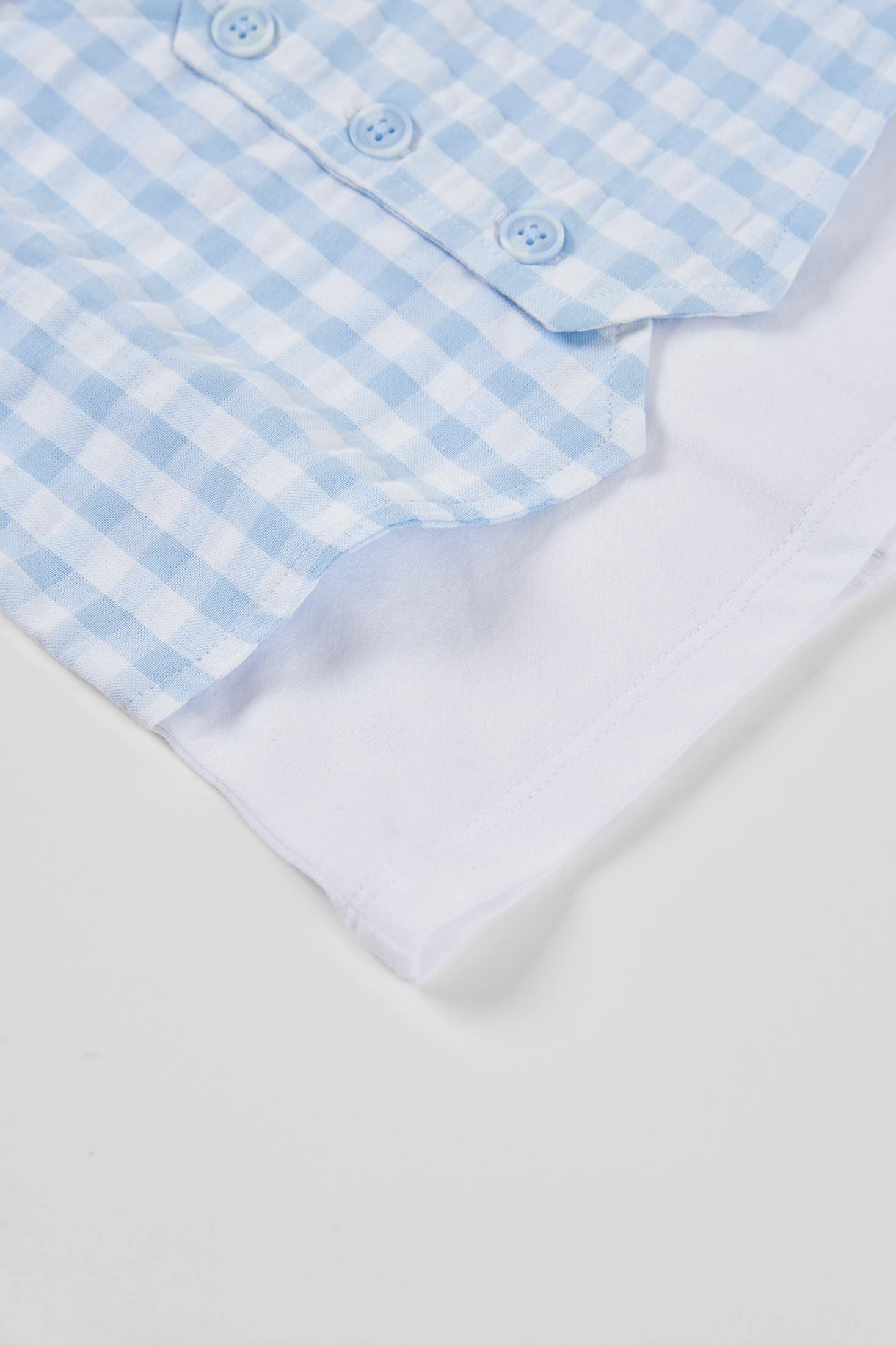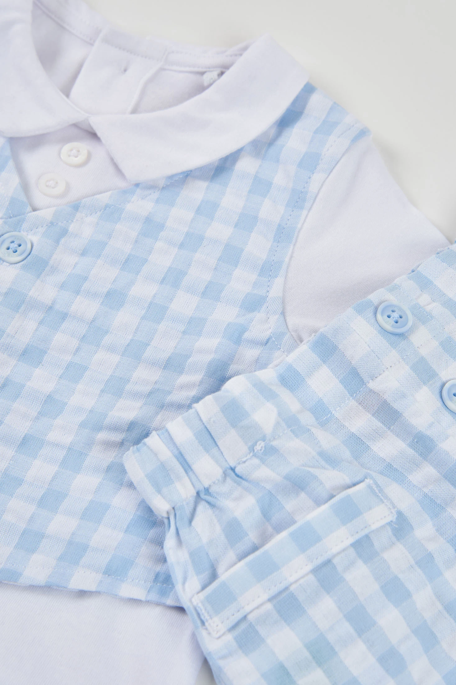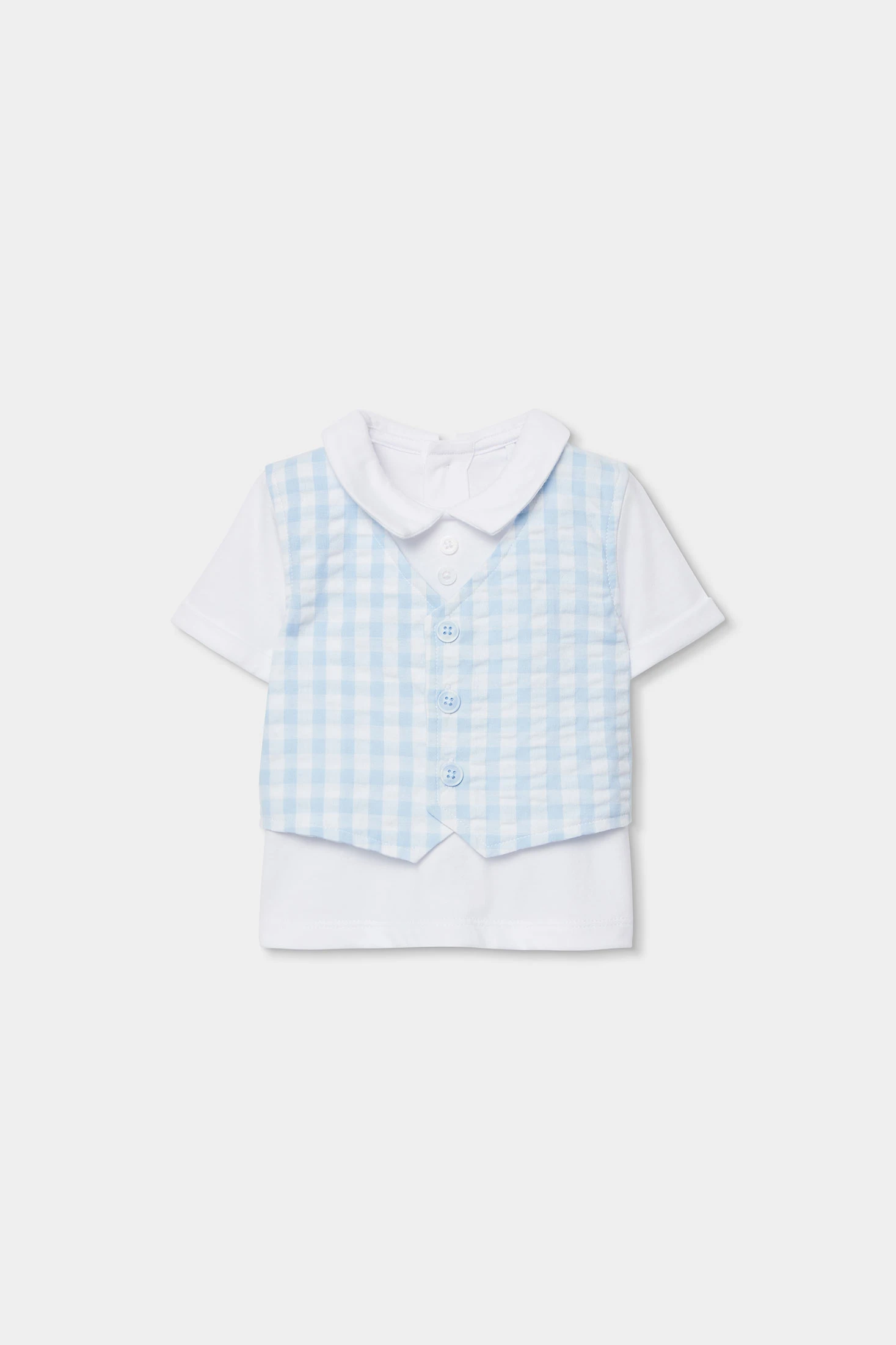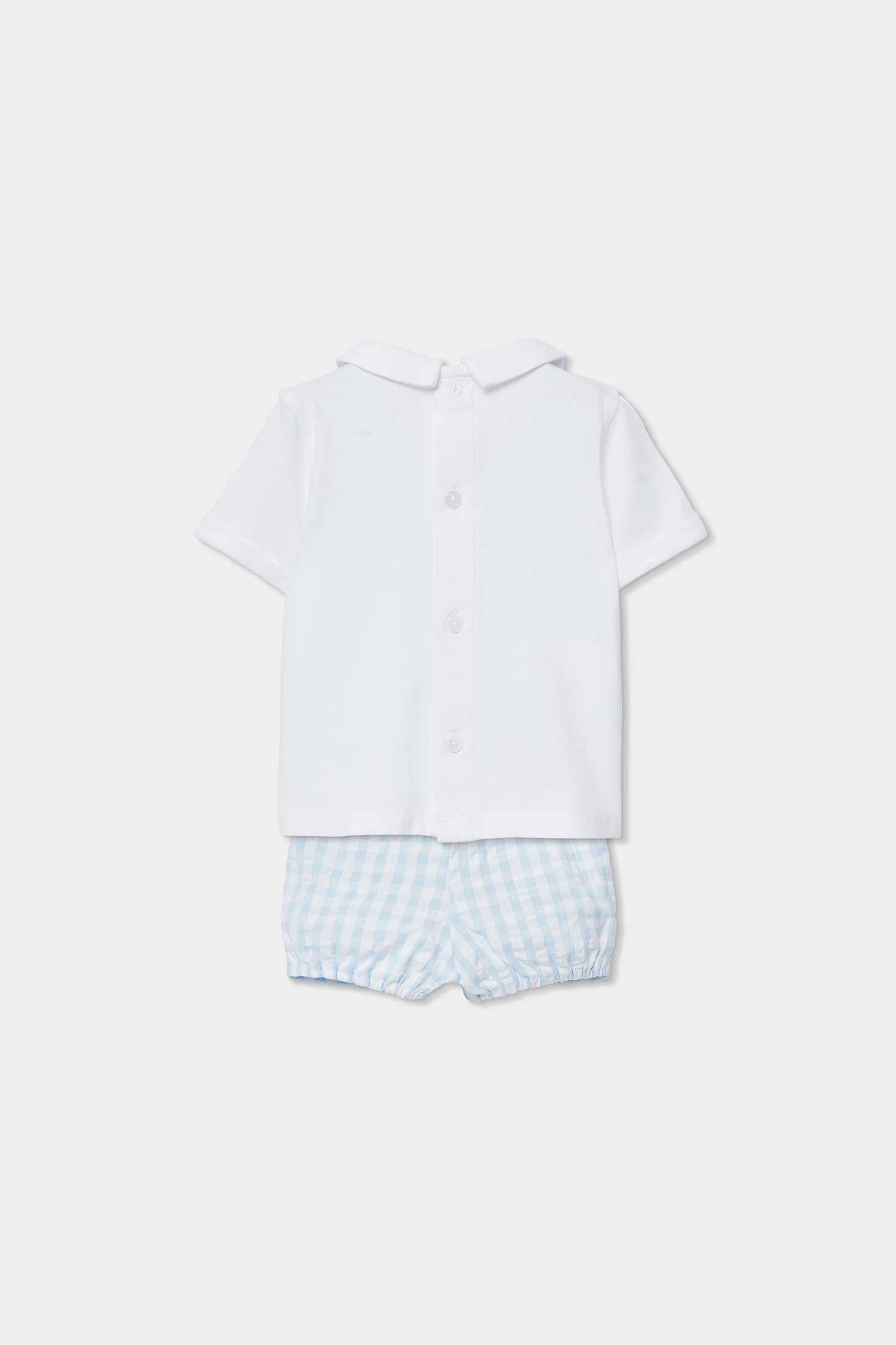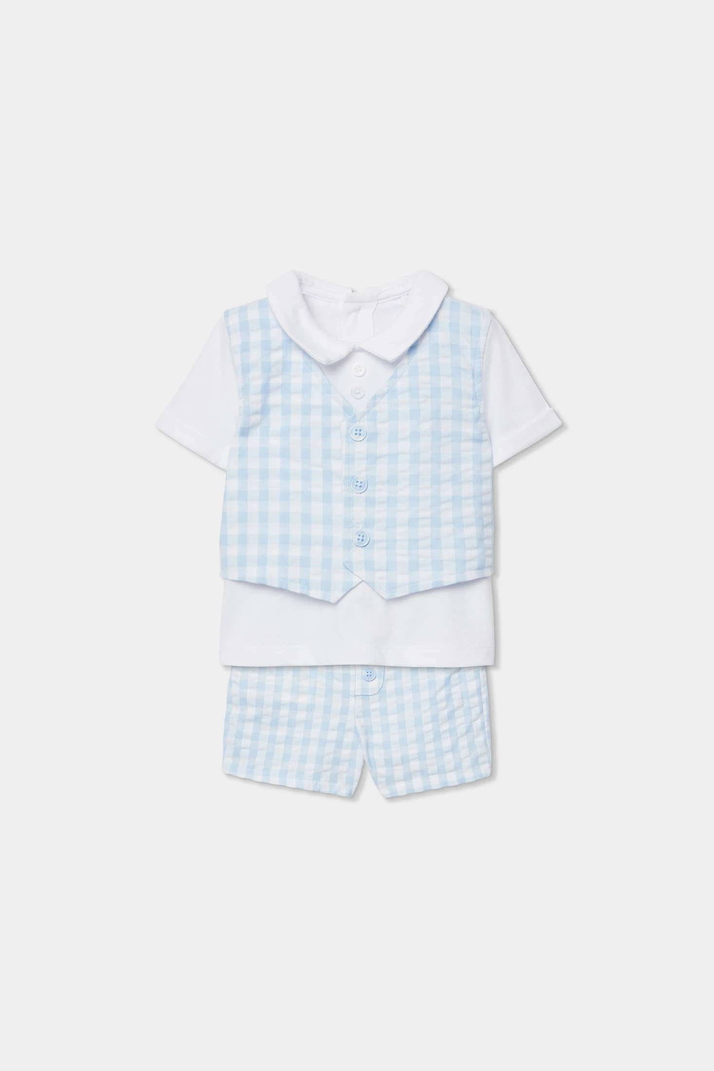 Conjunto de punto de algodón para bebé ideal para los más pequeños. Con un diseño de cuadros azules y blancos, incluye una camiseta blanca con cuello redondo y un chaleco incorporado con botones decorativos. Los pantalones cortos a juego completan el conjunto. Está disponible en tallas desde 1 mes hasta 2 años, adaptándose al crecimiento de tu bebé. Perfecto para ocasiones especiales, su material garantiza suavidad y comodidad. El color azul de los cuadros aporta un toque clásico y elegante.