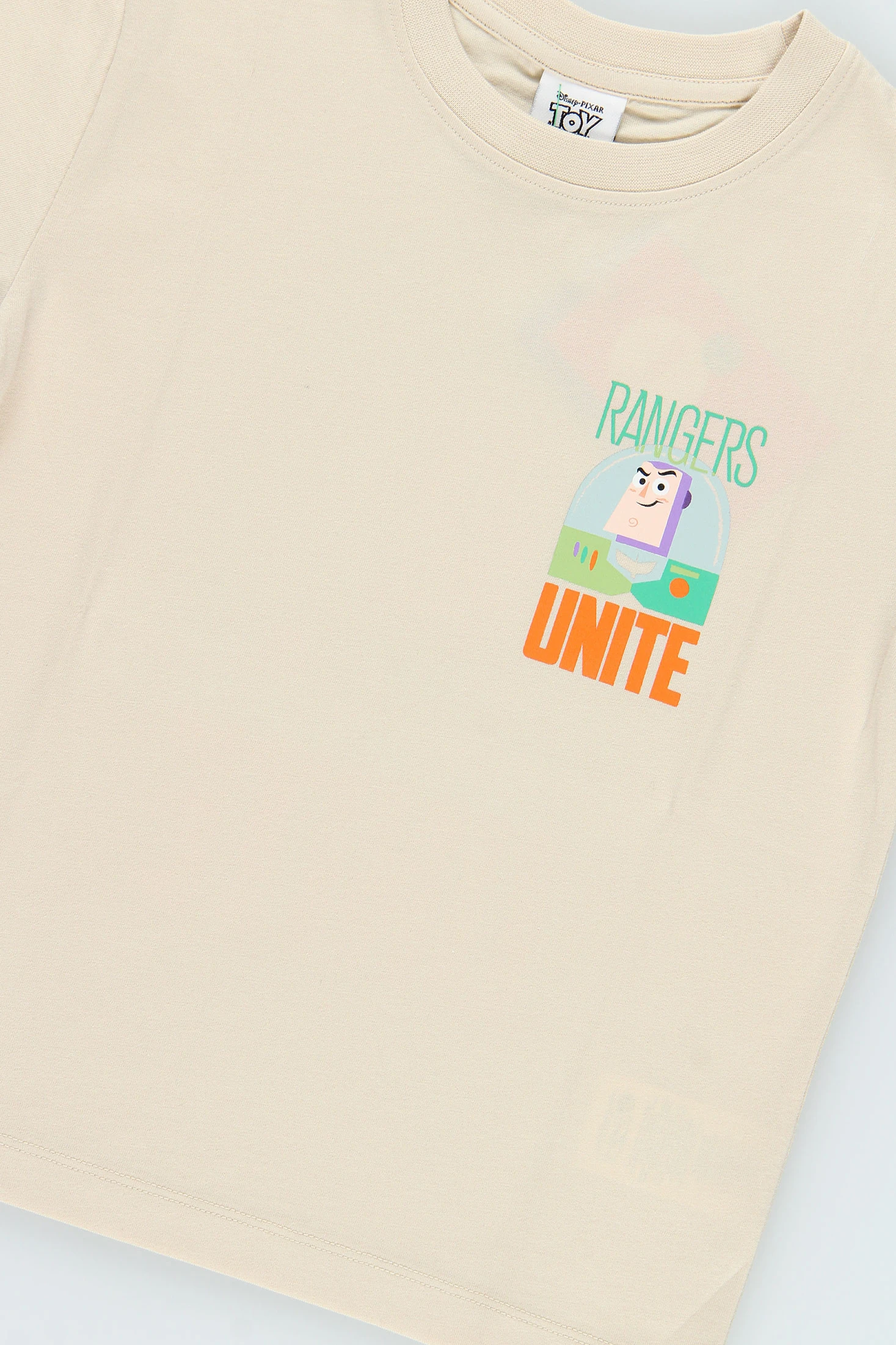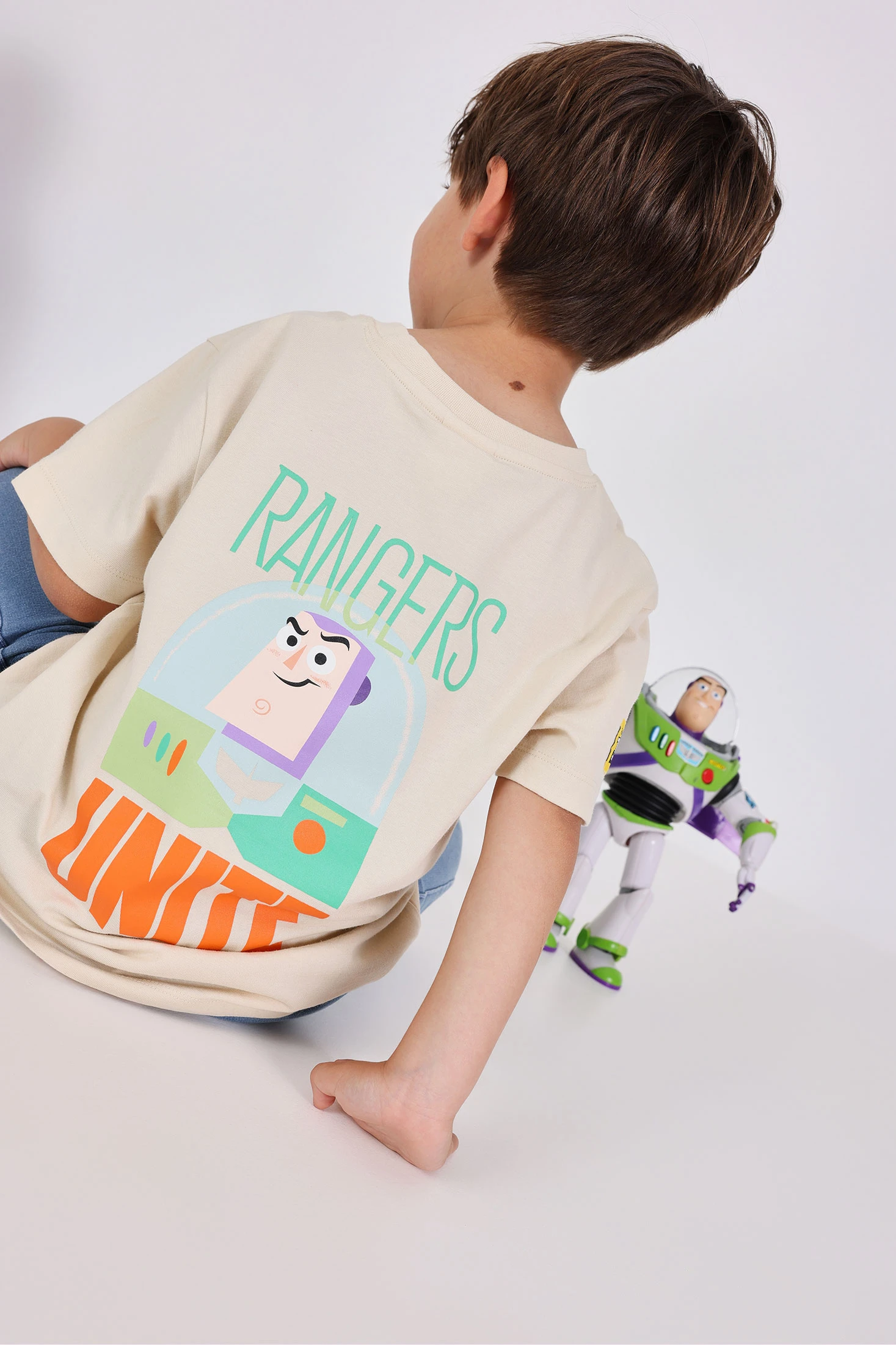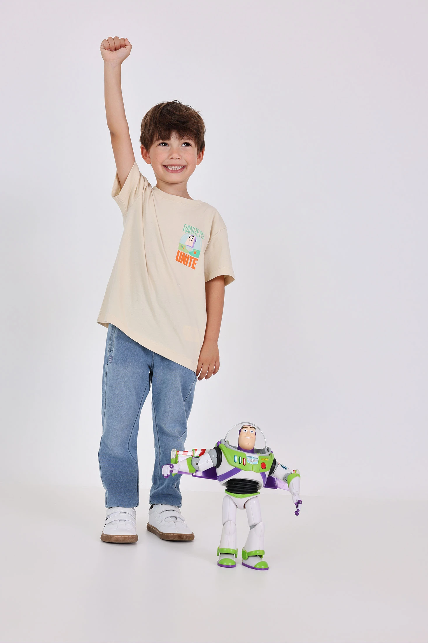 Esta camiseta de manga corta para niños es una prenda cómoda y divertida, inspirada en el icónico personaje de Buzz Lightyear. Su color marrón piedra y su estampado espacial la convierten en una opción ideal para los pequeños fans de Toy Story. Confeccionada en algodón suave, ofrece una gran comodidad durante todo el día. Disponible en tallas desde 12 meses hasta 8 años.Una prenda versátil que invita a imaginar nuevas aventuras, ¡hasta el infinito y más allá!