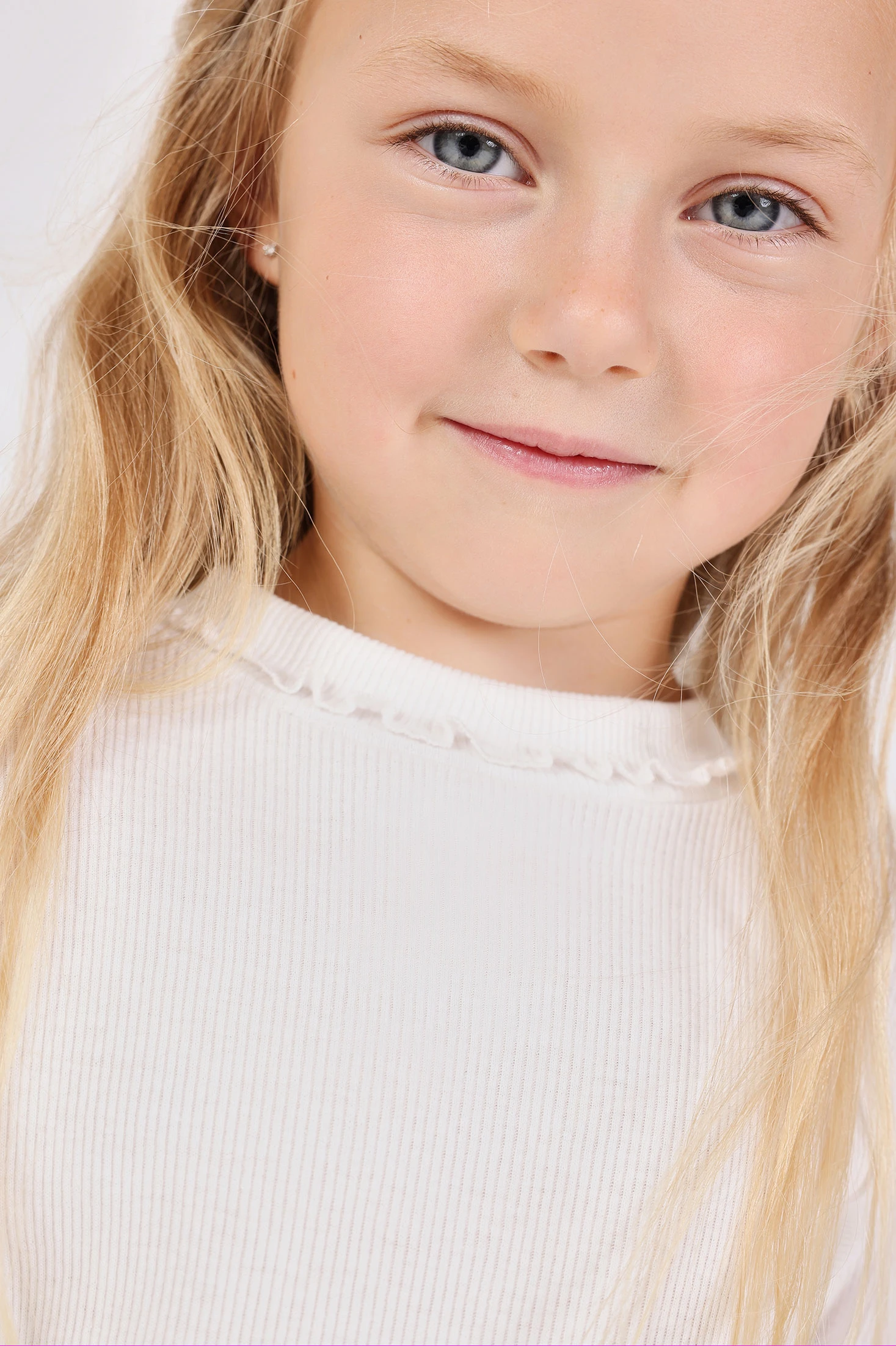 Camiseta de algodón para niña, en color blanco, ideal para los climas más frescos. Diseñada con un elegante cuello redondo adornado con un delicado volante y mangas largas, ofrece comodidad y adaptabilidad. Confeccionada en materiales de alta calidad, está disponible en tallas desde 12 meses hasta 10 años, cubriendo una amplia variedad de etapas en el crecimiento del niño. Su versatilidad permite combinarla fácilmente con pantalones o faldas, siendo perfecta para ocasiones tanto informales como formales. Una adición esencial al guardarropa de otoño e invierno, esta camiseta garantiza calidez y estilo.