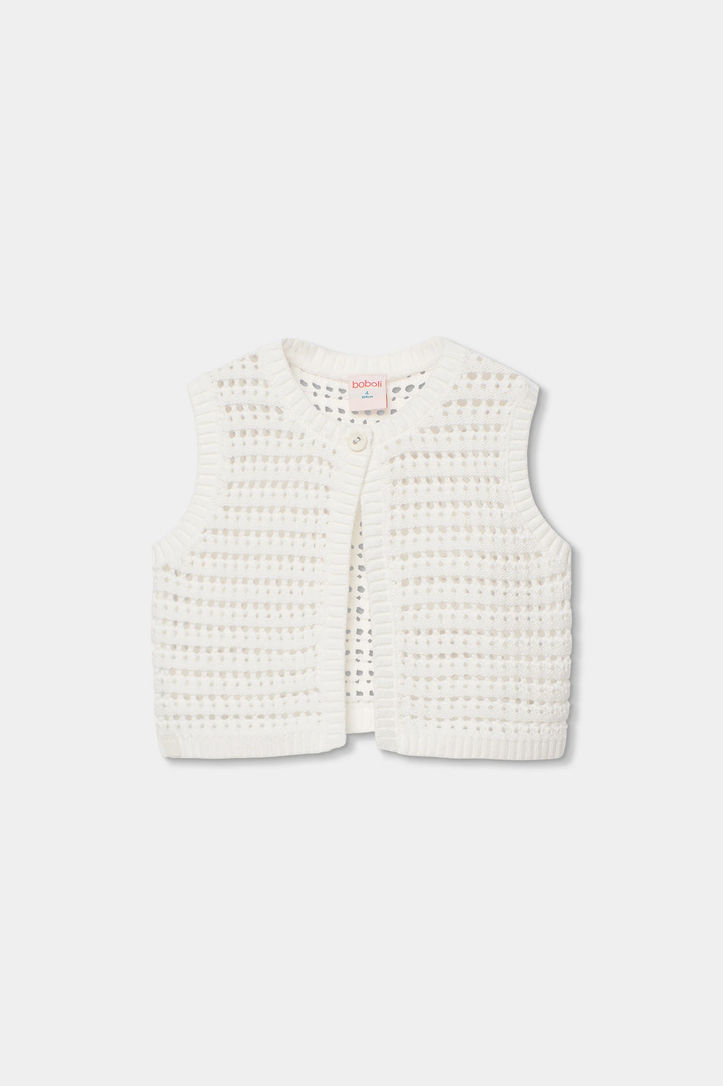 Chaleco de punto de algodón para niña, versátil y cómodo, ideal para diversas ocasiones. El diseño en color blanco presenta un punto calado que proporciona ligereza y un toque moderno. Perfecto para combinar con blusas o vestidos . Disponible en tallas desde 12 meses hasta 10 años, se adapta a niñas de diferentes edades.