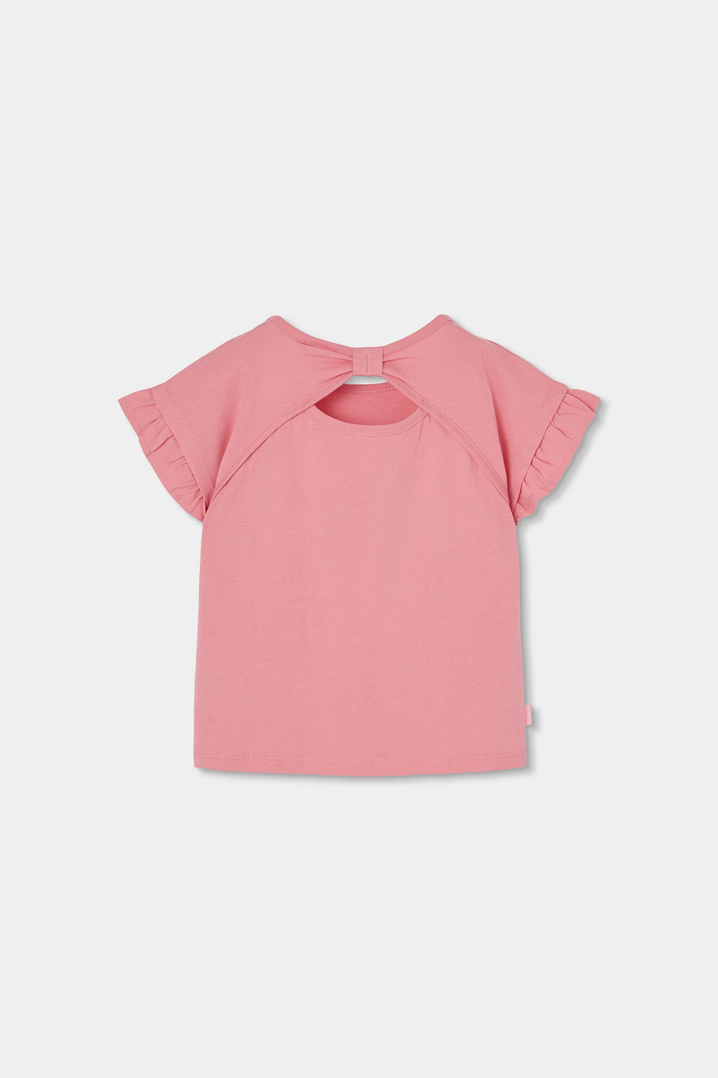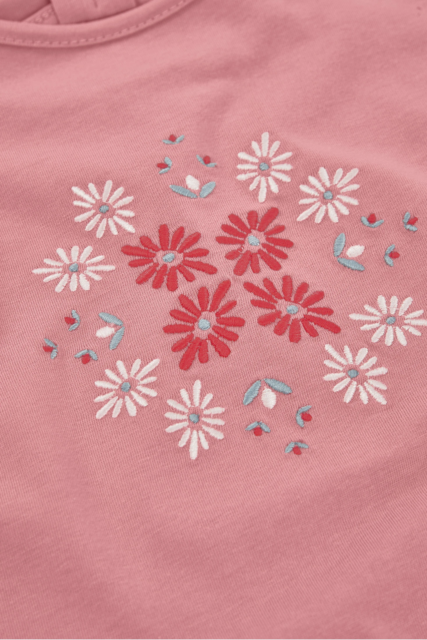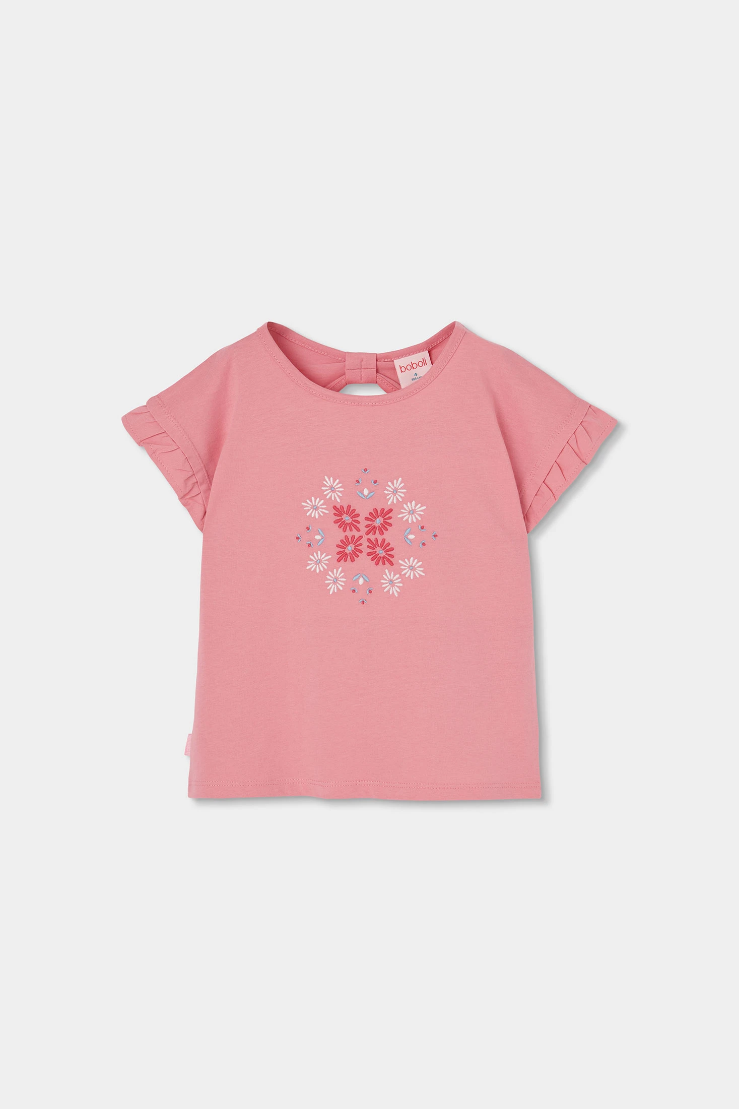 Camiseta de punto de algodón para niña, en color rosa, ideal para el día a día. Con bordado floral en varios colores. Presenta un diseño de mangas cortas con volantes, y espalda con detalle descubierto. Disponible en tallas desde 12 meses hasta 10 años, se adapta al crecimiento de las más pequeñas. Es una prenda cómoda y ligera que puede combinarse con jeans o faldas para crear un estilo casual y encantador.