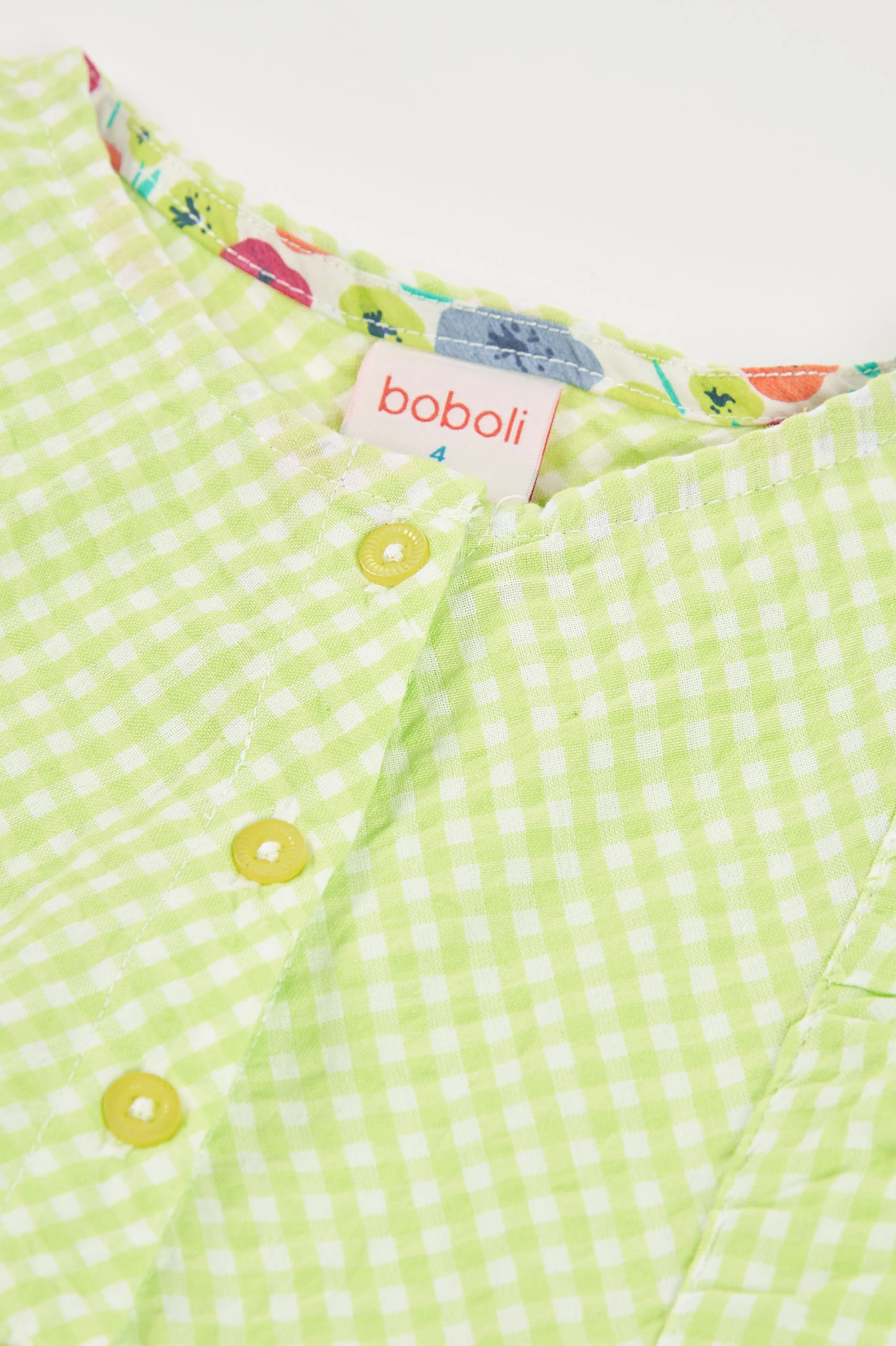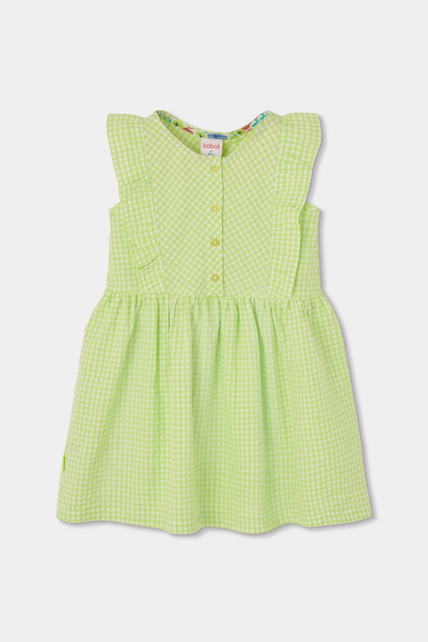 Vestido de popelín de cuadros vichy en color lima y perla . Disponible en tallas desde los 12 meses hasta los 10 años. El diseño sin mangas incluye volantes en los hombros, aportando un toque encantador y fresco. Con botones en la parte frontal para fácil uso, resulta perfecto para los días cálidos. El estampado a cuadros le da un estilo clásico y versátil, ideal para combinar en diferentes ocasiones. El material de popelín ofrece frescura y comodidad, asegurando que tu pequeña se sienta a gusto en todo momento.