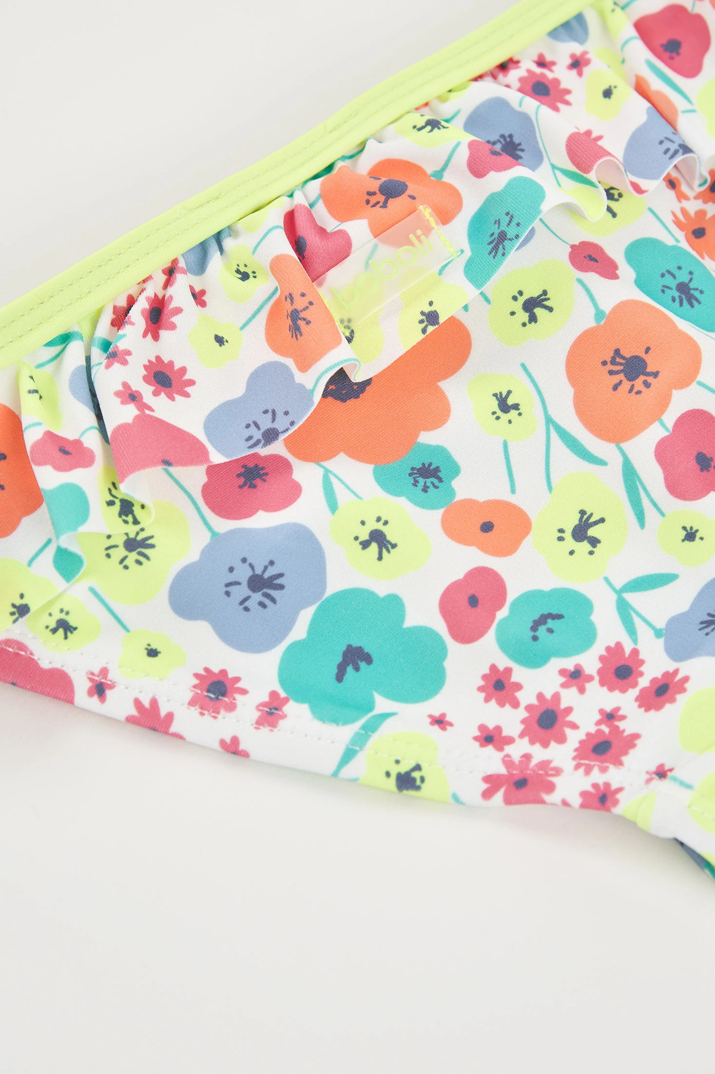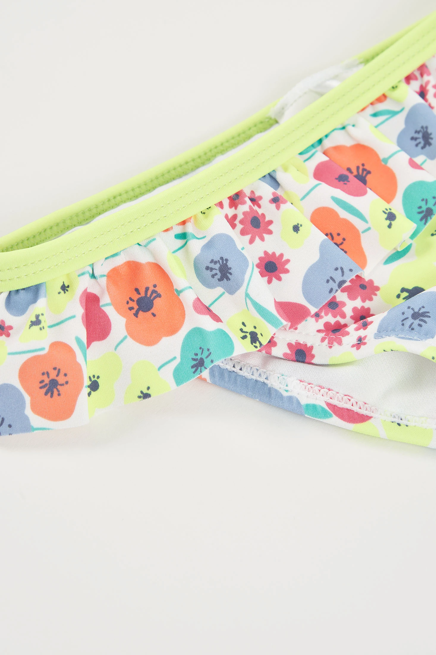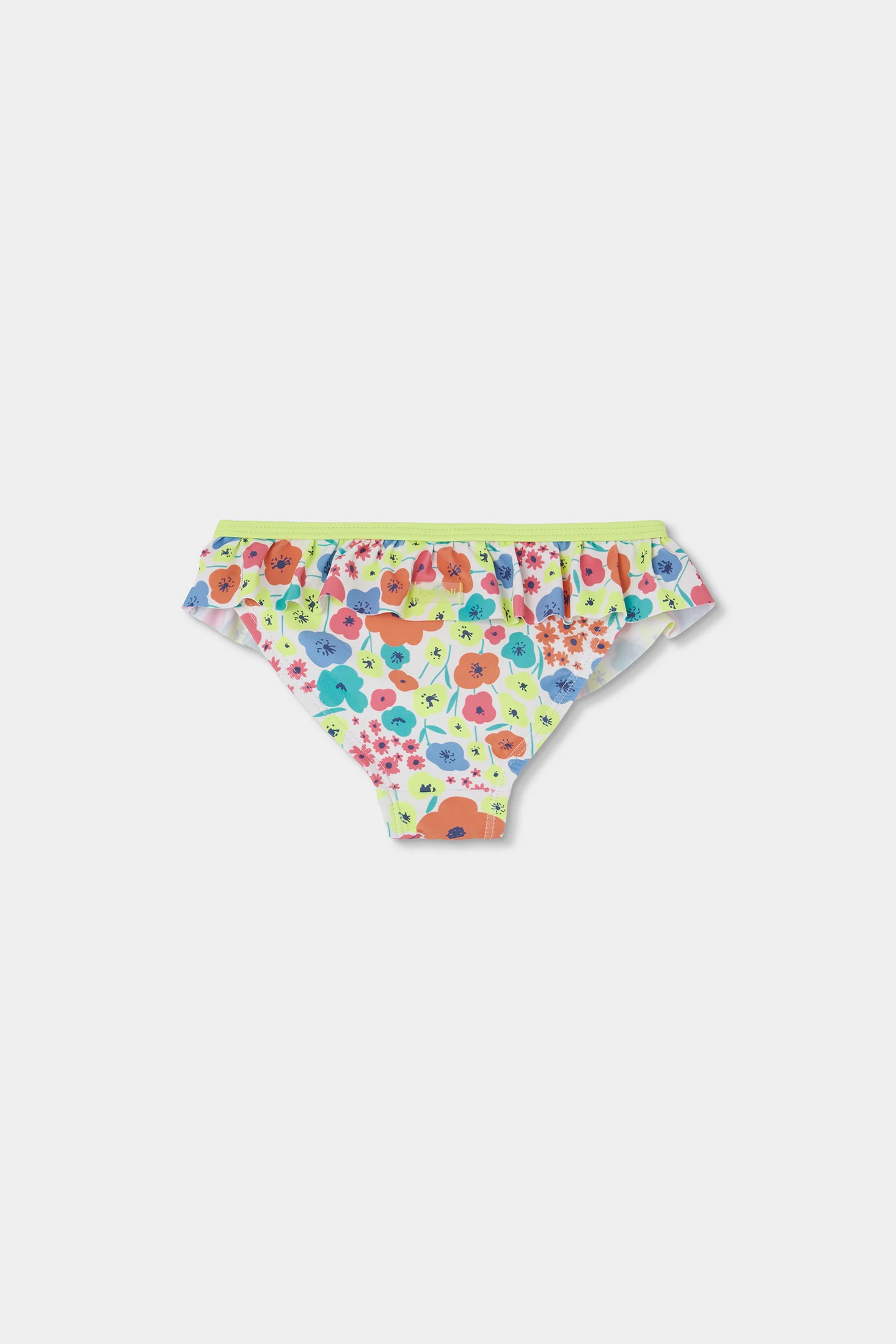 Braguita con volante estampado para niña con un diseño floral multicolor, ideal para el verano. Con protección solar certificada UPF50+, protege la piel de los rayos UV durante los días de playa y piscina. Disponible en tallas desde 12 meses hasta 10 años, se adapta al crecimiento de la niña. Su fondo perla destaca los vibrantes colores del estampado, ofreciendo un toque alegre y fresco. Perfecta para combinar con tops lisos en los días más soleados.