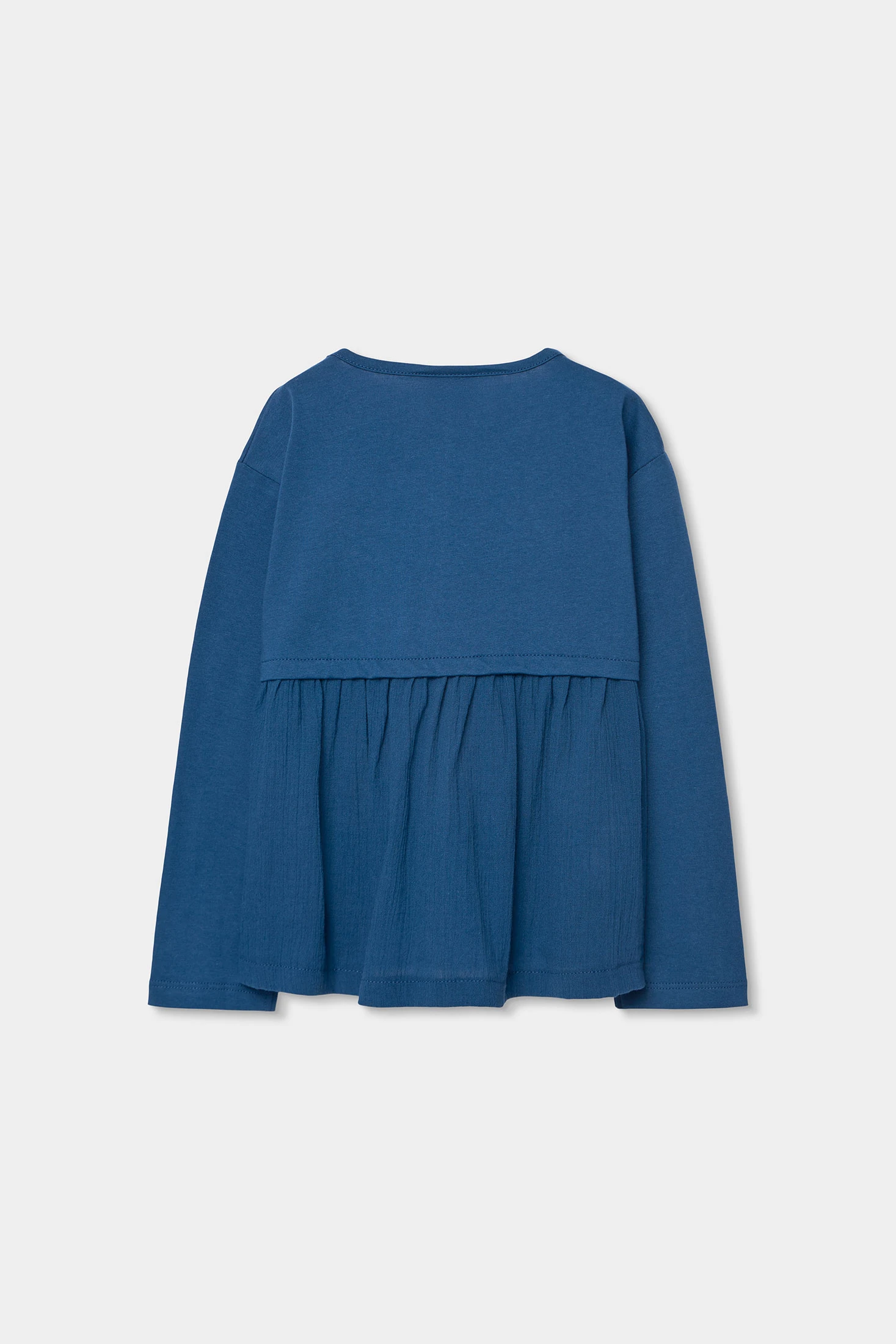Camiseta de punto azul marino para niña, ideal para el otoño e invierno. Confeccionada en algodón, ofrece comodidad y suavidad. Su diseño incluye un estampado colorido con jarrón y flores, añadiendo un toque divertido y creativo. Tiene un cuello redondo y mangas largas, perfectas para los días más frescos. Disponible en tallas desde 12 meses hasta 14 años, es una prenda versátil que puede combinarse fácilmente con jeans o faldas, aportando estilo y confort al guardarropa diario.