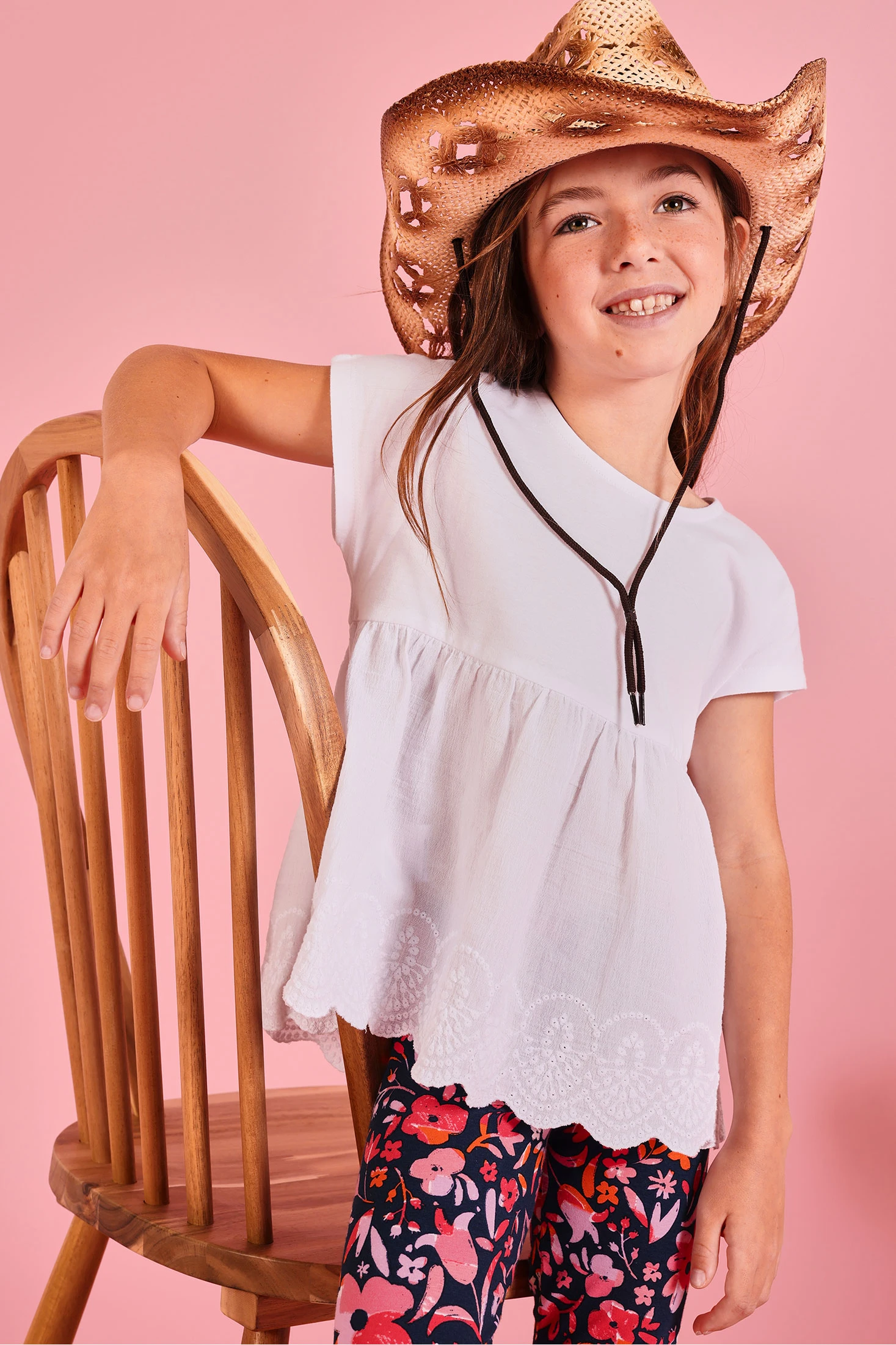 Camiseta de punto combinada para niña, hecha de un suave algodón blanco, ideal para la temporada de primavera y verano. Su diseño incluye un delicado ribete en el bajo, añadiendo un toque elegante. Perfecta para bebés de 12 meses hasta niñas de 14 años. El corte suelto proporciona comodidad y frescura, siendo adecuada para el día a día o ocasiones especiales. Su color neutro permite combinarla fácilmente con diversos estilos y colores de prendas inferiores. Una opción versátil y práctica que añade un toque de estilo clásico al armario infantil.