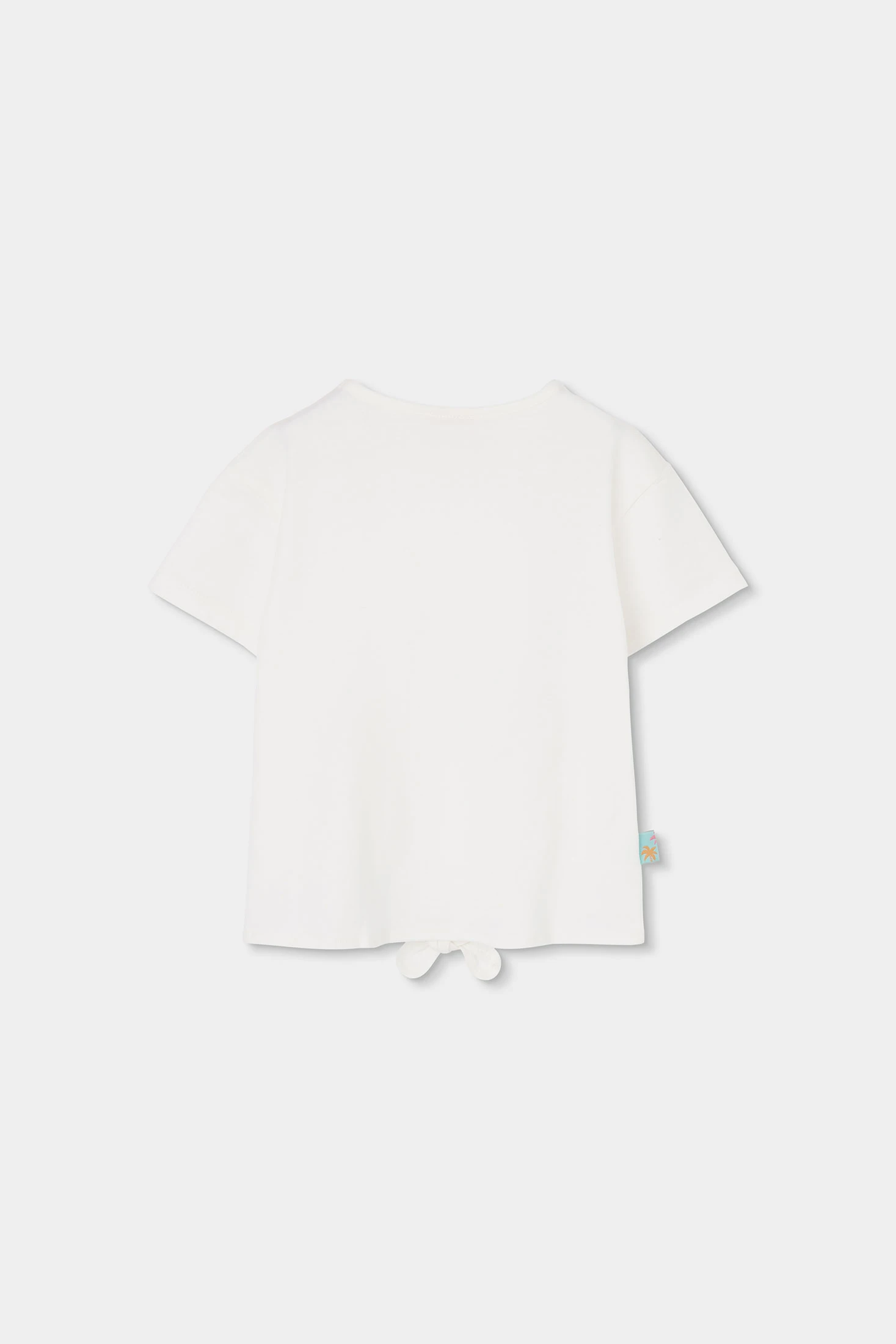 Camiseta de algodón para niña, perfecta para los días soleados de primavera y verano. De color blanco, tiene un llamativo diseño en el frente con un sol y gafas que dicen "Hello Sunshine", aportando un toque alegre y divertido. Su material de algodón ofrece comodidad y frescura. El nudo en la parte inferior añade un detalle estilizado. Disponible en tallas desde 12 meses hasta 10 años, es una opción versátil para combinar con faldas o pantalones, ideal para un look casual y cómodo.