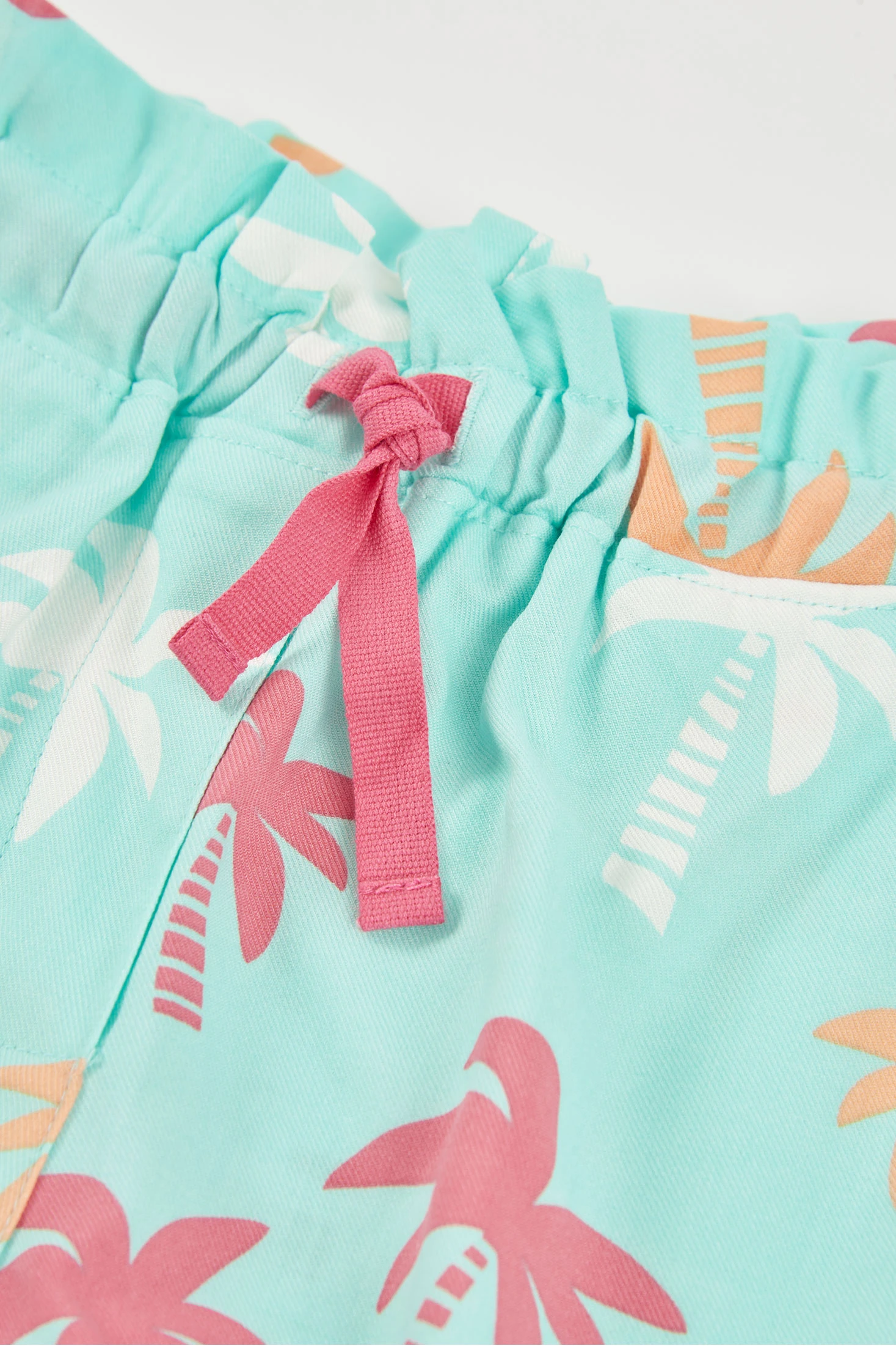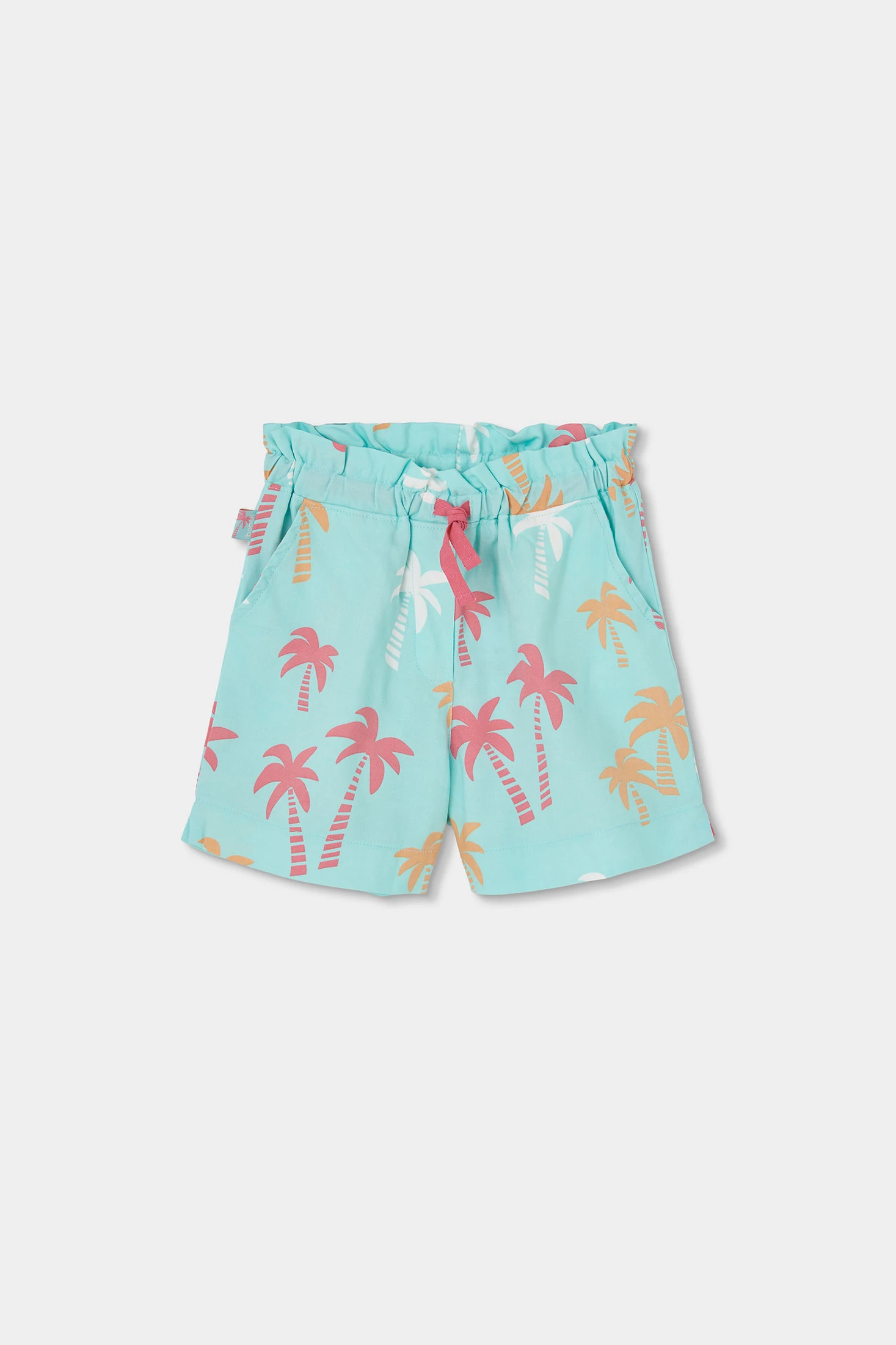 Bermuda de estampado de palmeras, perfecto para los días de verano. Confeccionado en tejido de algodón,fresco y suave. El diseño en color turquesa con palmeras en tonos rosa y naranja añade un toque tropical y divertido. Ideal para niños desde 12 meses hasta 10 años. Combina fácilmente con camisetas de colores neutros, siendo una opción versátil para el día a día. La cintura elástica garantiza un ajuste cómodo y seguro, facilitando el movimiento para jugar y disfrutar al aire libre.