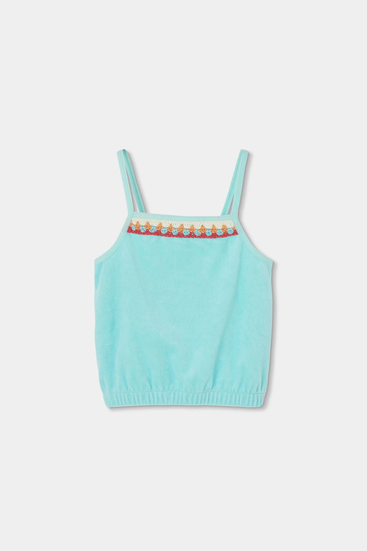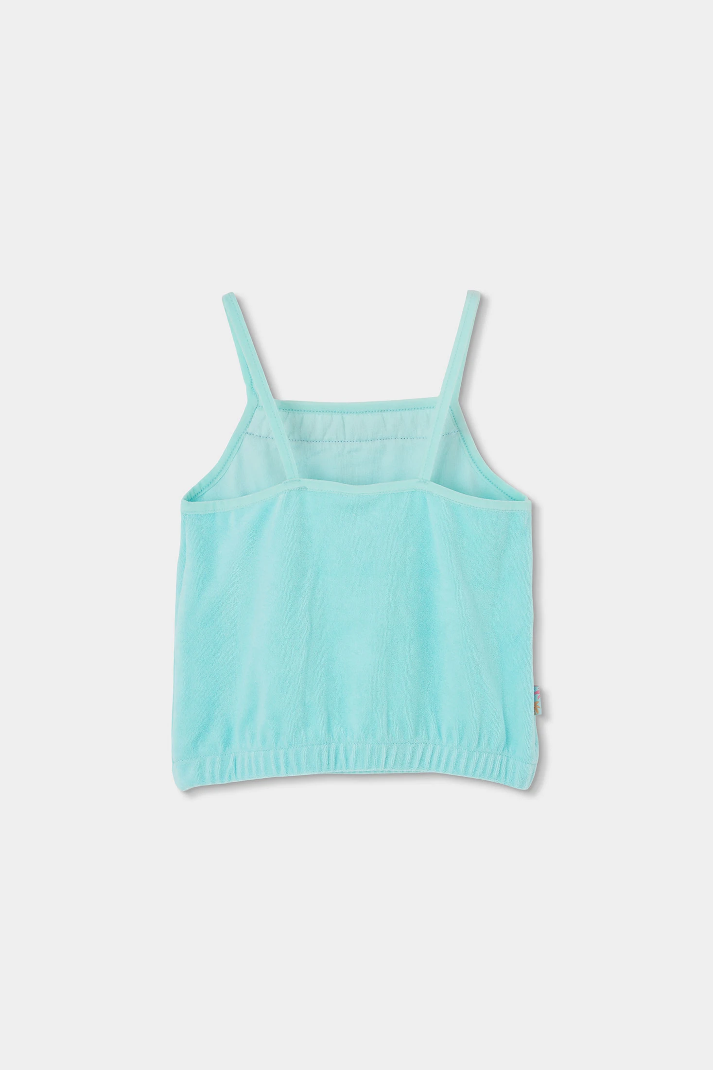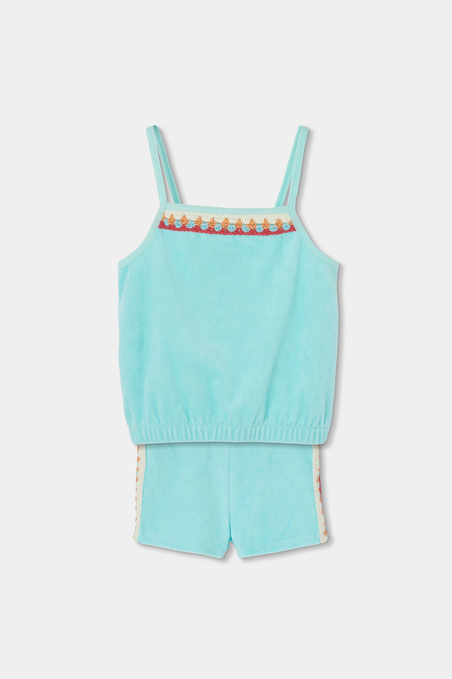 Conjunto de felpa toalla para niña en color turquesa, ideal para el verano, compuesto por un top sin mangas con tirantes finos y shorts, ambos en turquesa, ofrece frescura y comodidad. El top presenta un diseño de detalles coloridos en el pecho. Disponible en tallas desde 12 meses hasta 10 años. El tejido de felpa proporciona suavidad y ligereza, perfecto para días soleados. Opción versátil que se puede combinar con una chaqueta ligera cuando refresca.