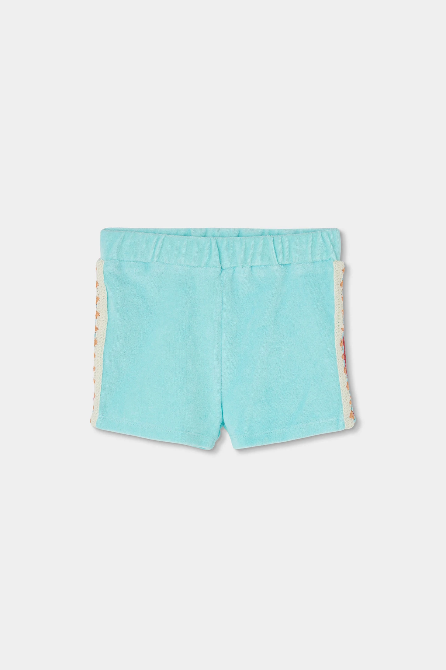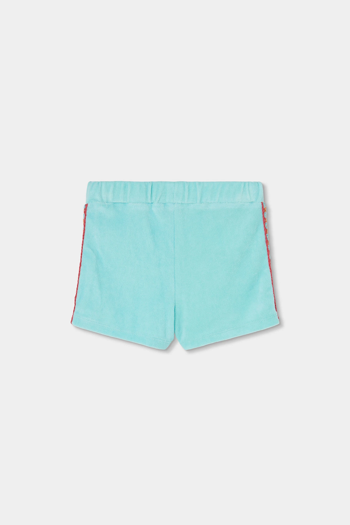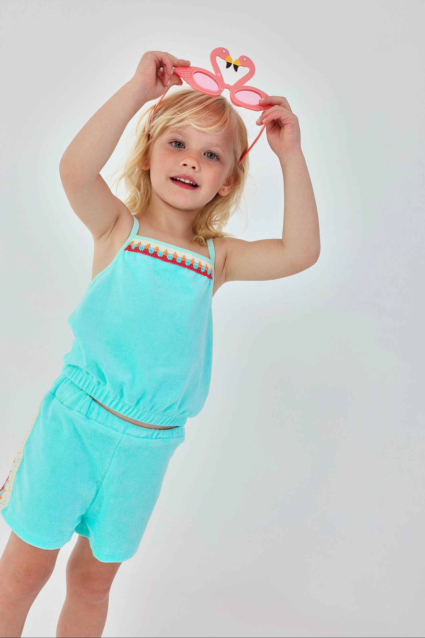 Conjunto de felpa toalla para niña en color turquesa, ideal para el verano, compuesto por un top sin mangas con tirantes finos y shorts, ambos en turquesa, ofrece frescura y comodidad. El top presenta un diseño de detalles coloridos en el pecho. Disponible en tallas desde 12 meses hasta 10 años. El tejido de felpa proporciona suavidad y ligereza, perfecto para días soleados. Opción versátil que se puede combinar con una chaqueta ligera cuando refresca.