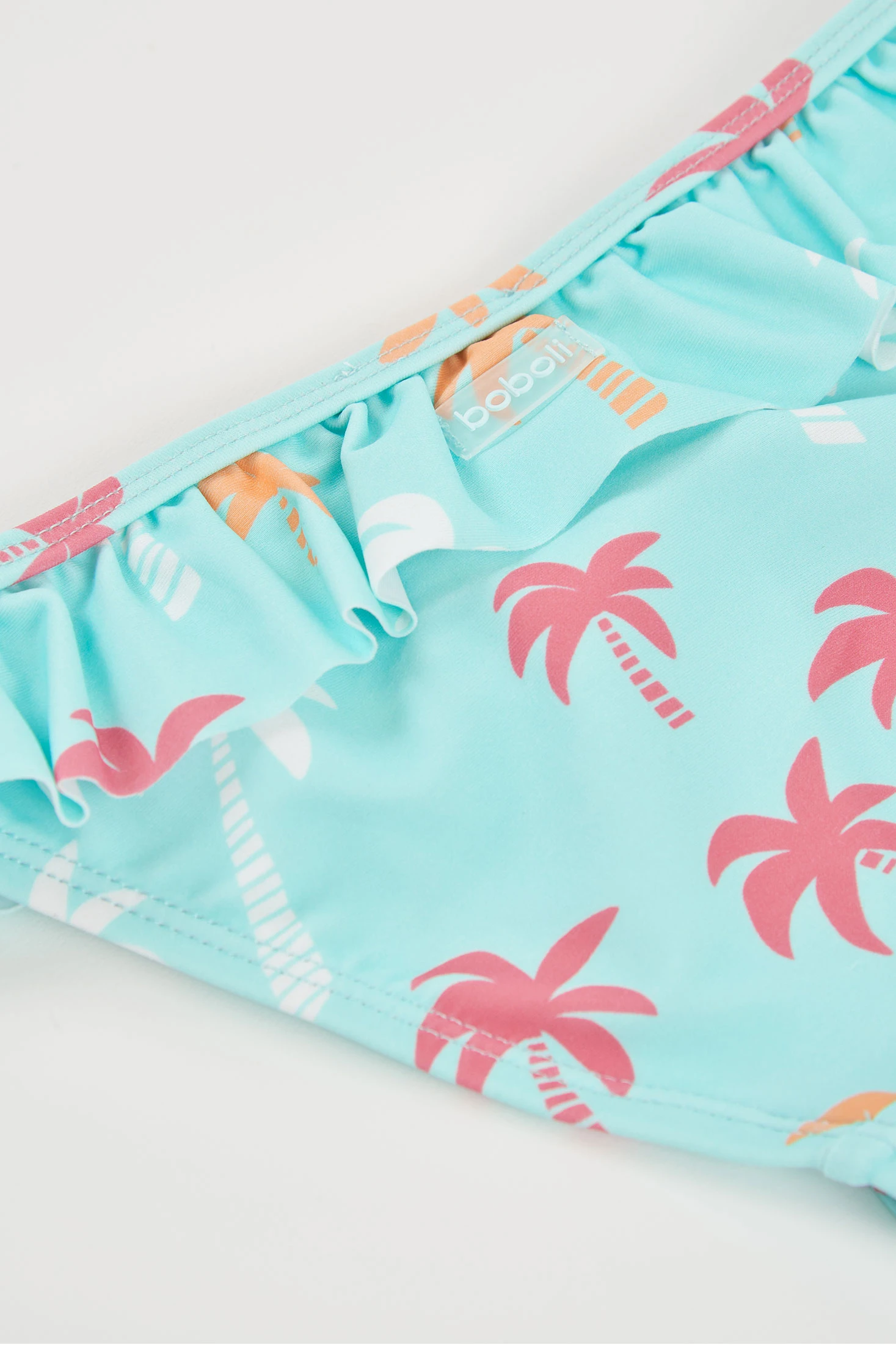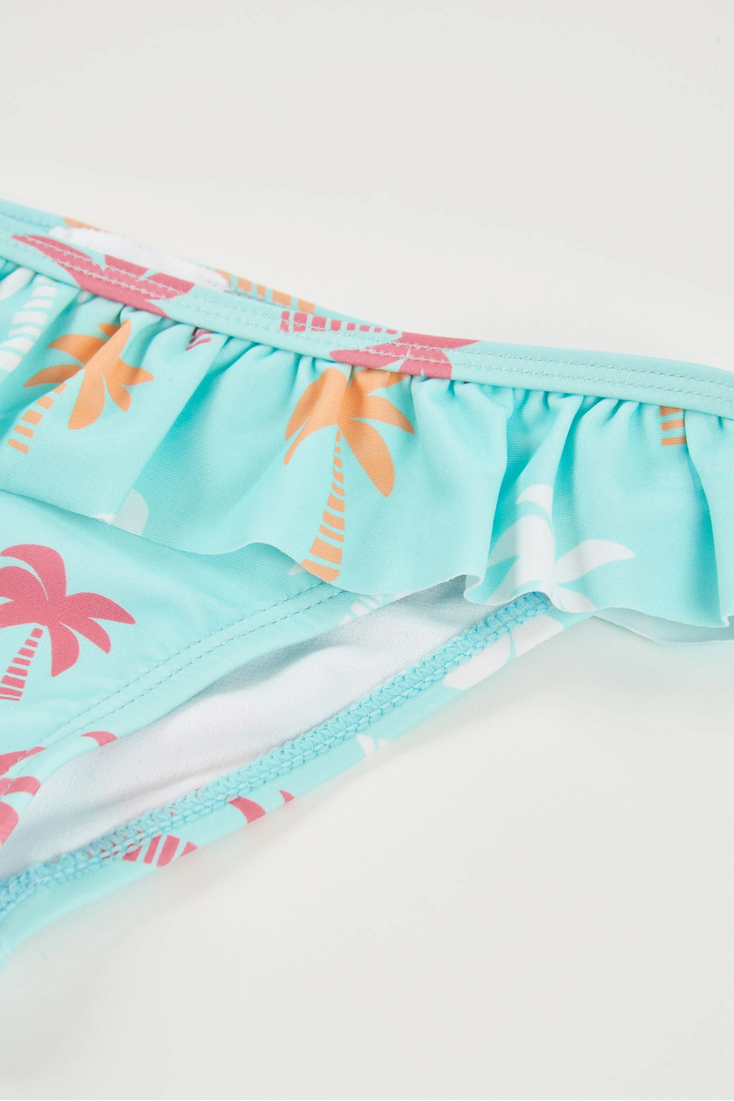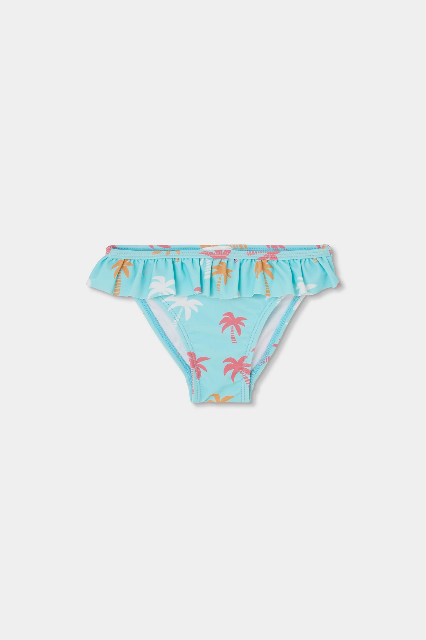 Bañador estampado con palmeras para niña, con protección solar certificada UPF50+, ideal para disfrutar de los días de playa o piscina con total seguridad. Hecho de un material elástico y cómodo, presenta un llamativo color turquesa con estampado de palmeras en tonos rosa, naranja y blanco, añadiendo un toque tropical. Un volante en la cintura le da un toque divertido y femenino. Disponible en tallas desde 12 meses hasta 10 años.