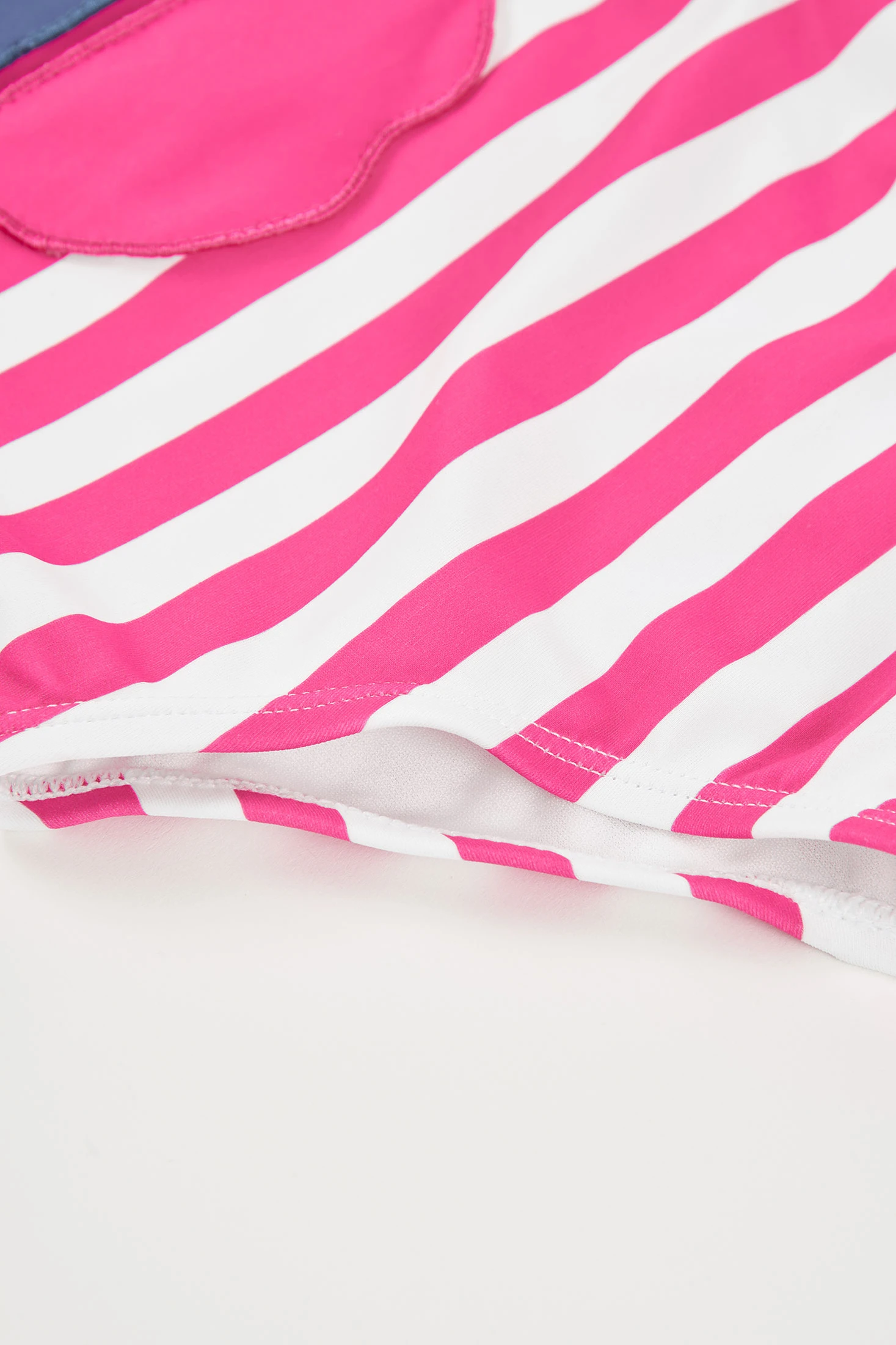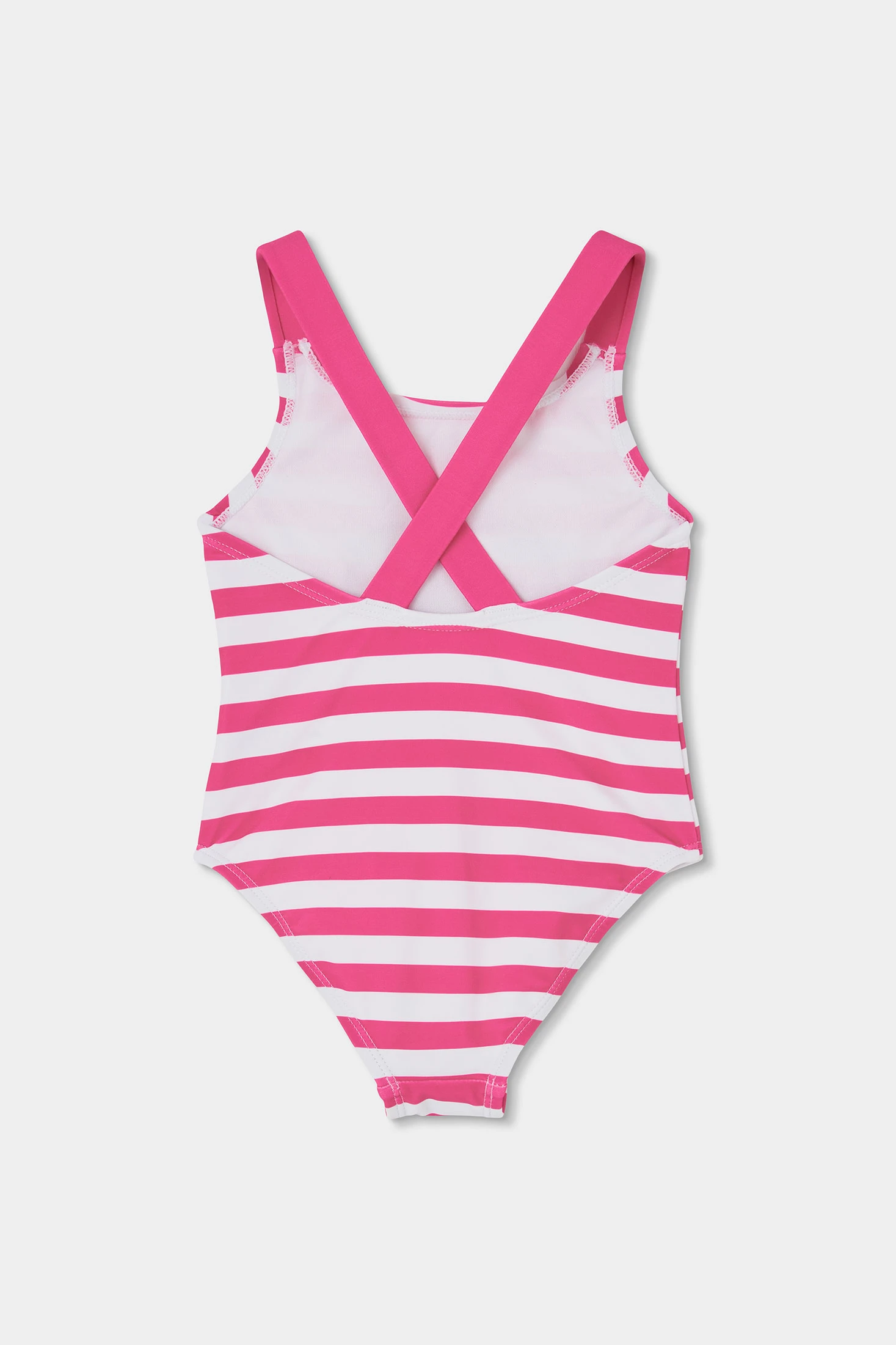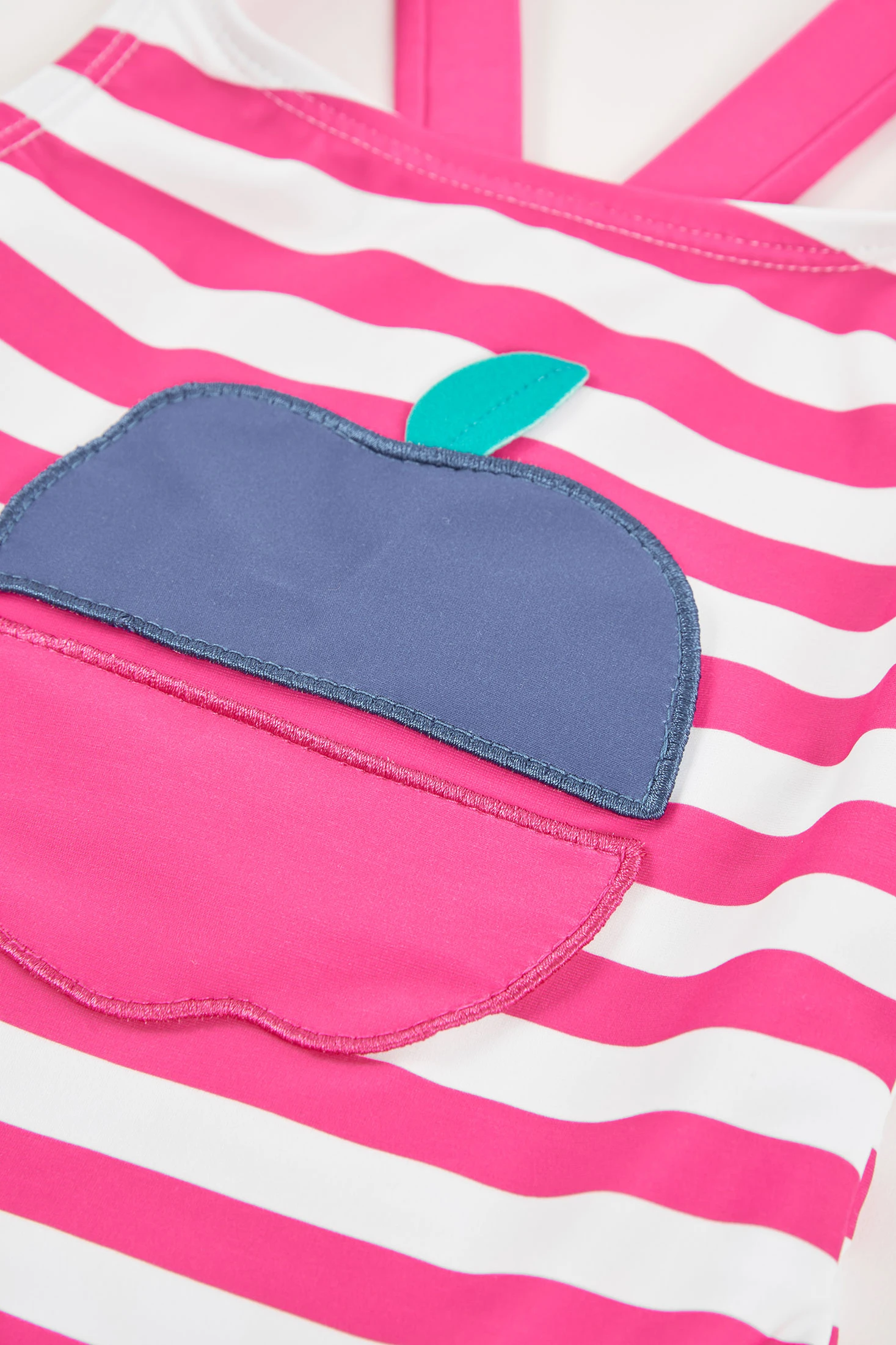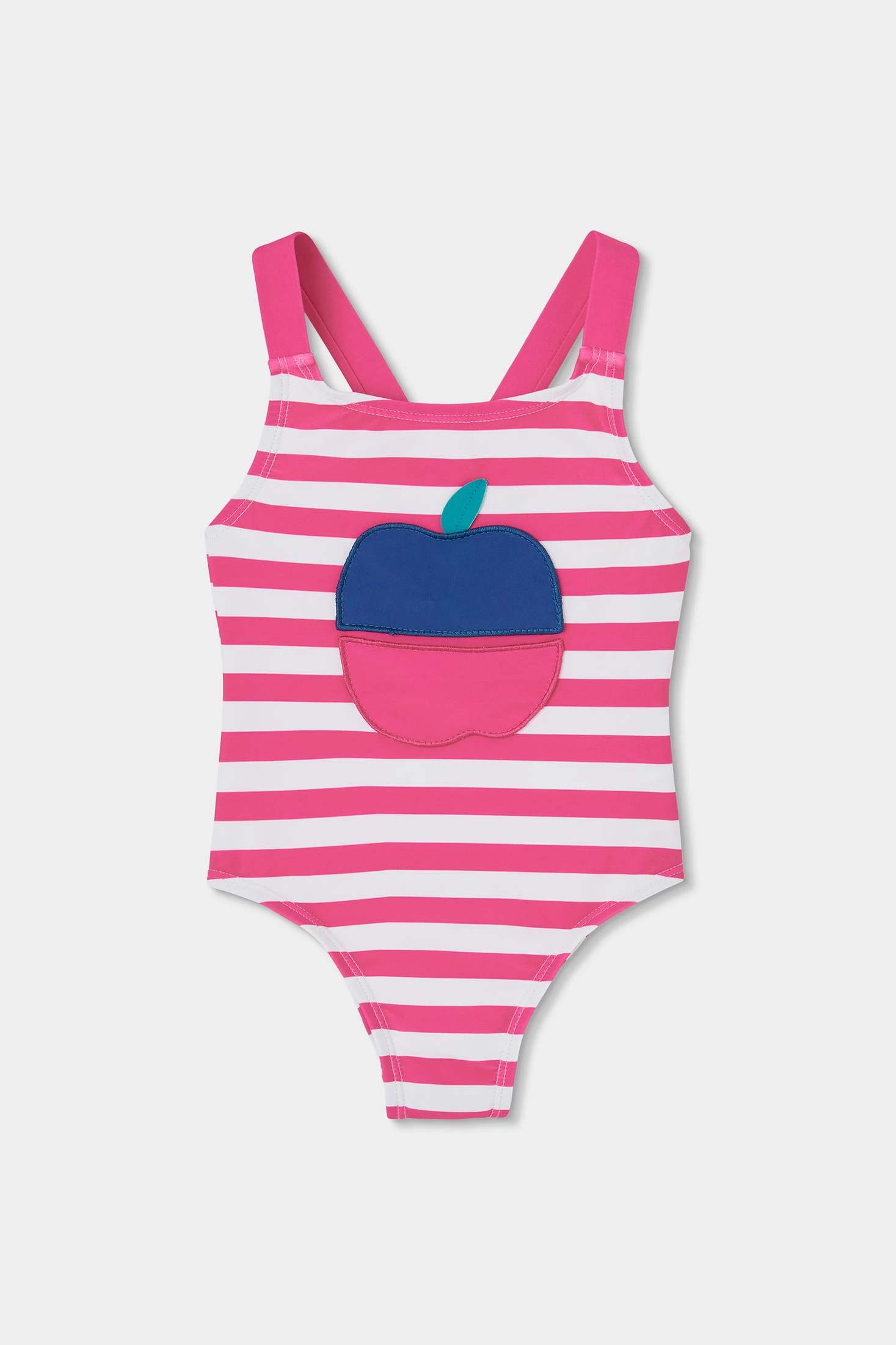 Bañador listado para niña con protección solar certificada UPF50+, diseñado para edades desde 12 meses hasta 14 años. Con un estampado de rayas horizontales en rosa y blanco y una divertida aplicación frontal de manzana en tonos azul y rosa. El material ligero y cómodo, con tirantes anchos para un ajuste seguro, lo hace perfecto para cualquier actividad acuática. Una opción encantadora que combina estilo y funcionalidad para el verano.