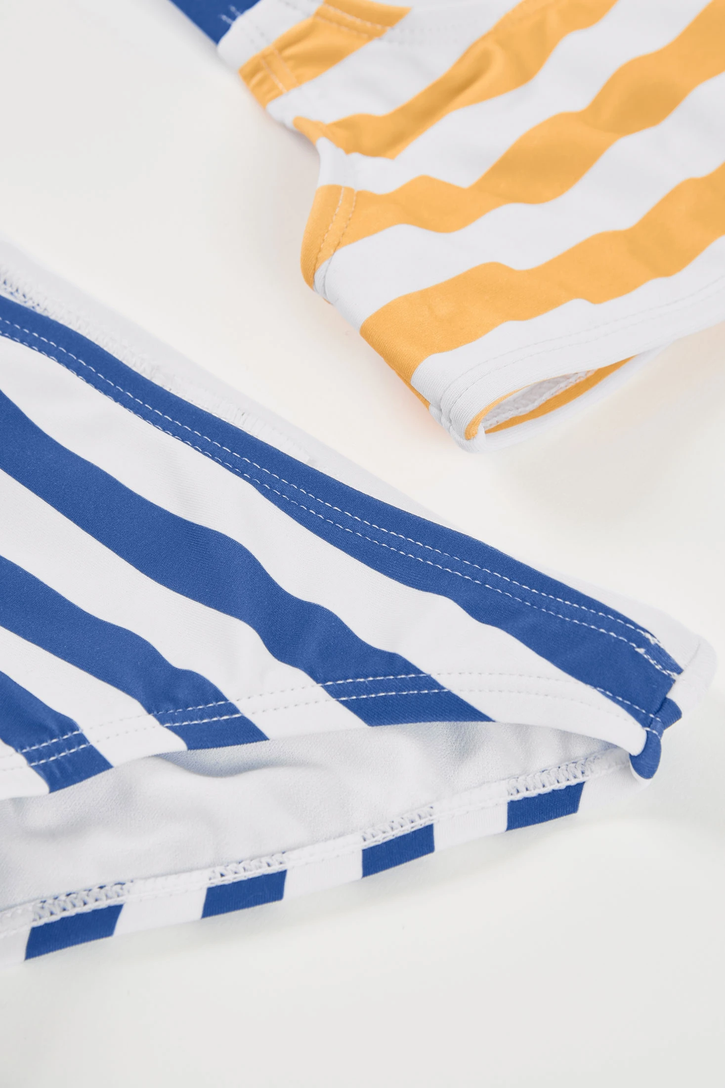 Bikini para niña con protección solar certificada UPF50+, con un diseño de rayas azules y amarillas que aportan un toque veraniego y divertido. Incluye detalles de frutas que añaden un elemento lúdico al conjunto, y tirantes azules que cruzan en la espalda para un ajuste seguro. Fabricado en material resistente al agua que garantiza comodidad y libertad de movimiento. Disponible en tallas desde 12M hasta 14 años.