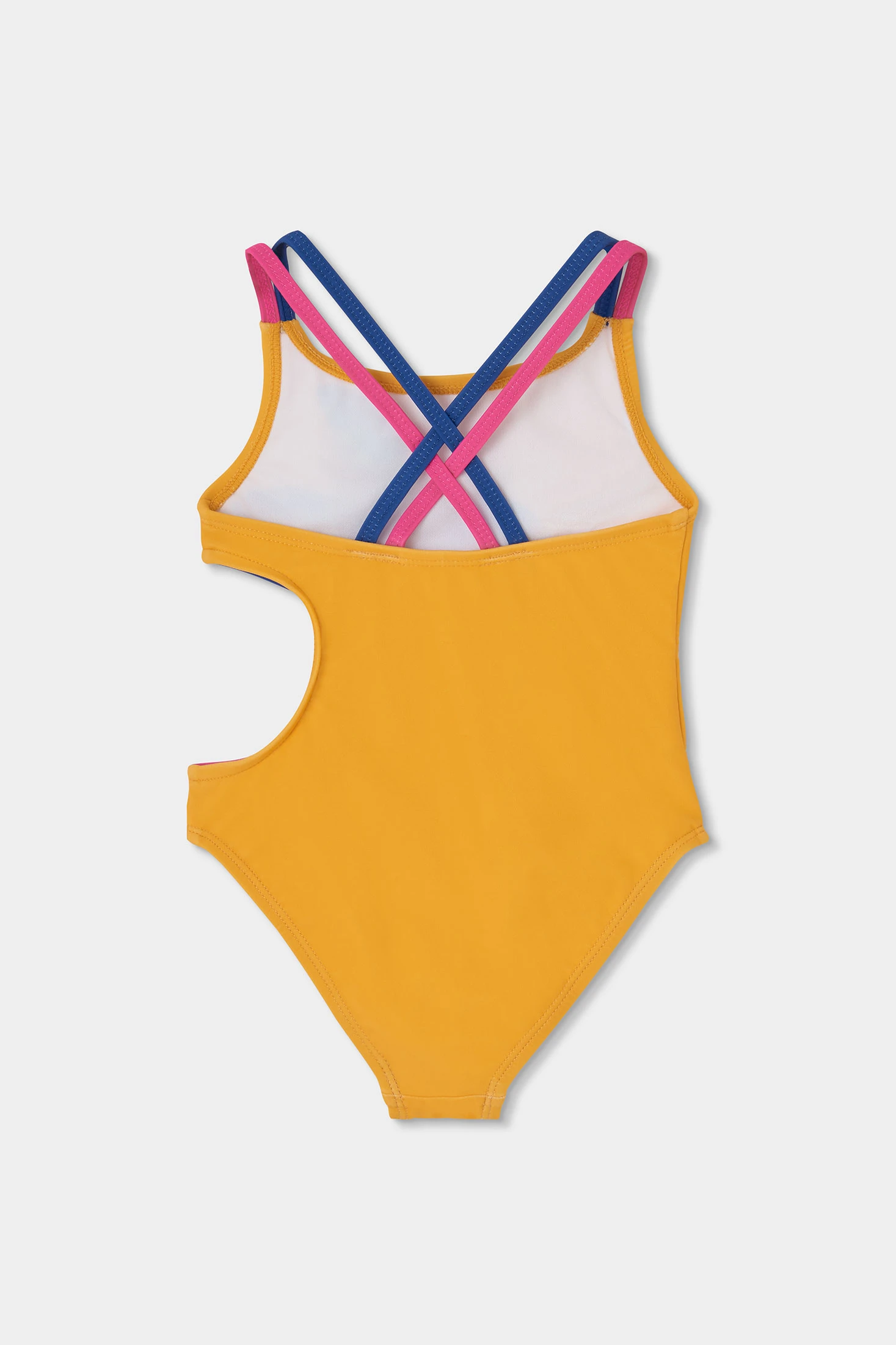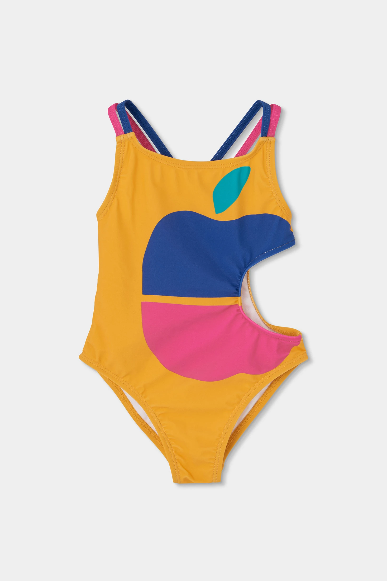 Bañador amarillo para niña con protección solar certificada UPF50+, perfecto para los días de verano. Con un divertido estampado que simula la forma de una fruta, añade un toque colorido y alegre. Su diseño de tirantes proporciona comodidad y libertad de movimiento. Fabricado en material resistente al agua, disponible en tallas desde los 12 meses hasta los 14 años.