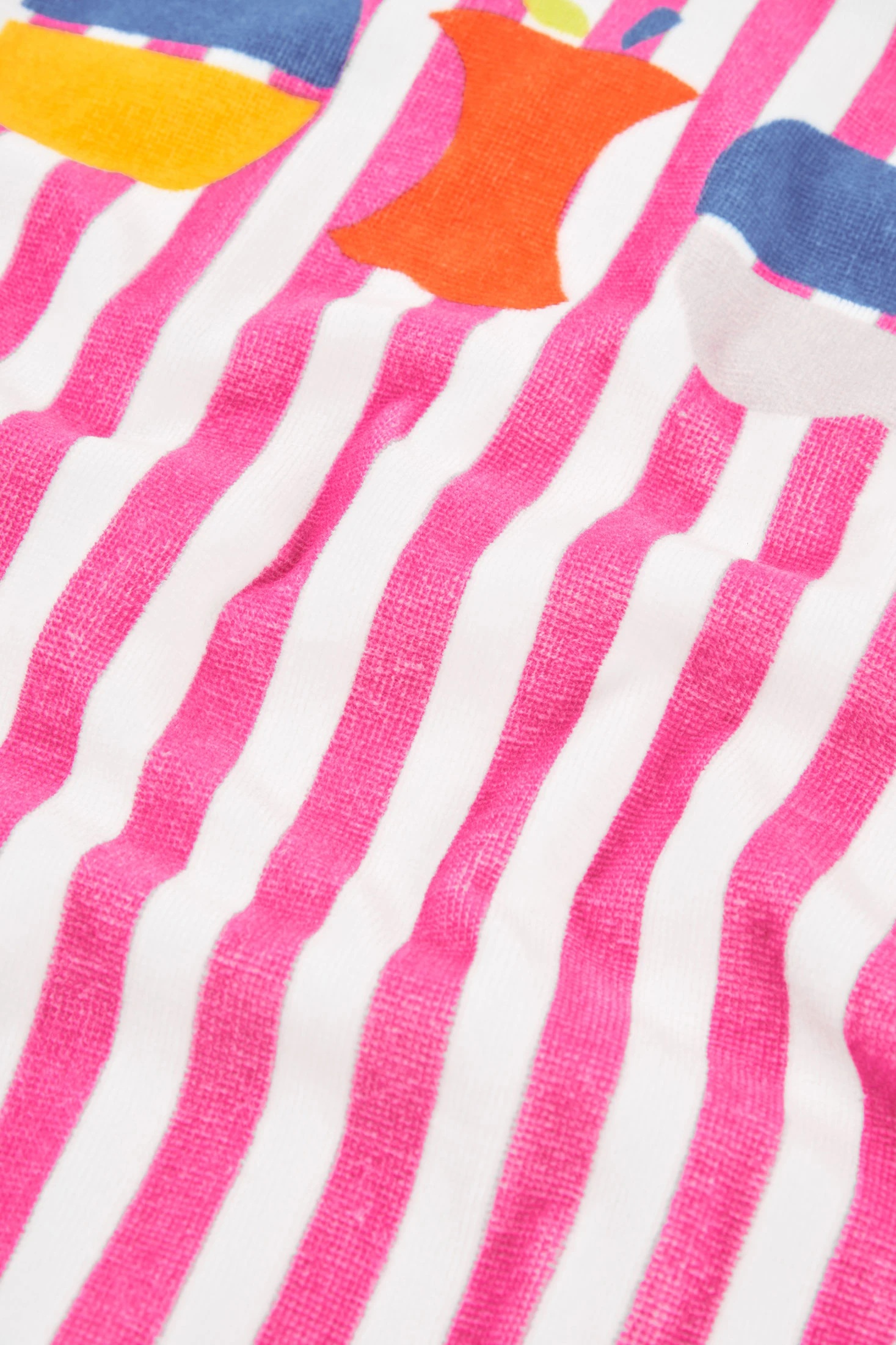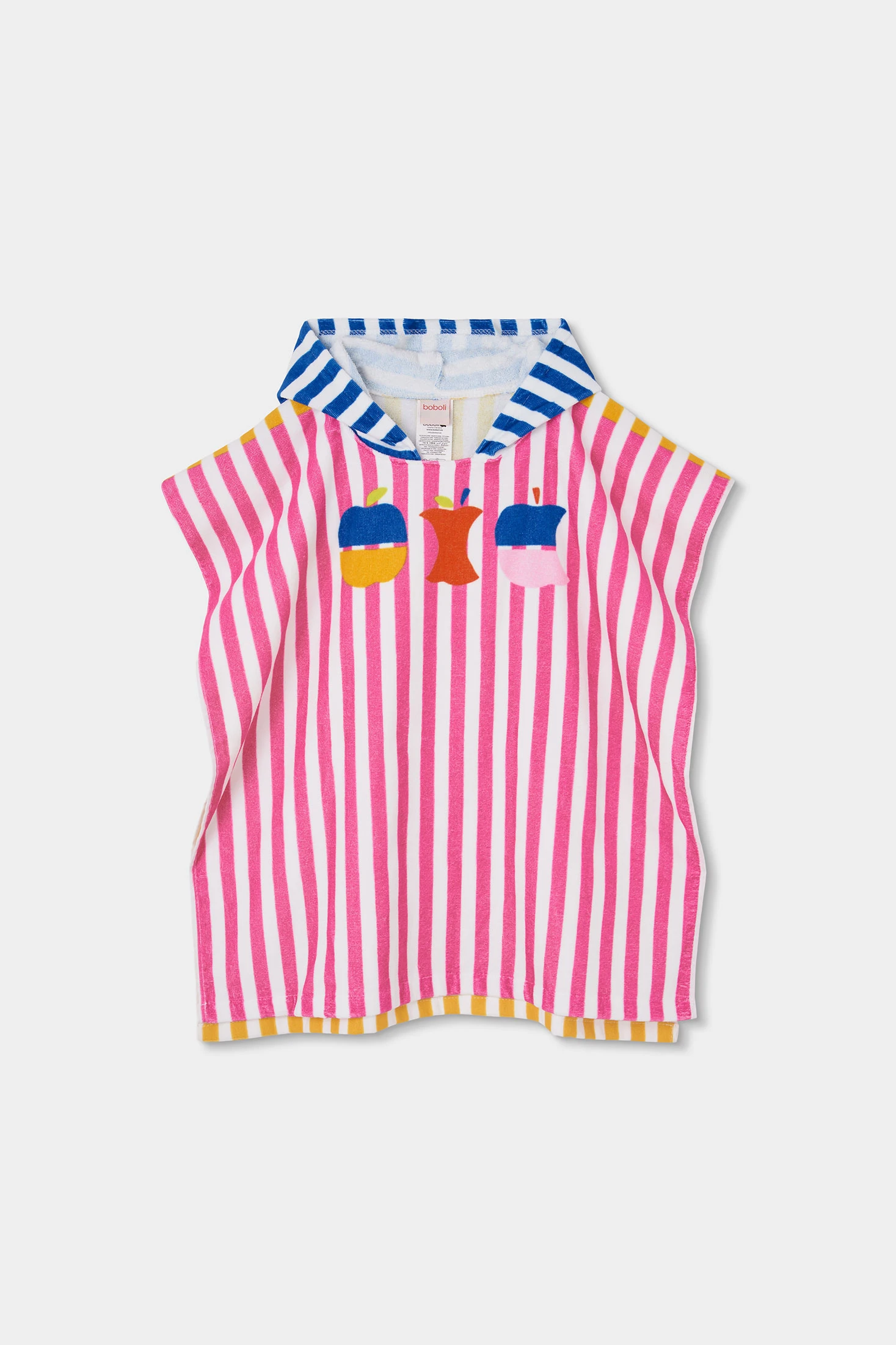 Toalla con capucha de felpa listada para niña, ideal para mantener a tu pequeña calentita después del baño. Confeccionada en suave felpa para asegurar comodidad. Presenta un diseño de rayas en tonos rosas y blancos con coloridos dibujos de frutas que añaden un toque divertido. Perfecta para edades desde 0 meses hasta 2 años. La capucha a rayas azules y blancas proporciona protección adicional contra el frío. Con un estilo vibrante y acogedor, es una opción práctica para hacer que los momentos de baño sean aún más agradables para tu niña.