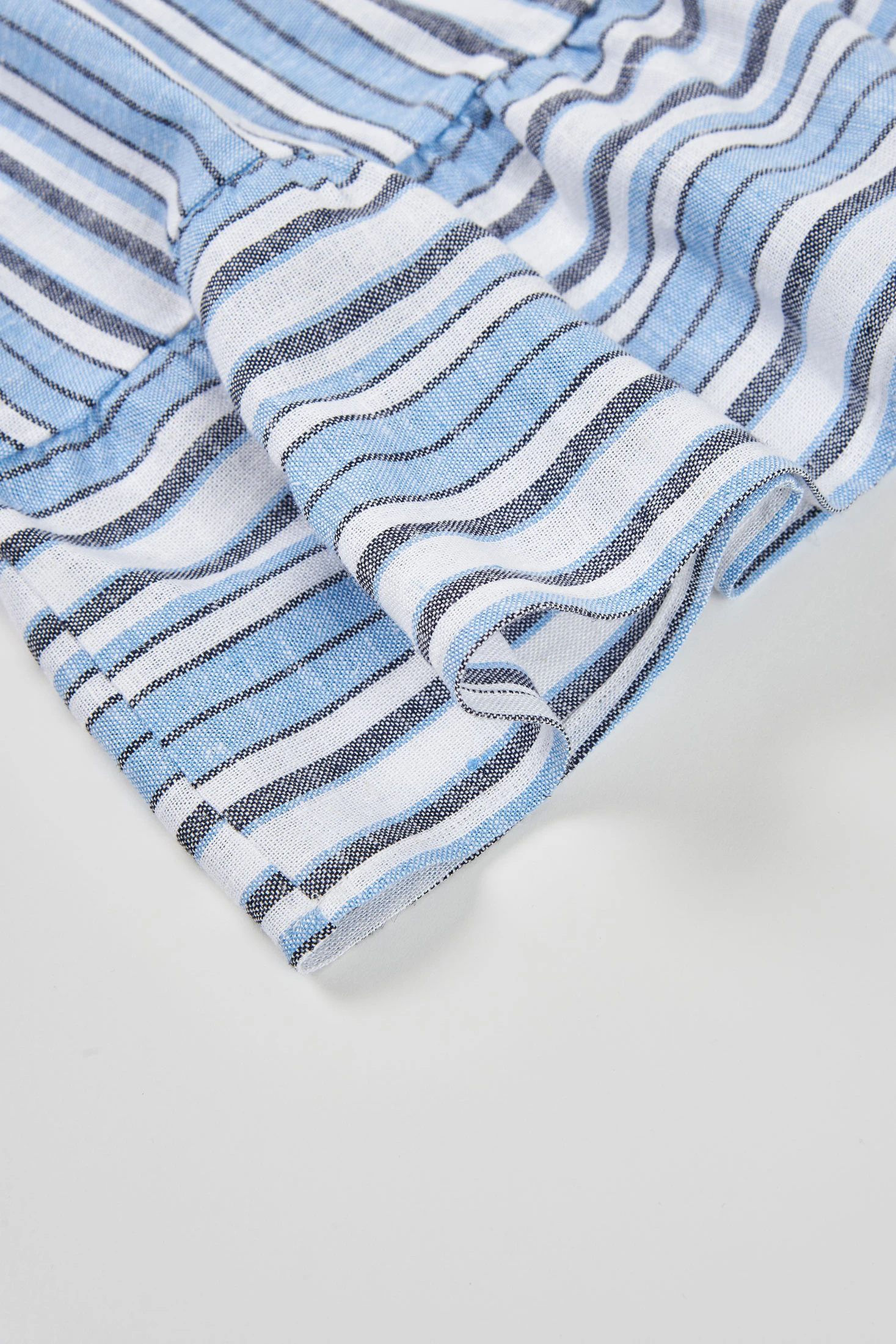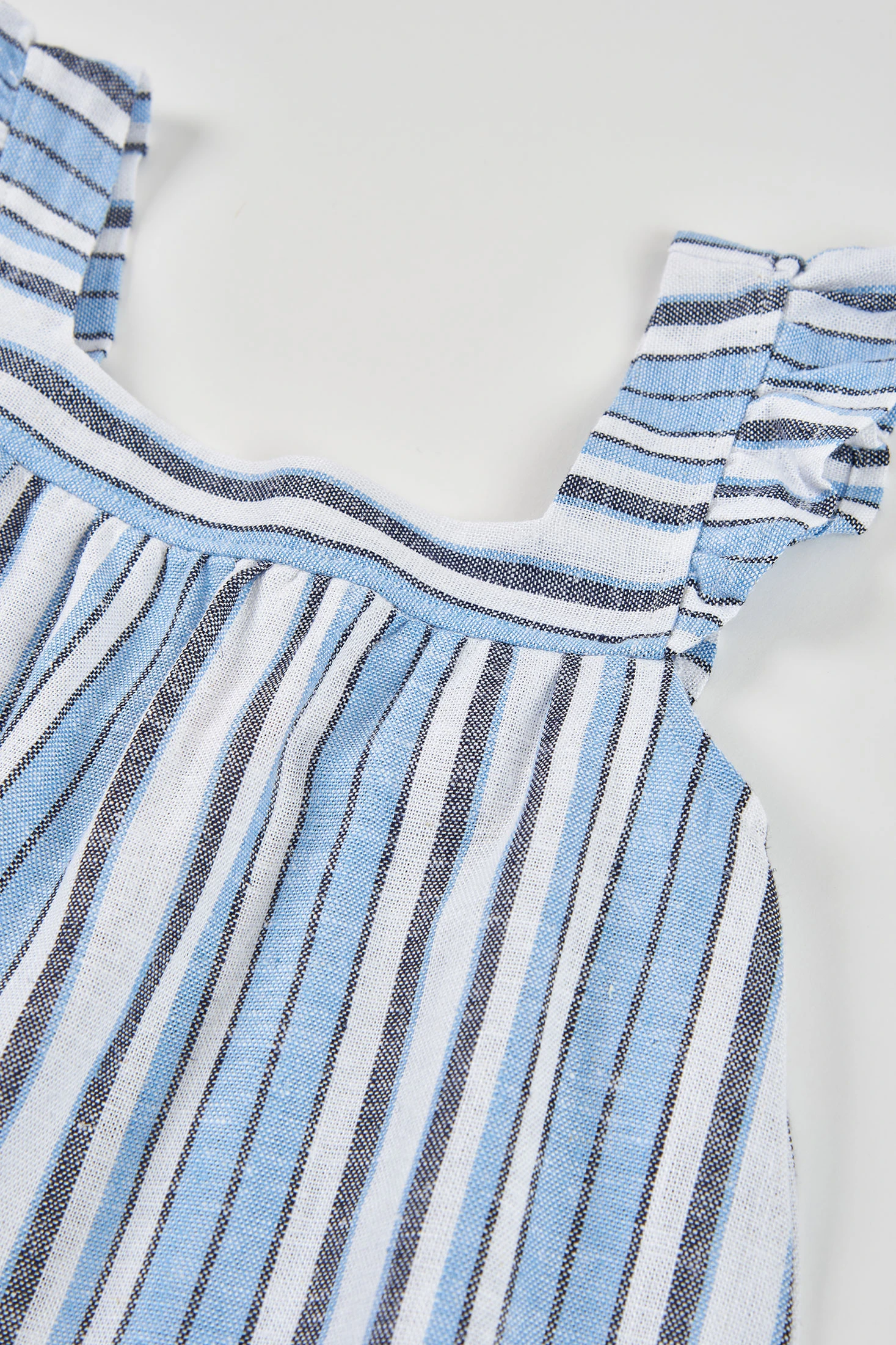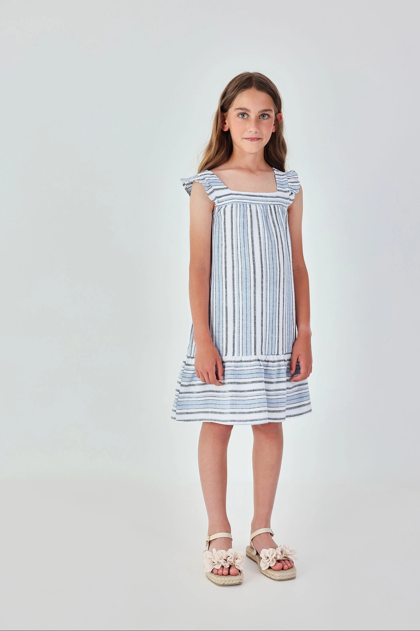 Vestido de lino listado ideal para niñas, disponible desde 12 meses hasta 14 años. Su diseño a rayas en tonos azules y blancos aporta un estilo fresco y veraniego. Con tirantes anchos y detalles de volantes, es perfecto para los días cálidos. La ligereza del lino ofrece comodidad y transpirabilidad. Su corte ligeramente acampanado proporciona libertad de movimiento, siendo una opción versátil para combinar con accesorios simples para un look casual y con estilo durante la temporada estival.
