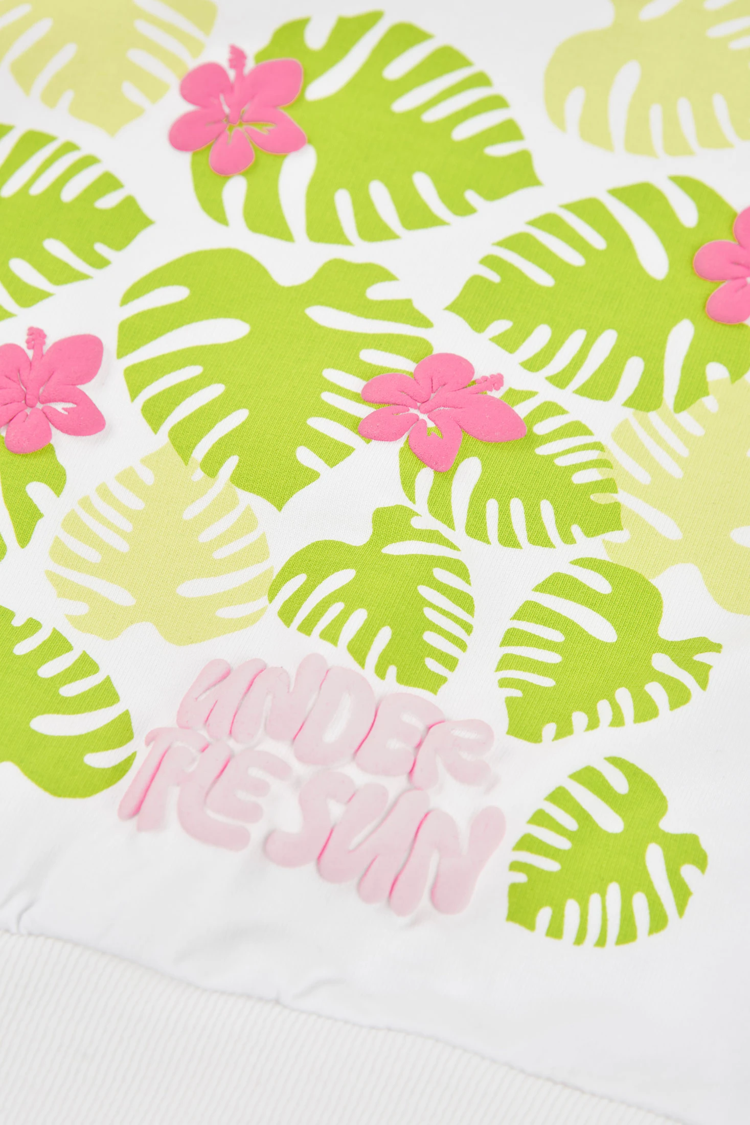 Chaqueta de felpa en color blanco para niña. Perfecta para los primeros días de primavera o las noches de verano donde aún refresca. Confeccionado en un tejido suave, asegura comodidad y libertad de movimiento. Presenta un diseño de hojas verdes enormes en la espalda y una pequeña firma en el pecho. Disponible en tallas desde 2 años hasta 14 años, adaptándose al crecimiento de cada niña.
