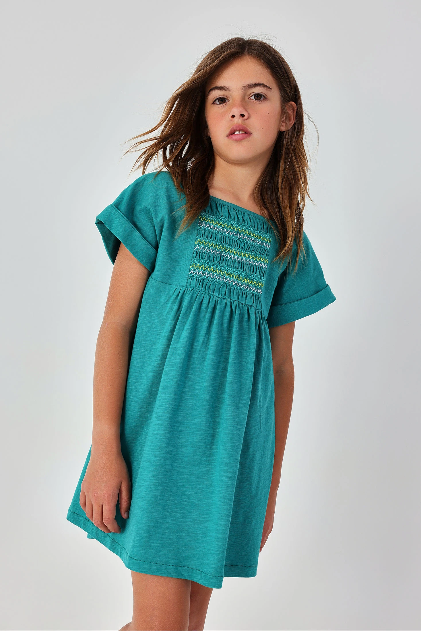 Vestido azul de punto flamé perfecto para la temporada de verano. Diseño con detalle de bordado en el pecho que añade un toque divertido al vestido. Tejido de punto flamé ligero y cómodo, ideal para mantener frescas a las pequeñas en días cálidos. Disponible en tallas desde 2 años hasta 14 años. Mangas cortas que lo hacen práctico y versátil, combinando bien con chaquetas ligeras o leggins para días más frescos. Color azul vibrante que lo hace destacar, siendo una elección perfecta para cualquier ocasión informal.