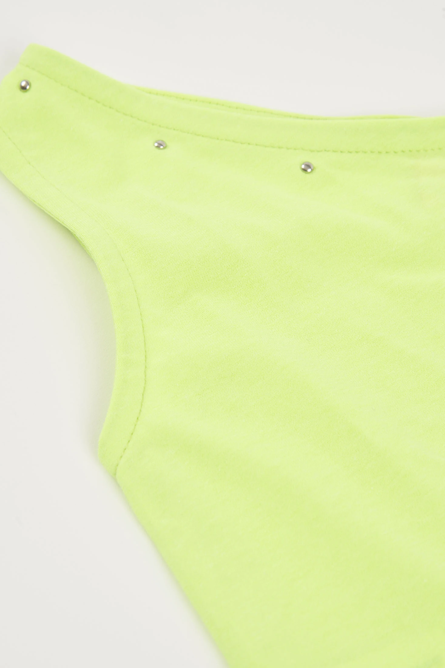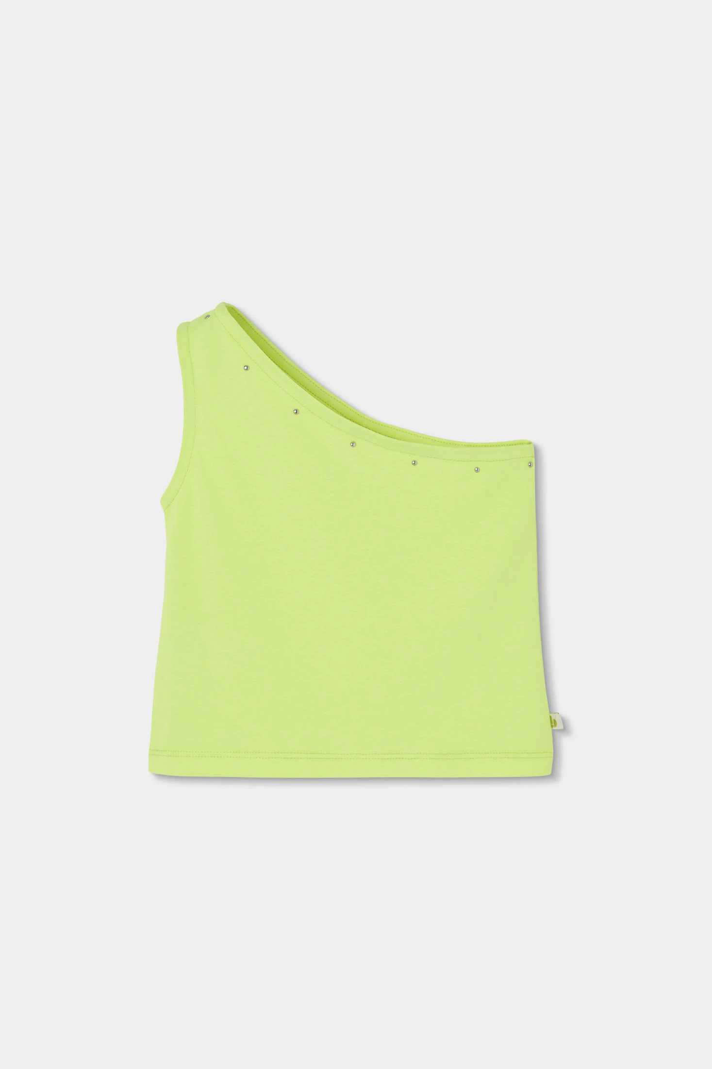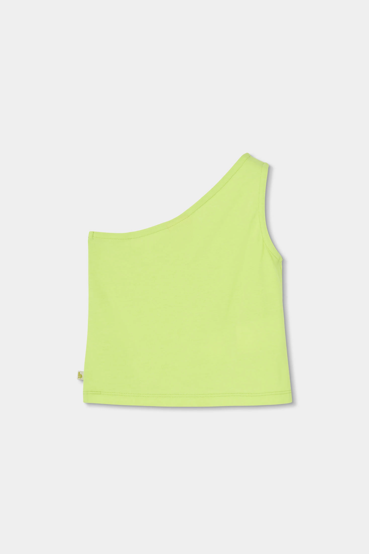 Camiseta con tirante ancho de un solo hombro para niña, ideal para el verano. Fabricada en un material elástico, ofrece comodidad y libertad de movimiento. Su diseño en color verde neón y detalles de pequeñas aplicaciones brillantes en el borde del escote aportan un toque moderno y llamativo. Disponible en tallas desde 2 años hasta 14 años, es perfecta para crear un conjunto fresco y estiloso. Se puede combinar fácilmente con pantalones cortos o faldas para un look veraniego y lleno de energía.