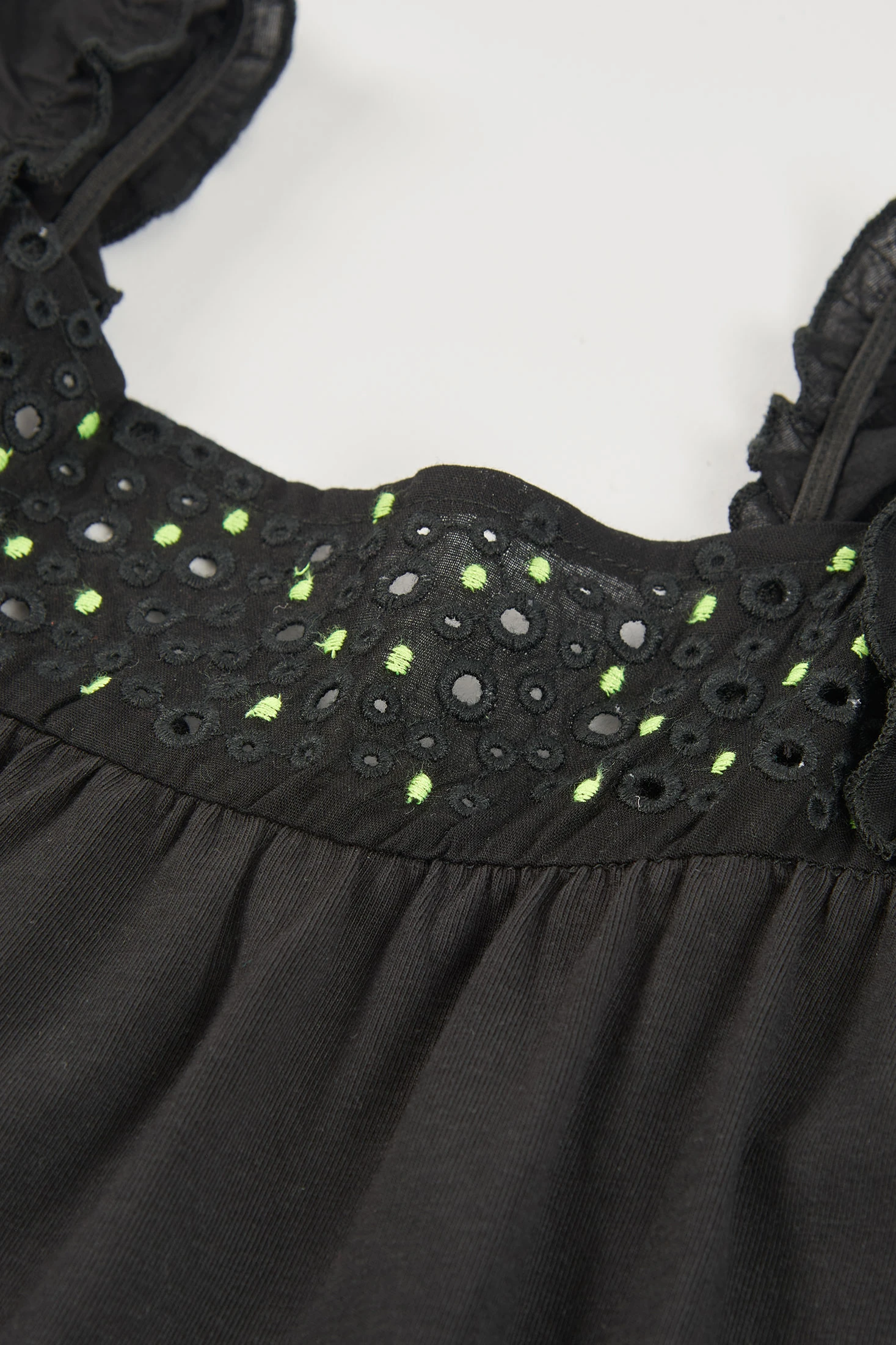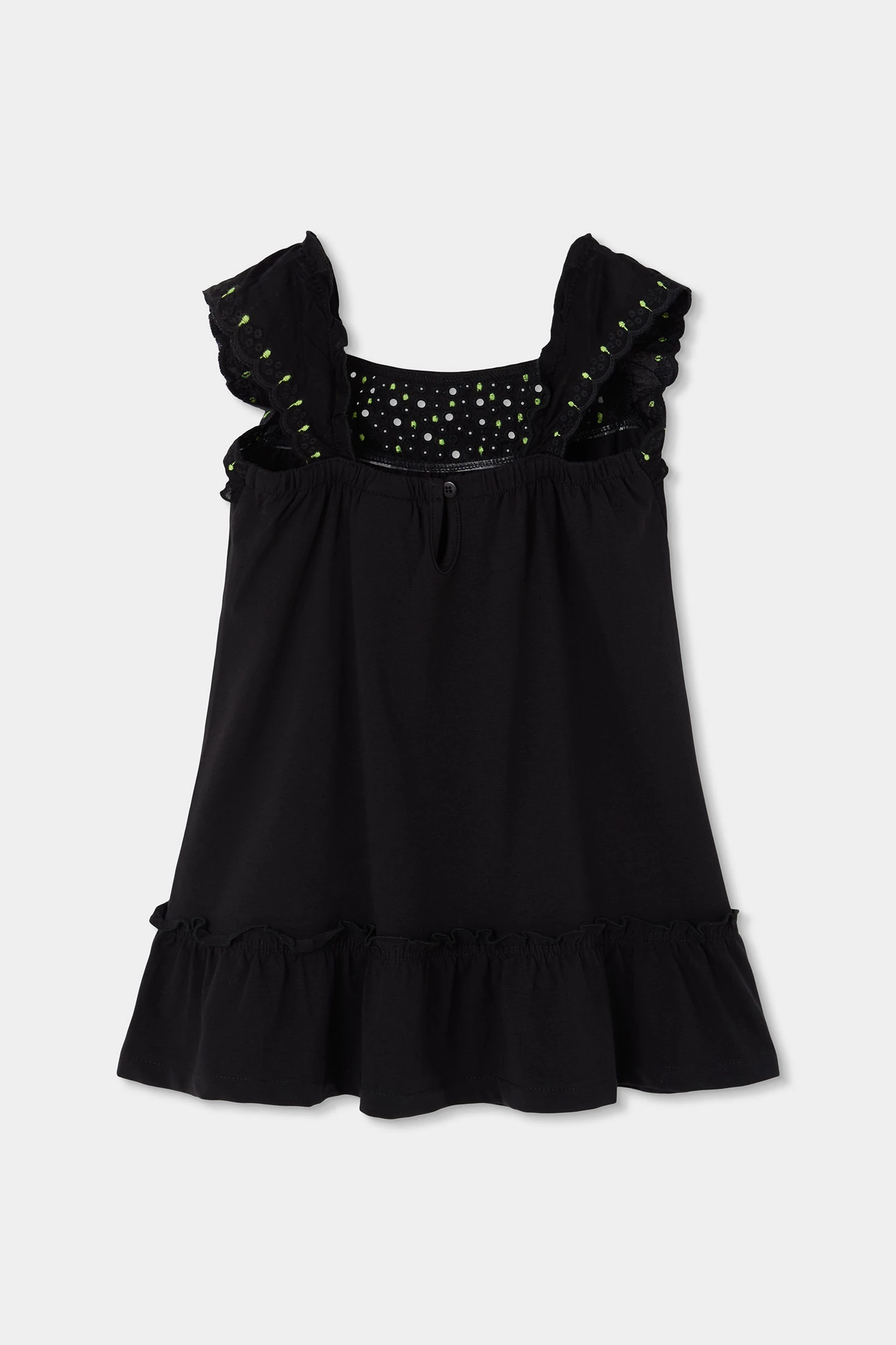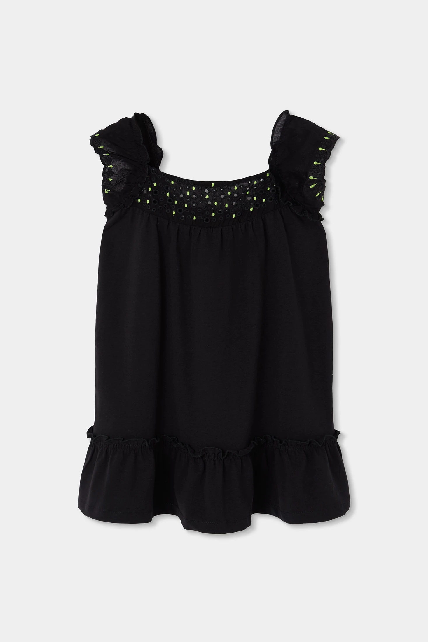 Vestido de punto negro para niña, ideal para la temporada de primavera verano. Su diseño es sencillo pero elegante, con detalles de volantes en los tirantes y un pieza bordada y troquelada en el pecho. Los bordados son en color negro a tono con el vestido. En el bajo tiene un volantes que aporta un detalle estiloso y moderno al vestido. Confeccionado en tejido suave, asegura comodidad para el día a día. Las tallas disponibles van desde los 2 años hasta los 14 años.