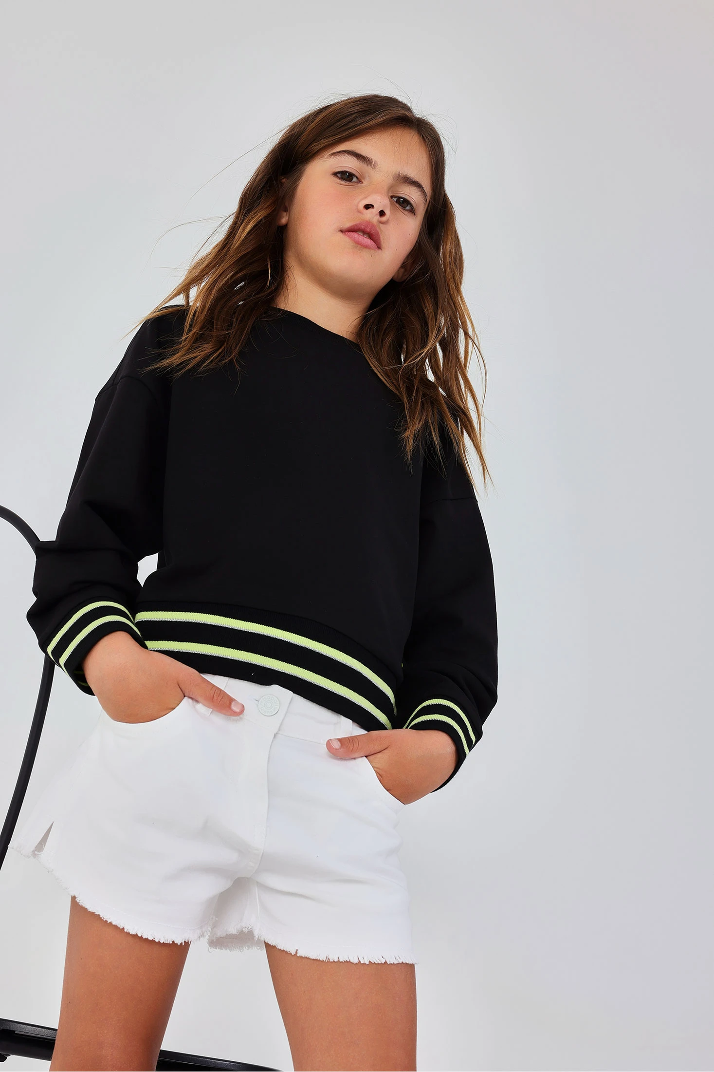 Sudadera de felpa negra para niña, perfecta para los días más frescos de la primavera y las noches de verano. Con un diseño sencillo y elegante, cuenta con detalles de rayas verdes neón en los canalés de los puños y el bajo que añaden un toque moderno. Tiene un cuello redondo y mangas largas, ideal para un estilo casual y versátil. Disponible en tallas desde los 2 años hasta los 14 años, es una opción práctica para combinar con diferentes prendas y estilos.