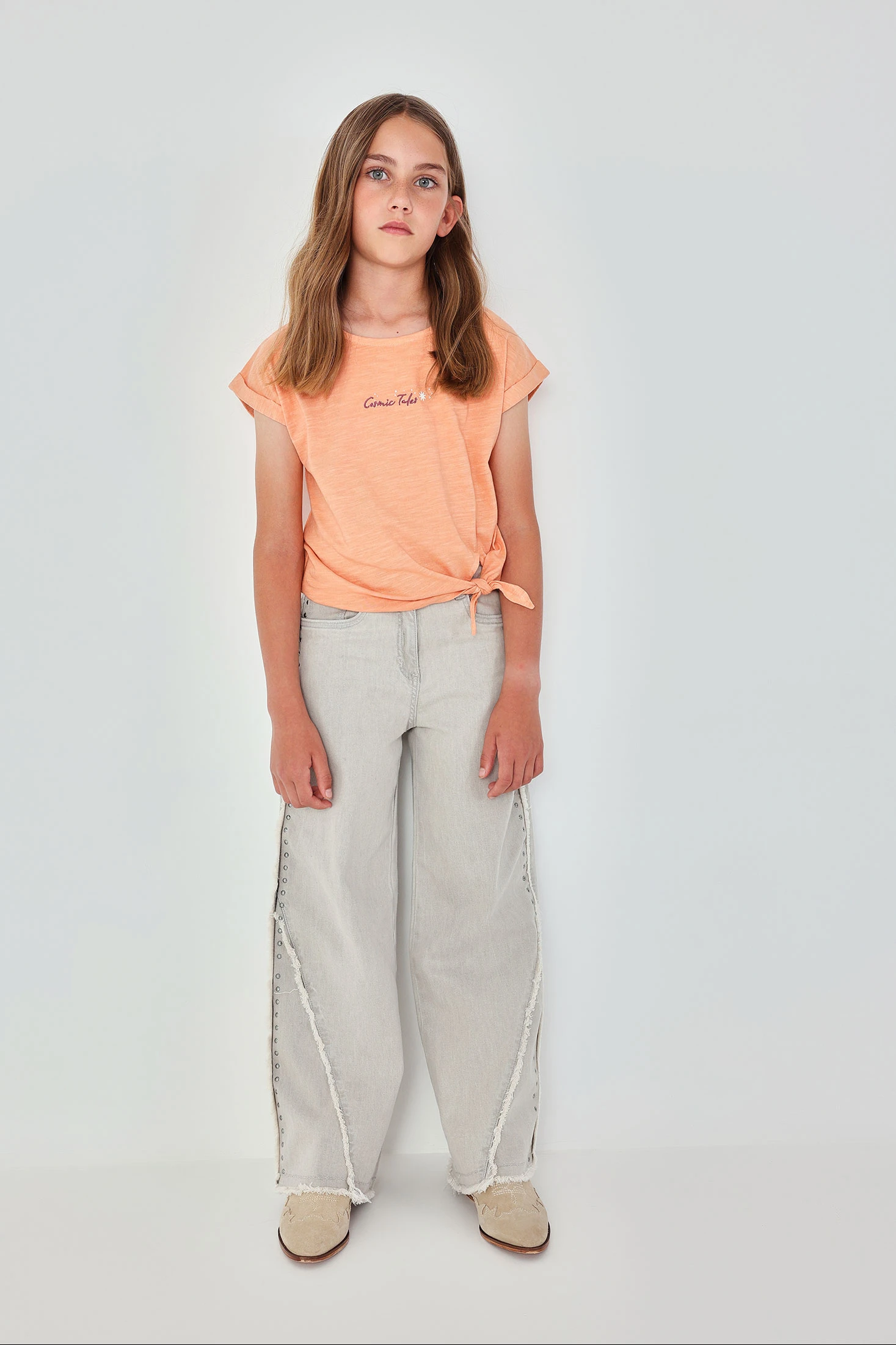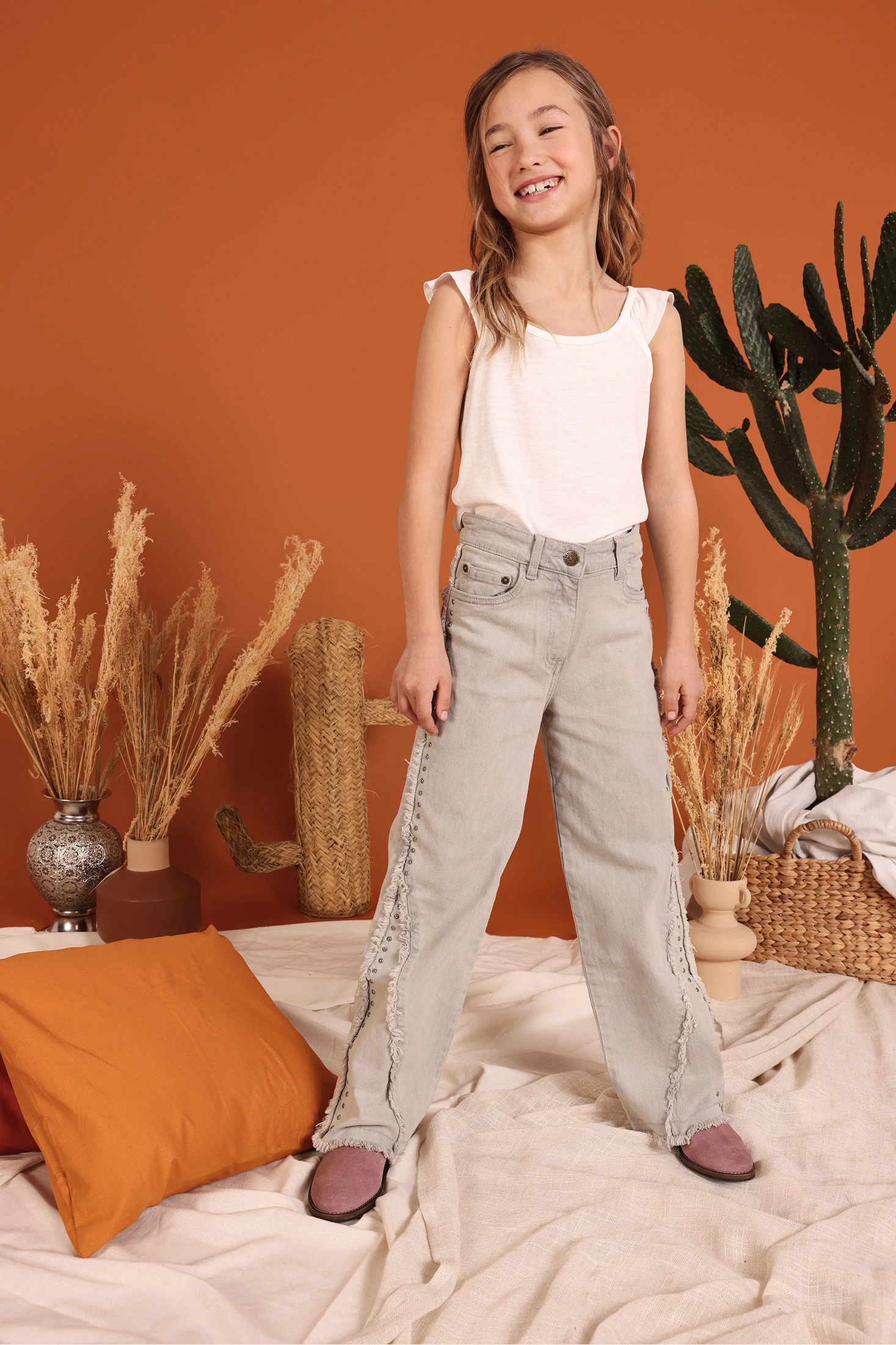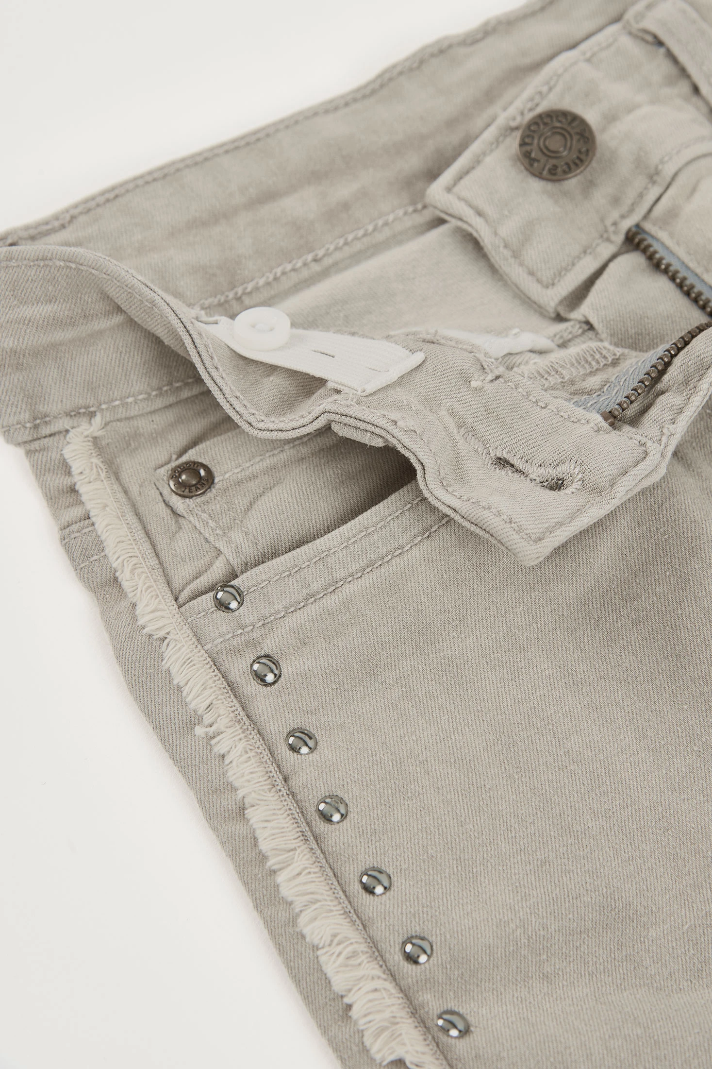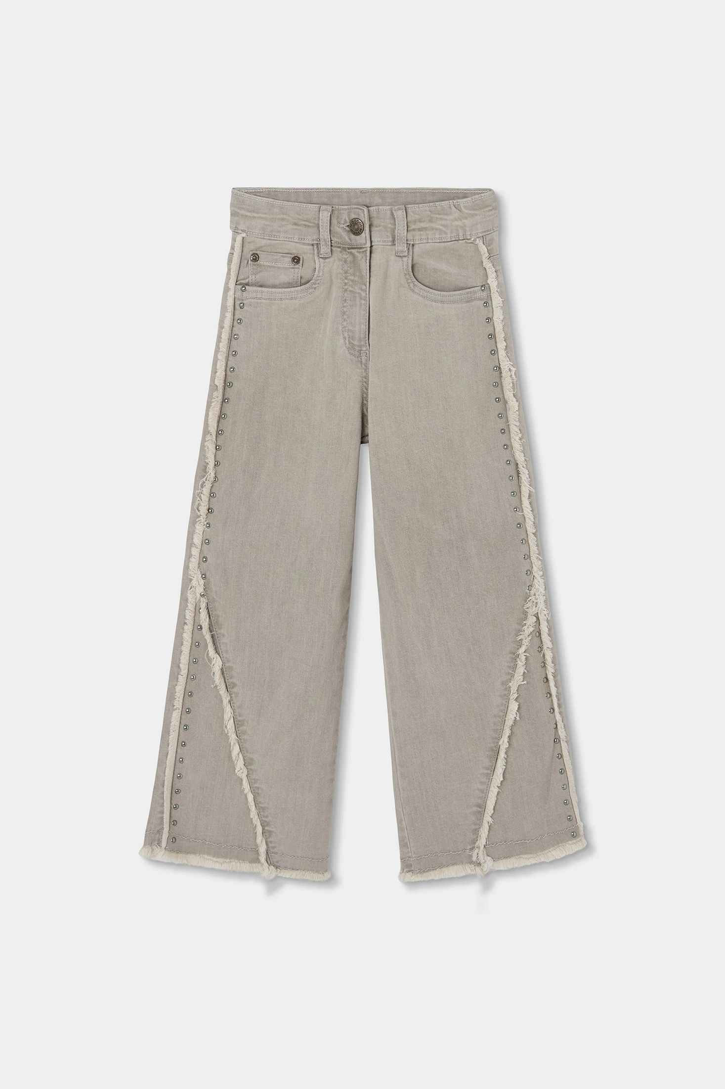 Pantalón denim gris para niña ideal para un look moderno y versátil. Confeccionado en material de alta calidad, ofrece durabilidad y comodidad. Su diseño destaca con detalles de chapitas metálicas decorativas y un acabado deshilachado en los bordes, perfecto para un estilo casual chic. Disponible en tallas desde 2 años hasta 14 años, se adapta a diferentes edades. Su color neutro facilita las combinaciones con camisetas y suéteres de varios estilos. Es una opción práctica y estilizada para el uso diario.