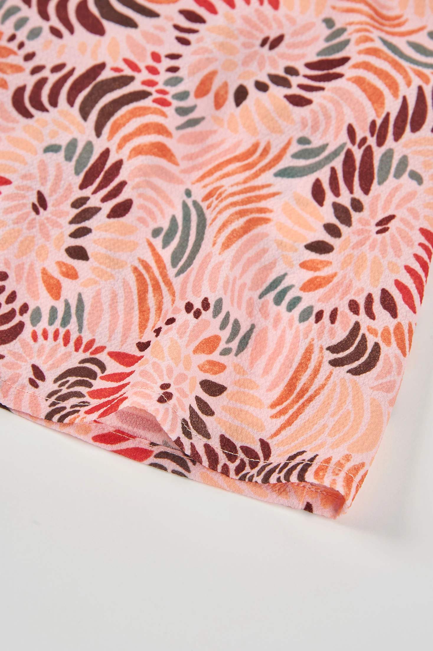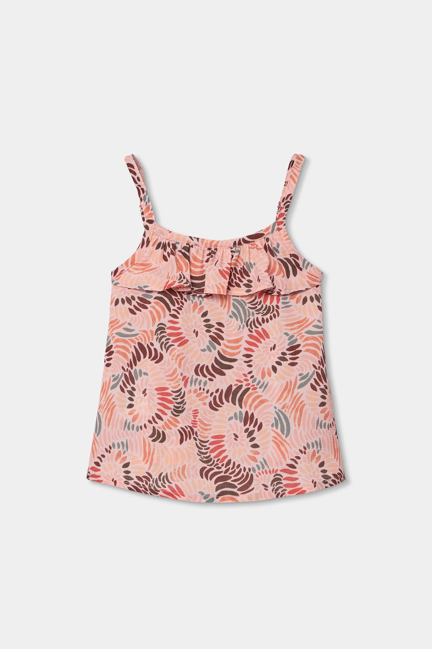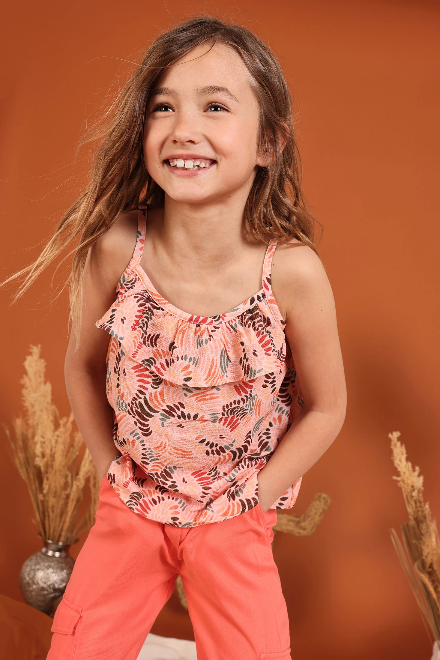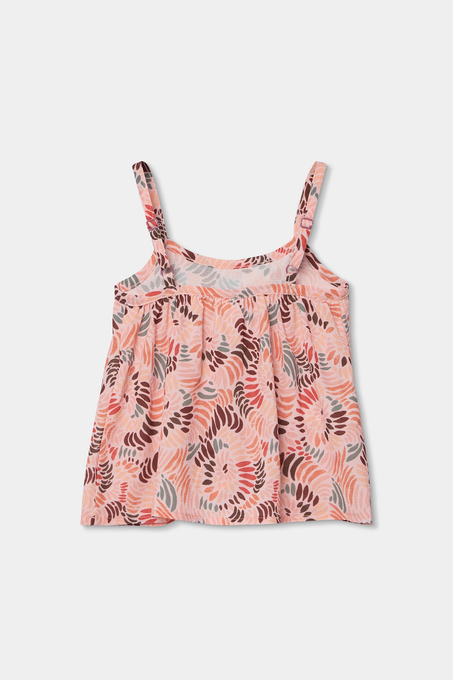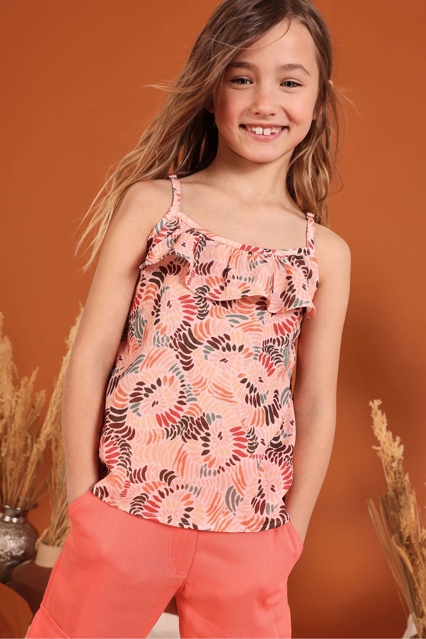 Top de tejido crepe para niña ideal para la temporada cálida. En un delicado color salmón con estampado abstracto, combina comodidad y estilo. El material asegura frescura y ligereza. Incluye tirantes finos y un volante en el escote de la prenda. Disponible en tallas desde 2 años hasta 12 años, se adapta perfectamente a diferentes edades. Perfecto para combinar con pantalones o faldas.