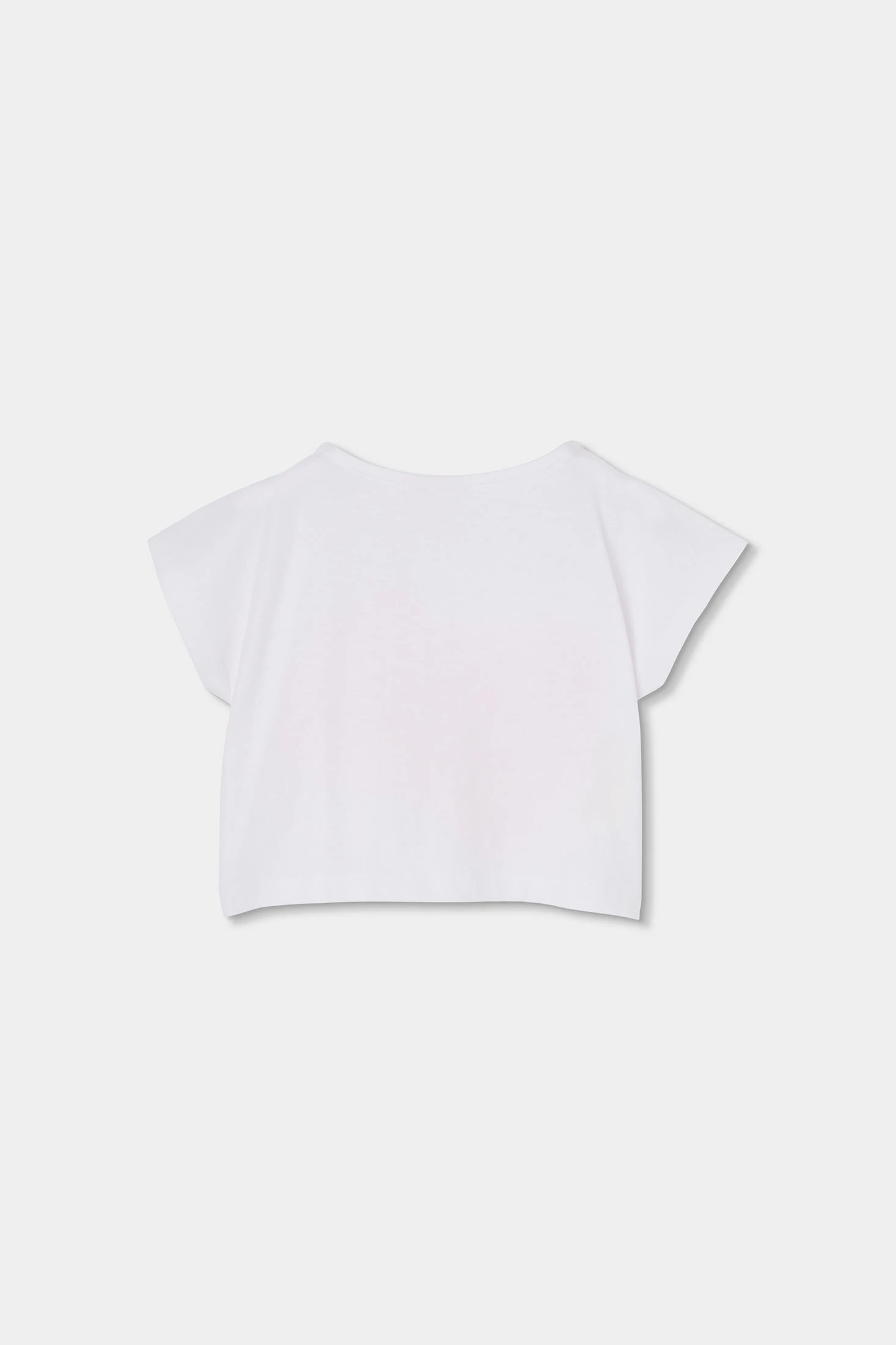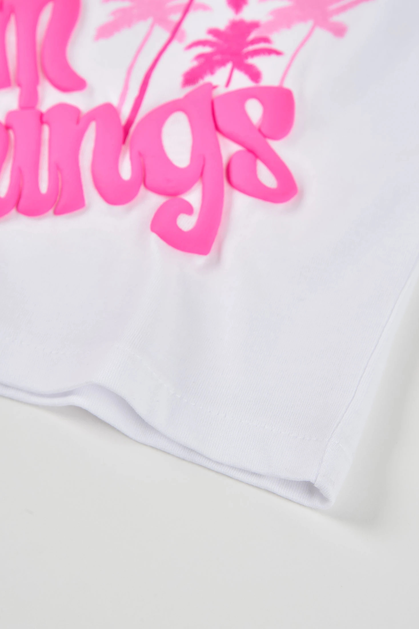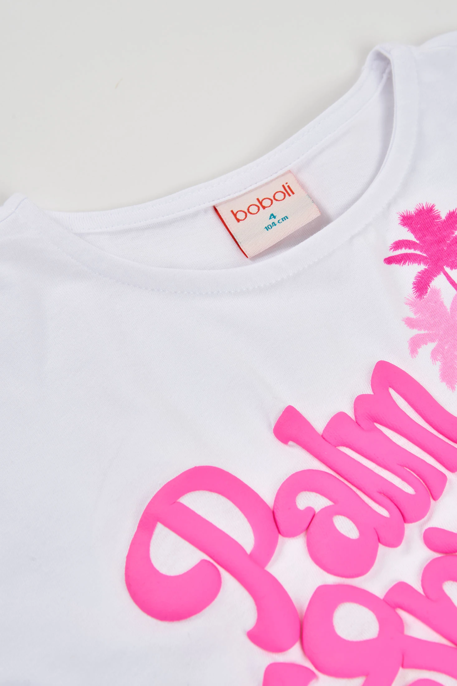 Camiseta de punto de algodón para niña ideal para crear un look fresco y cómodo. En color blanco, presenta un diseño con texto y palmeras en color rosa flúor que añade un toque divertido y moderno. La camiseta es de manga corta y cuello redondo, perfecta para los meses más cálidos. Disponible en tallas desde los 2 años hasta los 14 años, es versátil y se adapta a diferentes estilos. Combínala con jeans o shorts para un estilo casual y veraniego.