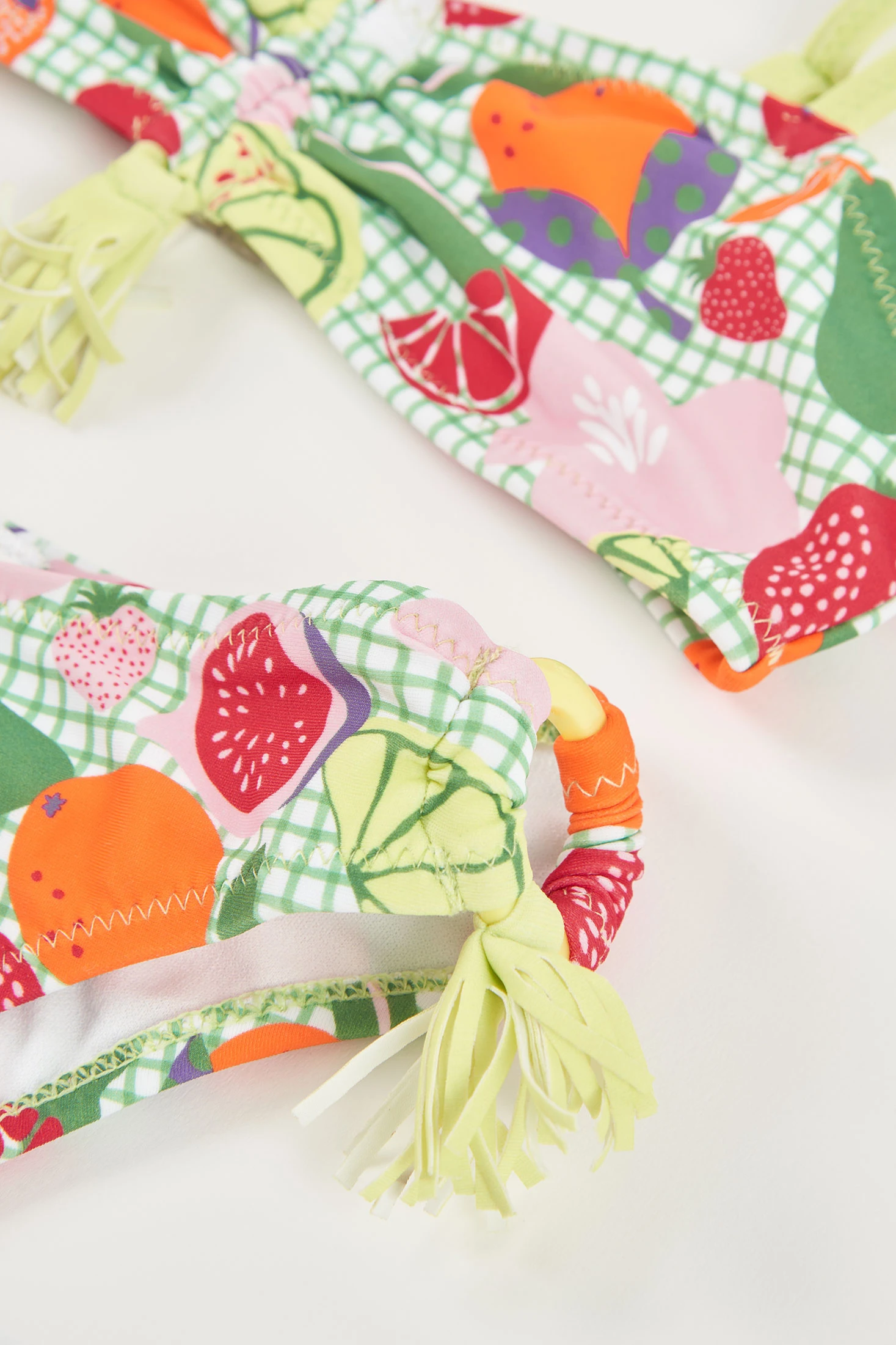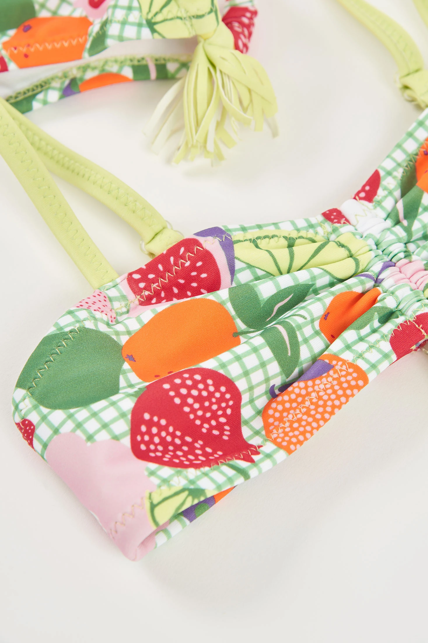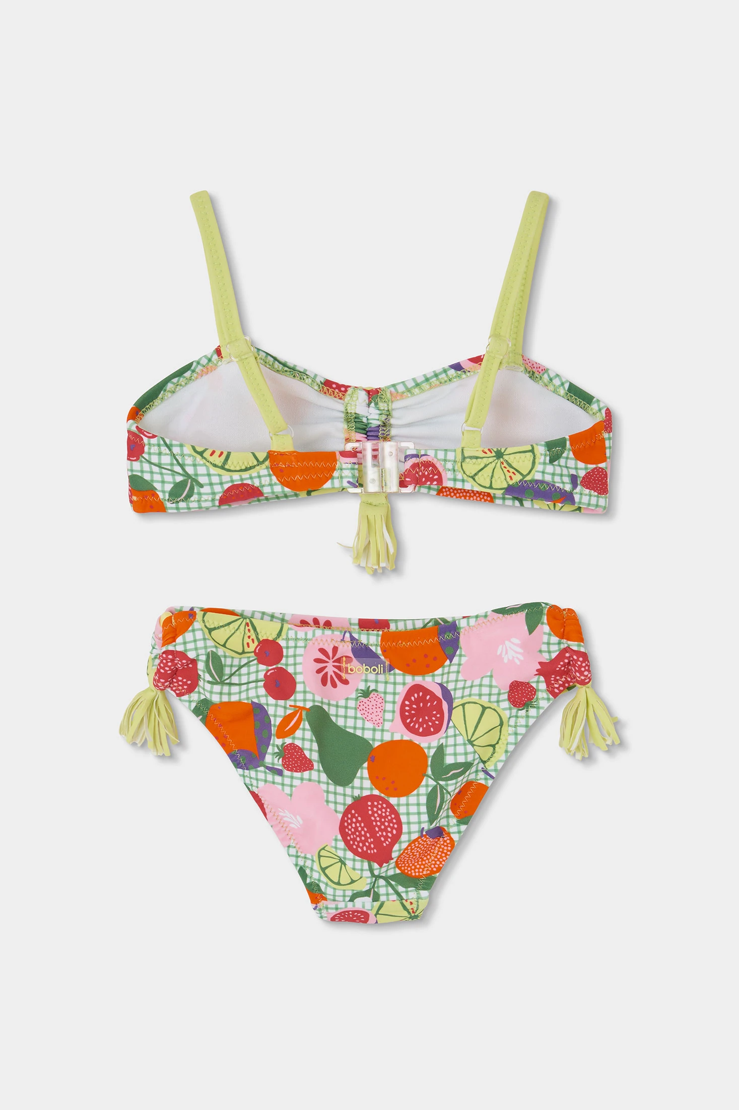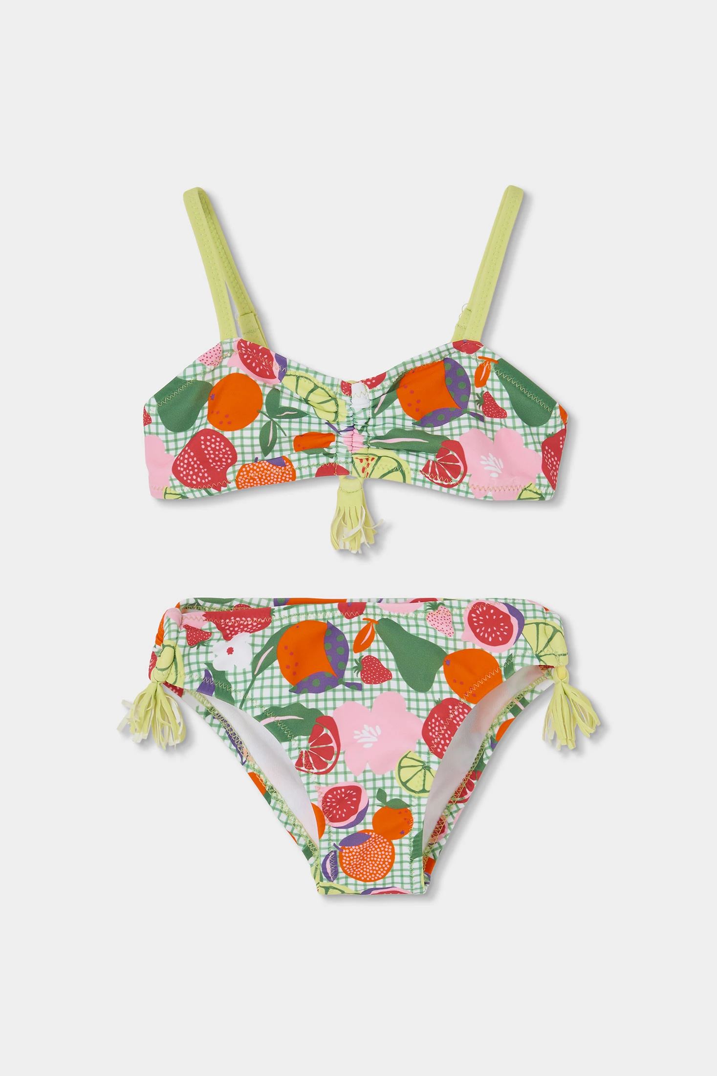 Bikini para niña con alegre estampado de frutas en colores vivos, con detalles en tonos verdes y rosados. Ideal para verano, su diseño incluye tirantes finos y nudos decorativos que añaden estilo. Fabricado en material con protección solar UPF50, resistente al agua, asegura comodidad y libertad de movimiento. Disponible desde 2 años hasta 14 años. Perfecto para días de playa o piscina, combina diversión y funcionalidad en una prenda llamativa y juvenil.