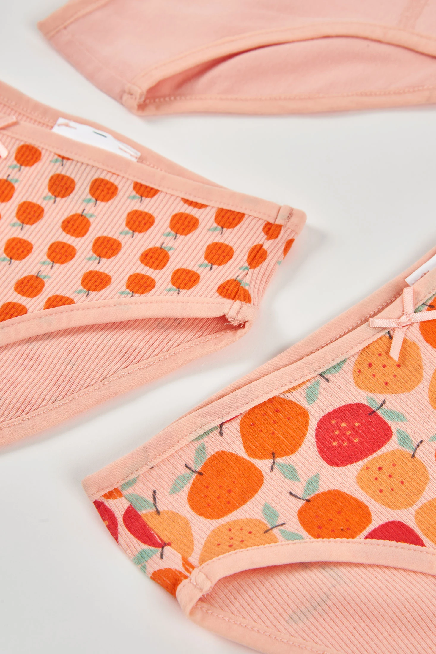 Pack de 3 braguitas de algodón para niña que combina confort y estilo para el día a día. Disponible en tallas desde 2 hasta 14 años. Presenta un diseño atractivo: una lisa con pequeño lazo decorativo y dos con estampados frutales en tonos naranja y rojo. El algodón suave asegura comodidad para pieles delicadas. Ideal para combinar con conjuntos casuales de diario, manteniendo siempre una sensación de frescura y suavidad. El color y diseño las hacen una opción divertida y práctica para la ropa interior de las pequeñas.