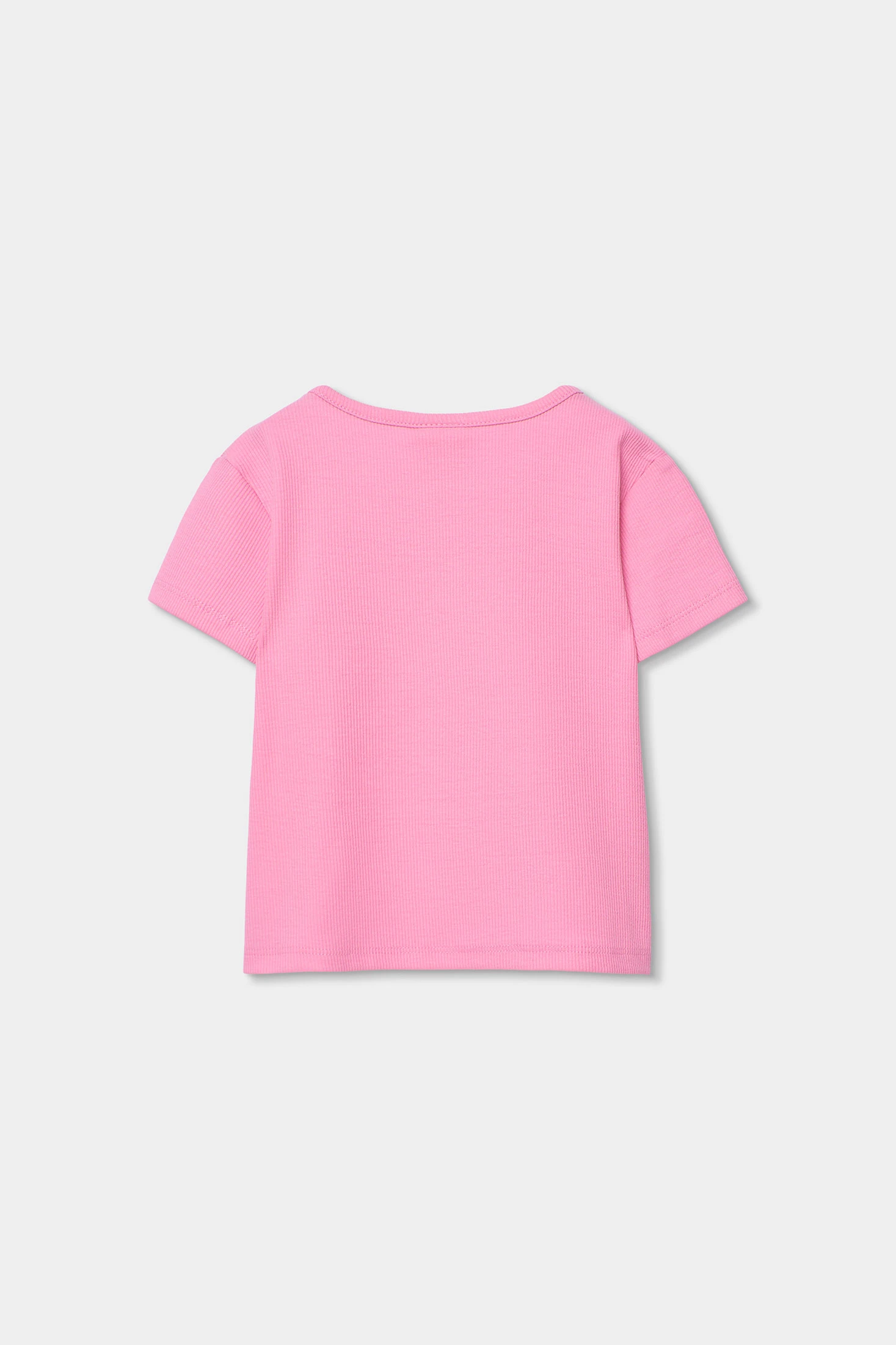 Camiseta de punto canalé rosa para niña perfecta para el día a día. Su diseño liso y color vibrante la hacen versátil y atractiva. El material suave garantiza comodidad durante todo el año. Ideal para niñas desde 12 meses hasta 14 años, adaptándose a su crecimiento. Con un corte clásico de cuello redondo y mangas cortas, es perfecta para combinar con faldas o pantalones en climas cálidos. Prenda esencial en el guardarropa, aportando un toque de frescura y estilo casual.